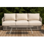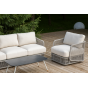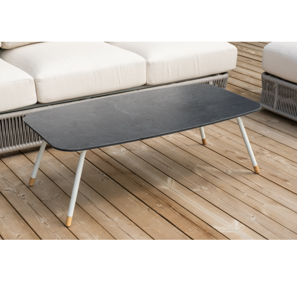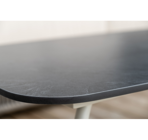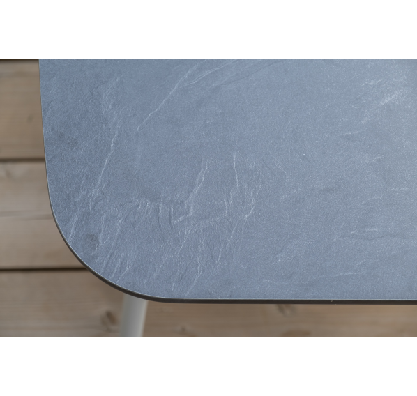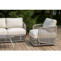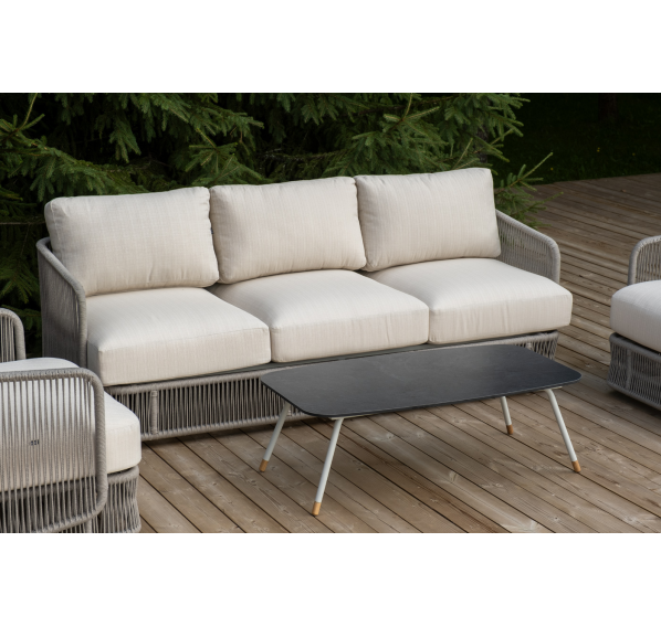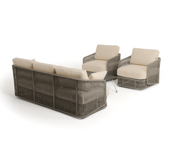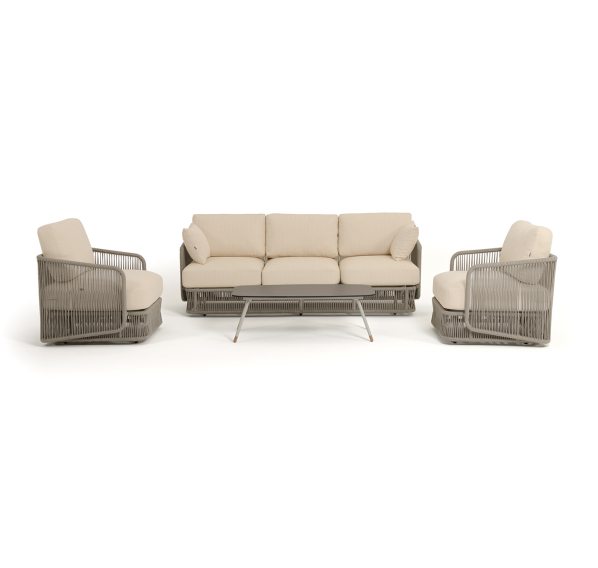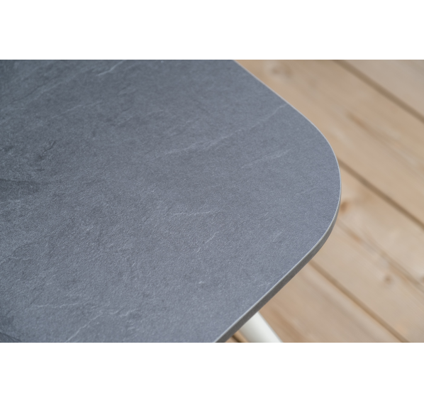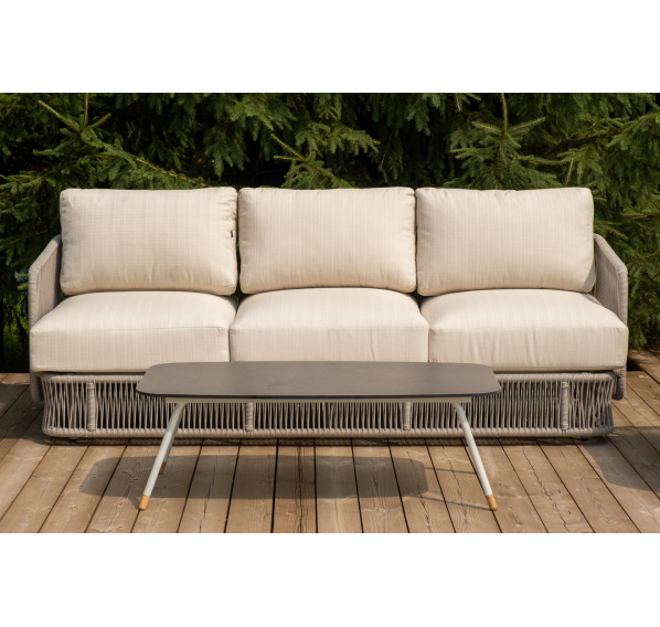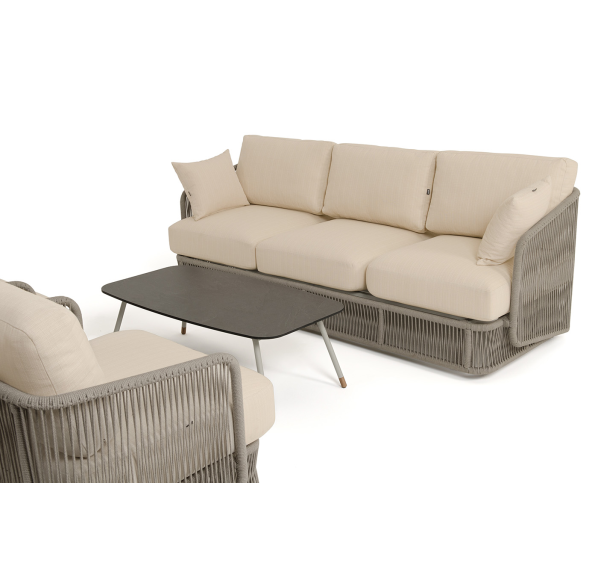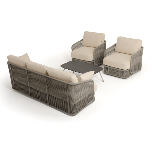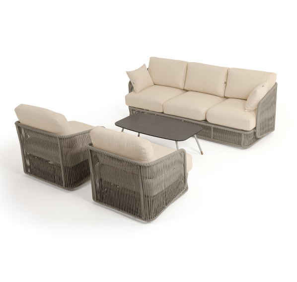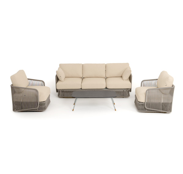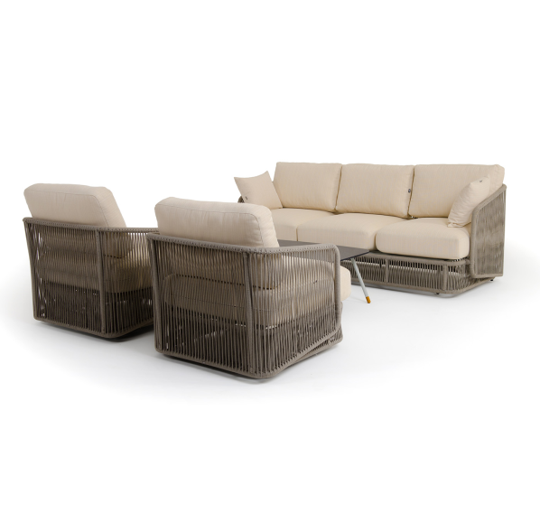 Каркас уличной мебели выполнен из износостойкого алюминия. Его дополняет бежевая ручная оплетка, изготовленная на основе эластичных синтетических лент из полиэфирных волокон высокой прочности (роупа).