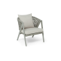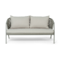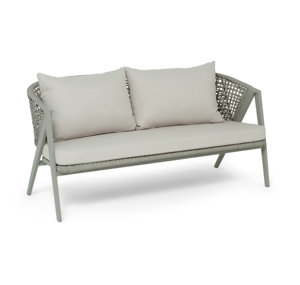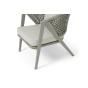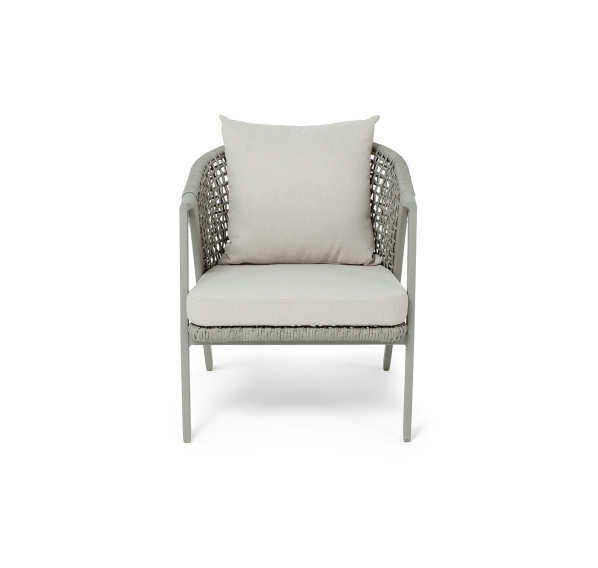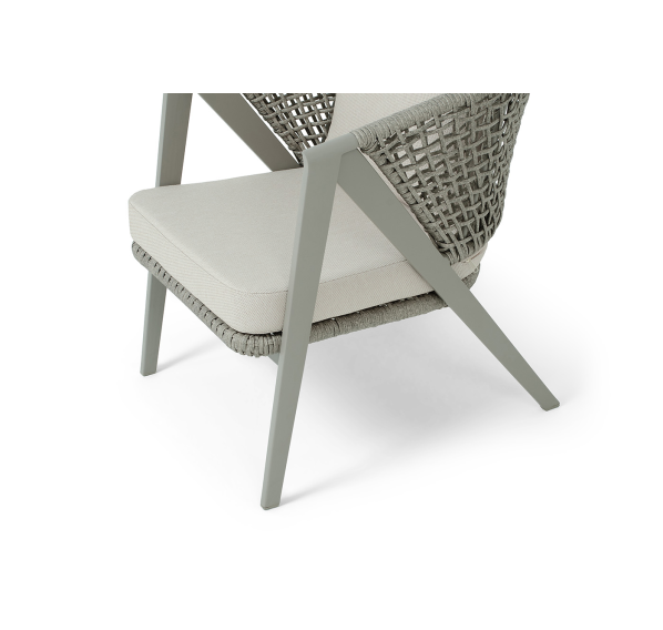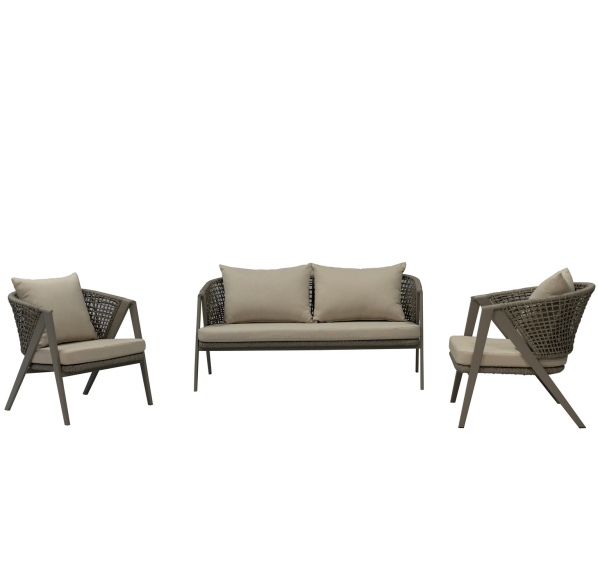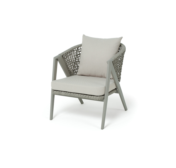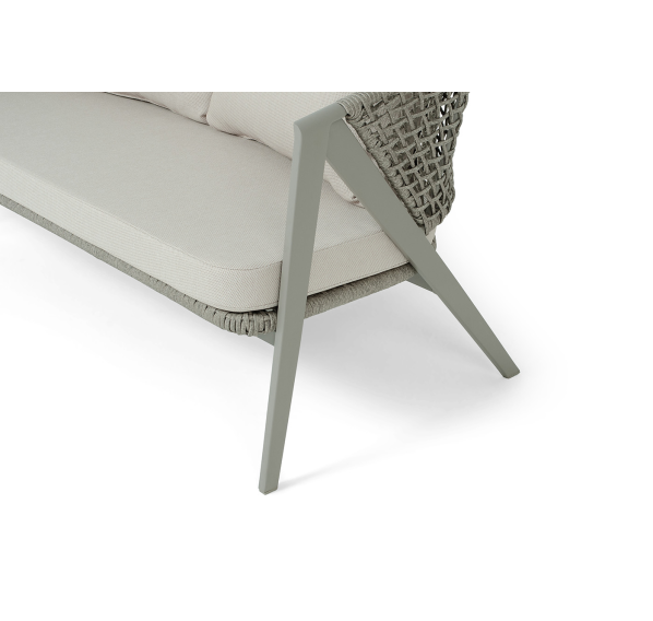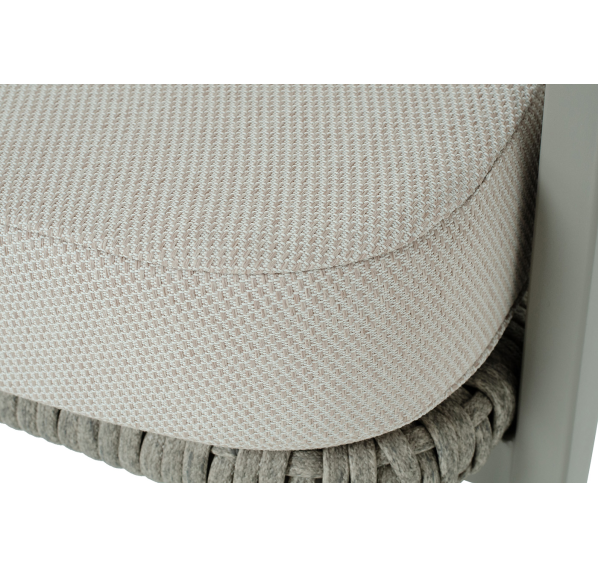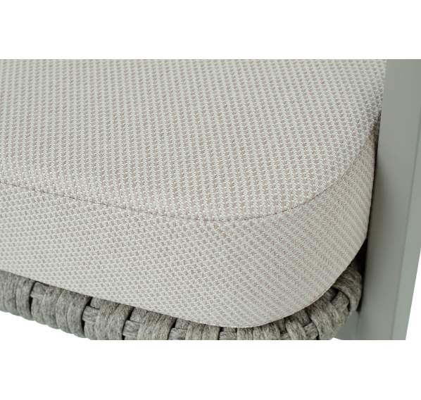 Диван и кресла изготовлены из алюминиевого каркаса, оплетенного вручную эластичными синтетическими лентами из высокопрочных полиэфирных волокон. Роуп является гипоаллергенным, прочным, износостойким и устойчивым к ультрафиолету. Цвет каркаса и оплетки – серый. На ножках стула идут черные пластиковые наконечники (заглушки).