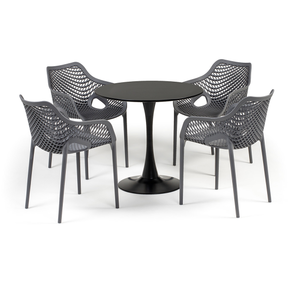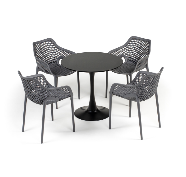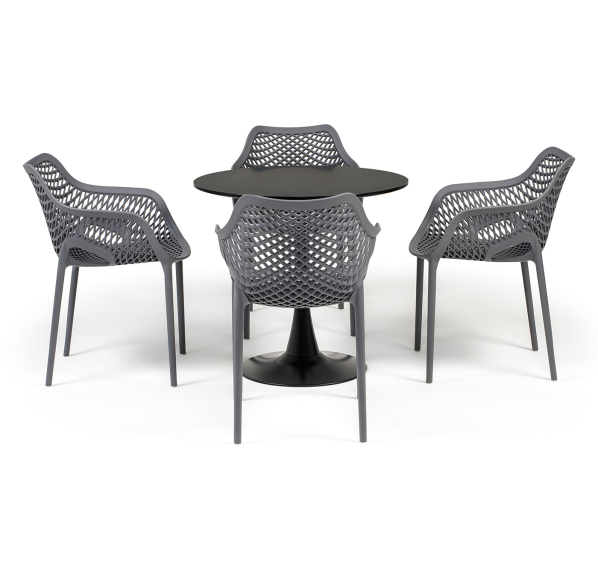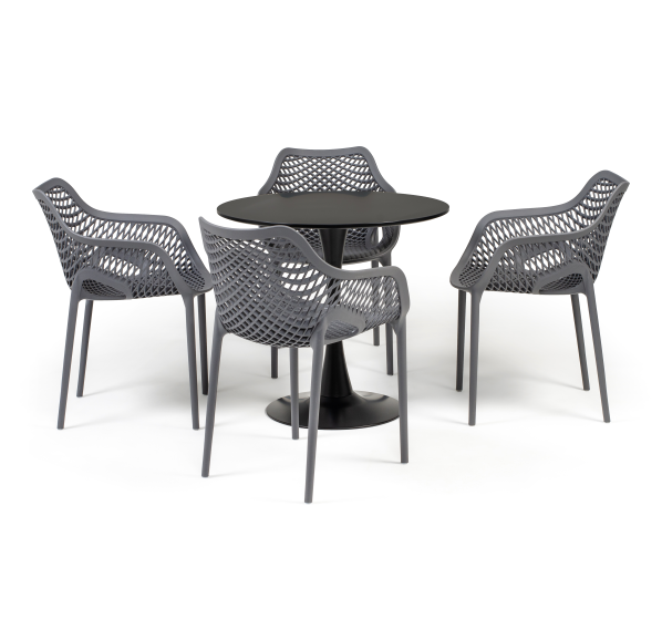 Стулья изготовлены из полипропилена, прочного и стойкого пластика, устойчивого к УФ-излучению, благодаря этому стул сохраняет свой первоначальный вид и не выцветает на солнце даже несмотря на активную эксплуатацию. Цвет - темно-серый.
