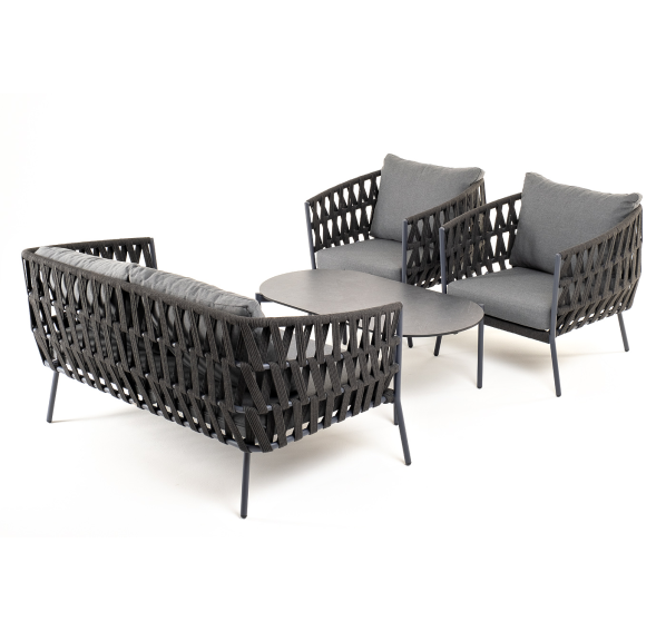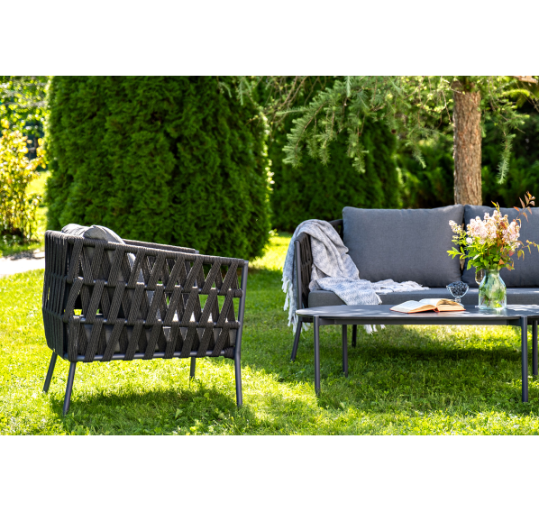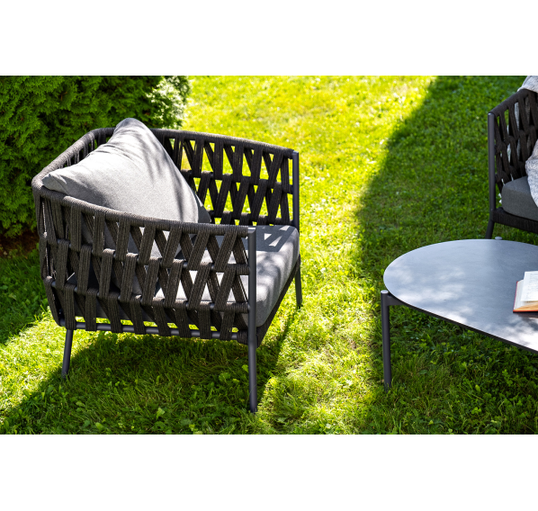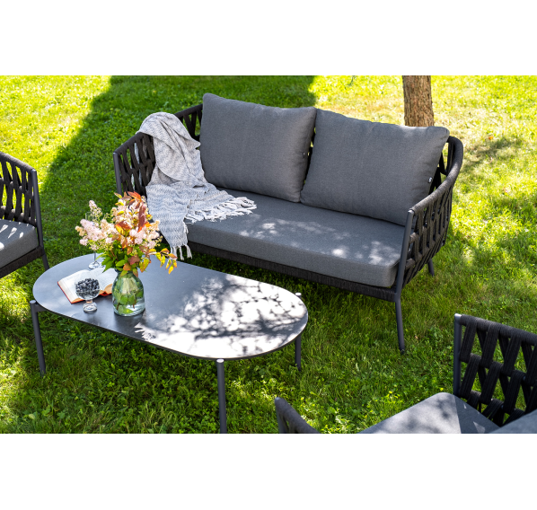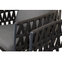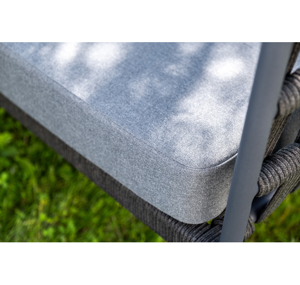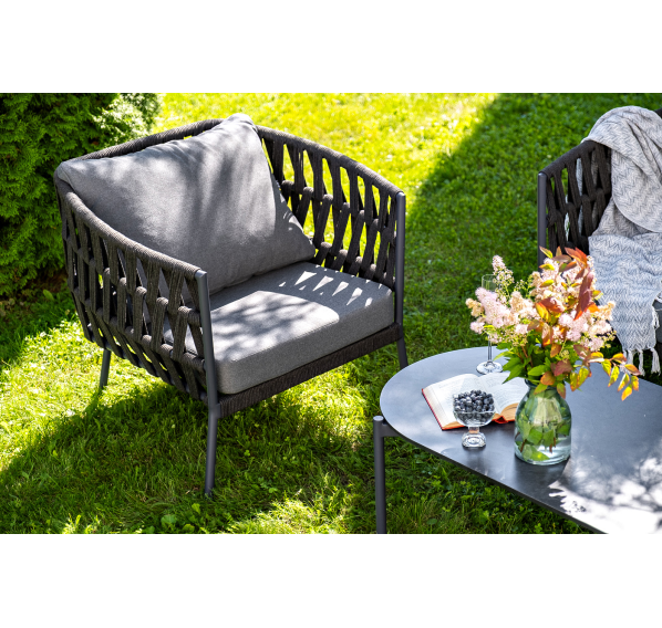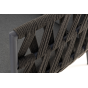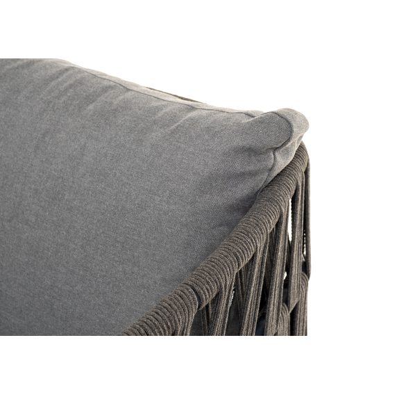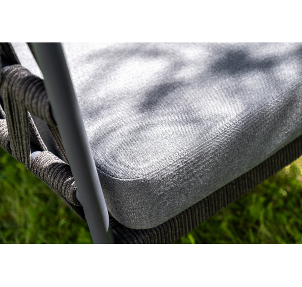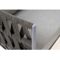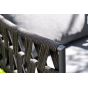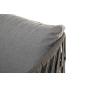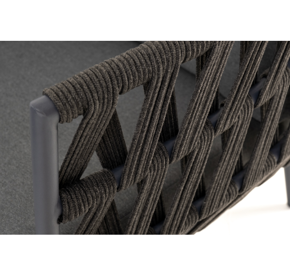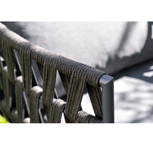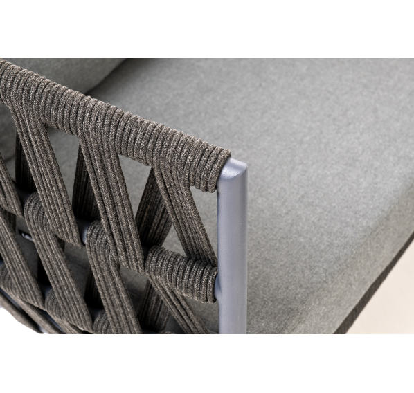 Каркас уличной мебели выполнен из износостойкого алюминия. Его дополняет темно-серая ручная оплетка, изготовленная на основе эластичных синтетических лент из полиэфирных волокон высокой прочности (роупа).