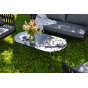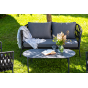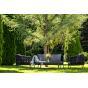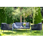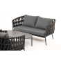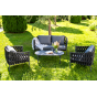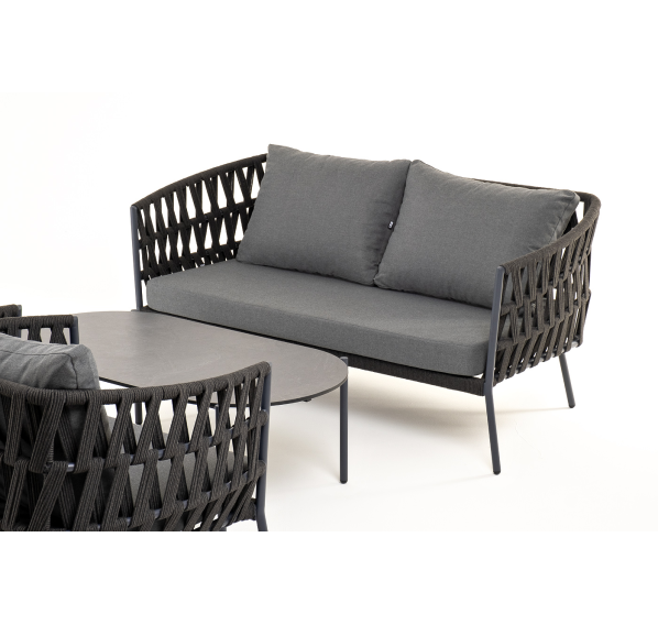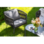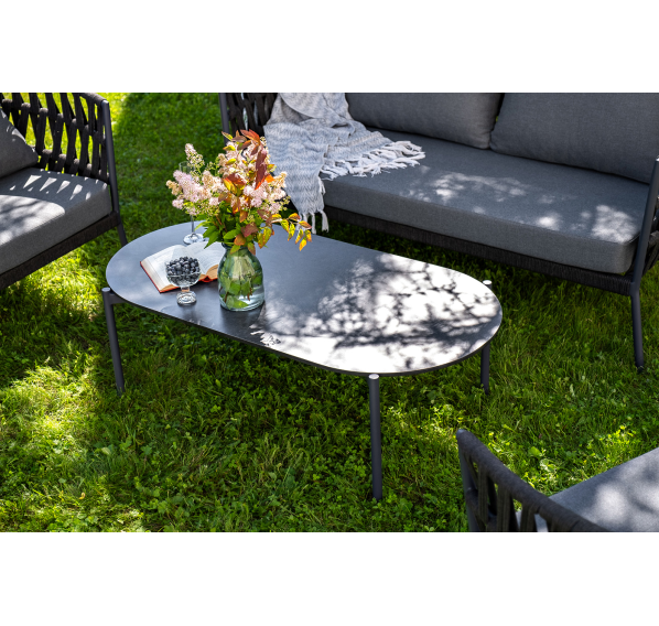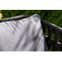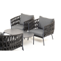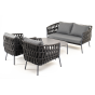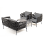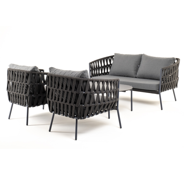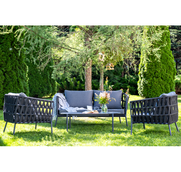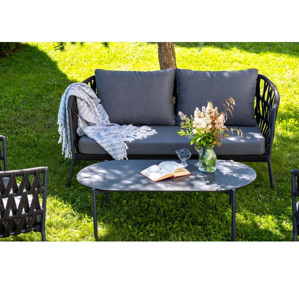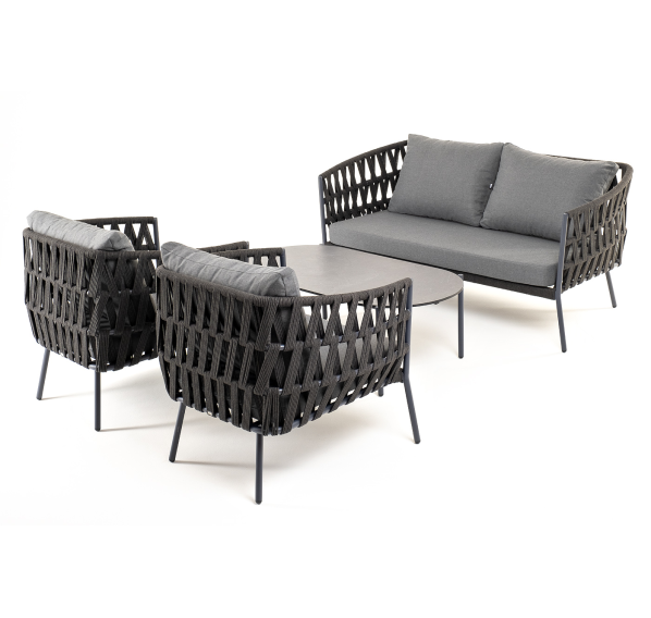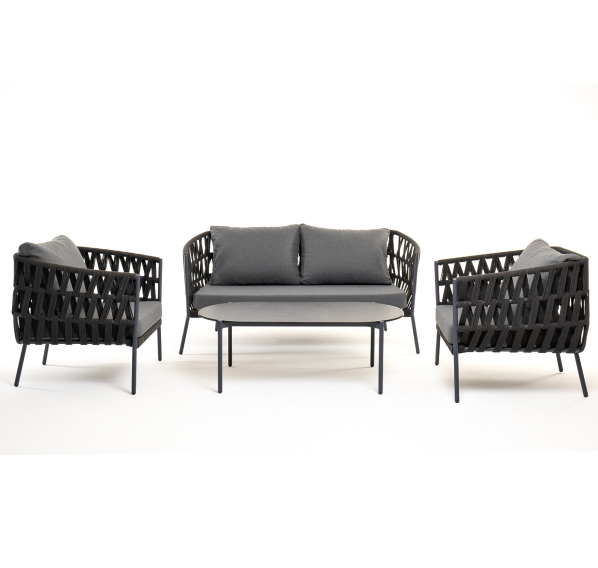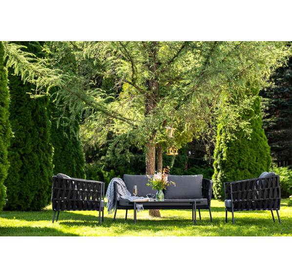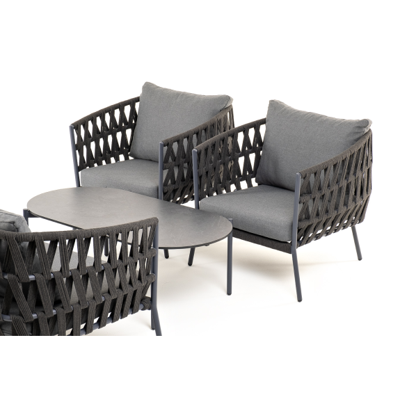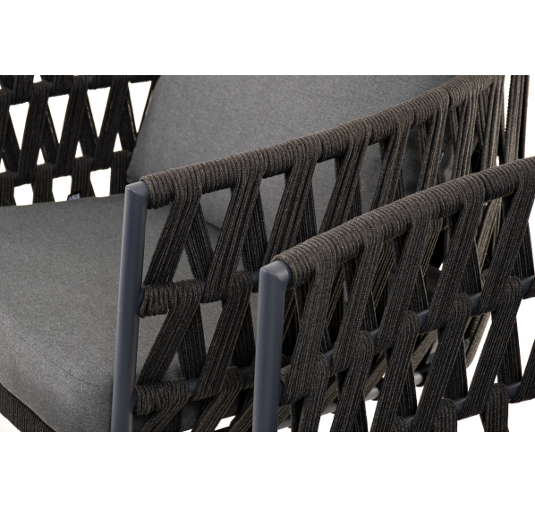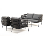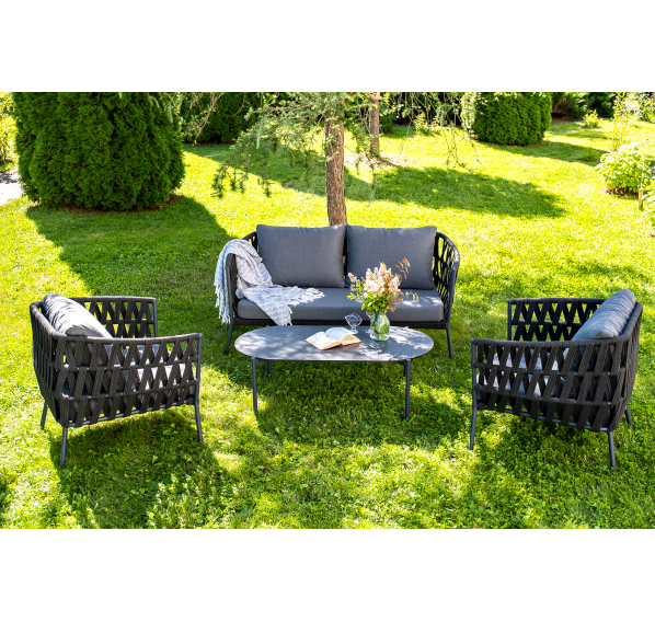 Каркас уличной мебели выполнен из износостойкого алюминия. Его дополняет темно-серая ручная оплетка, изготовленная на основе эластичных синтетических лент из полиэфирных волокон высокой прочности (роупа).