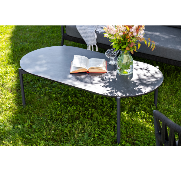 Каркас столика изготовлен из алюминия, окрашенного в элегантный и современный темно-серый цвет (RAL 7024). Алюминий является легким и прочным материалом, что обеспечивает долговечность и надежность изделия. Столешница изготовлена из прочного и устойчивого к механическим воздействиям компакт-пластика HPL в цвете «серый гранит».