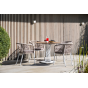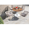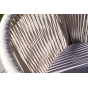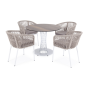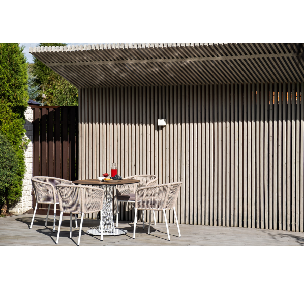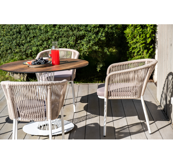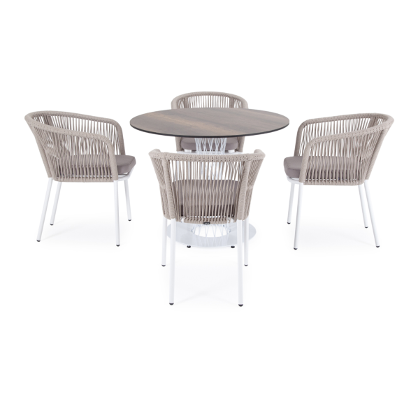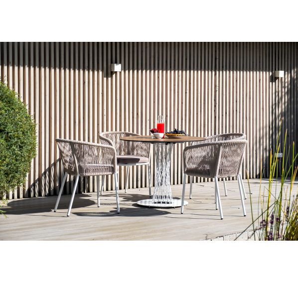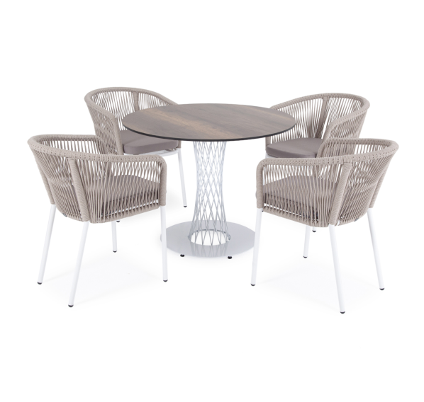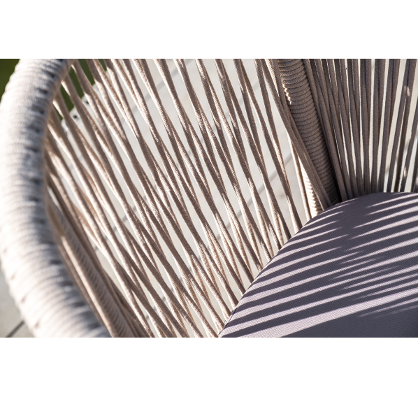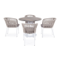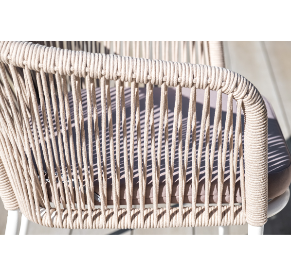4 кресла из коллекции «Марсель», выполненных из алюминиевого каркаса и ручной оплетки роупом. Это эластичные синтетические ленты из высокопрочных полиэфирных волокон, представлены в бежевом цвете.