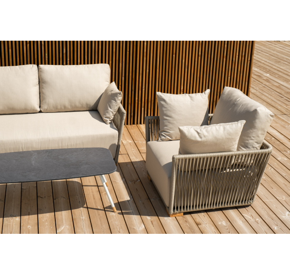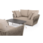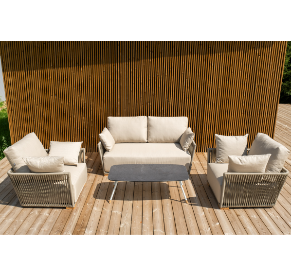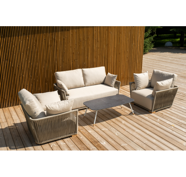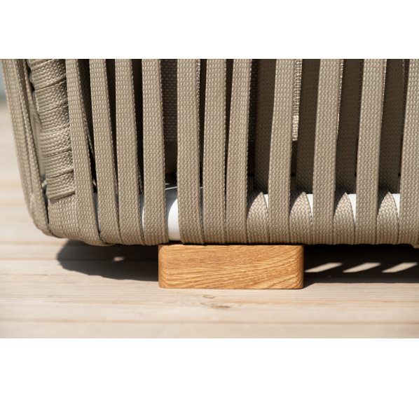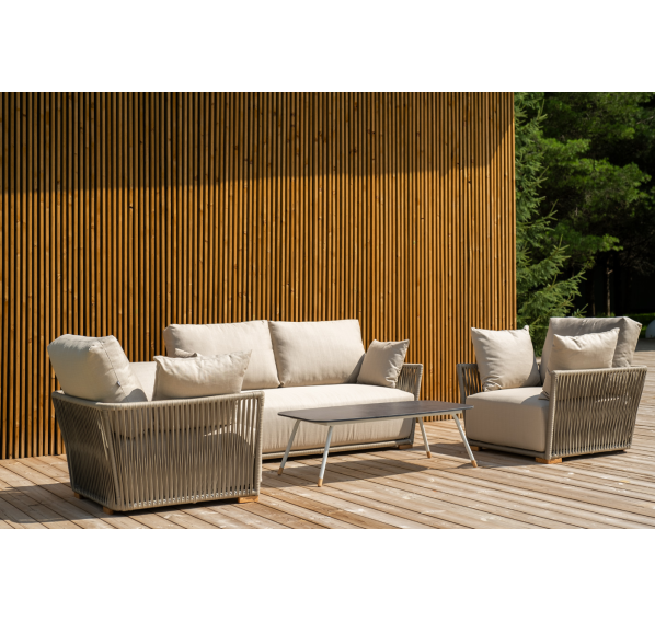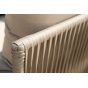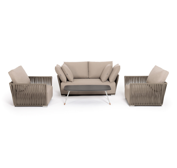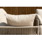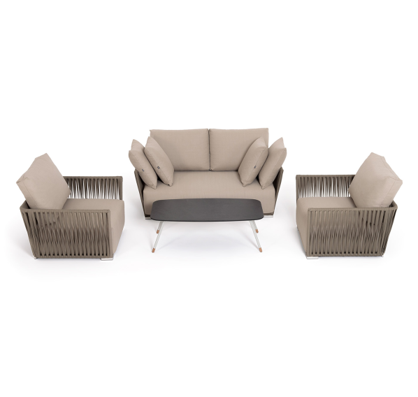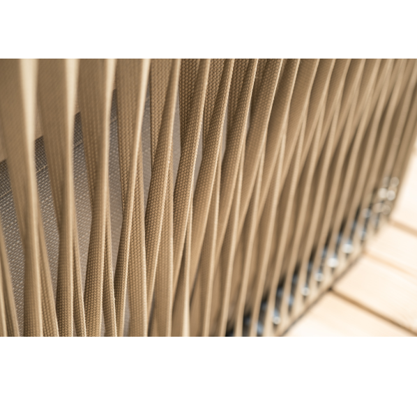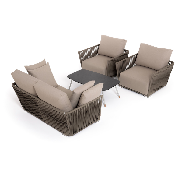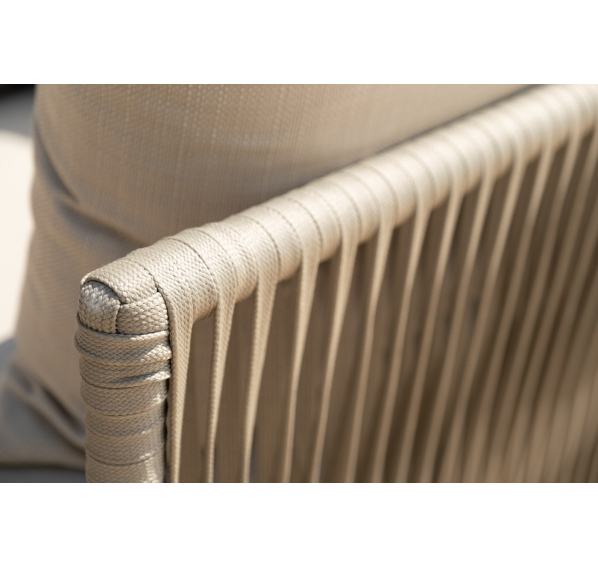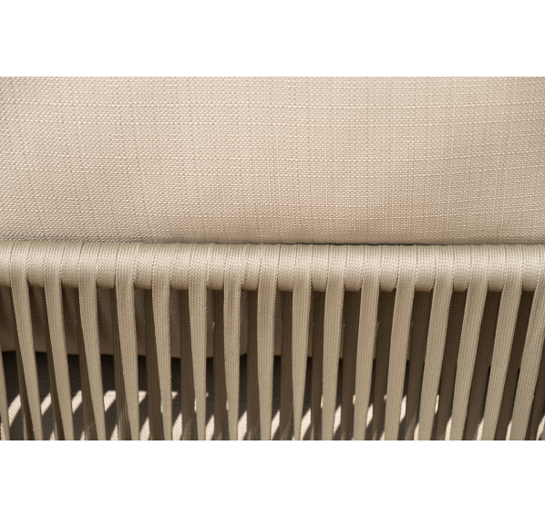 Каркас уличной мебели выполнен из износостойкого алюминия. Его дополняет серо-коричневая ручная оплетка, изготовленная на основе эластичных синтетических лент из полиэфирных волокон высокой прочности (роупа).