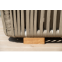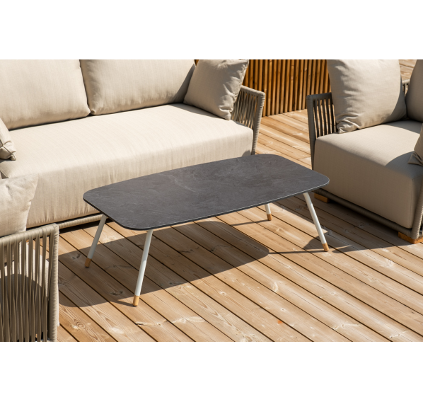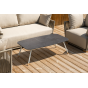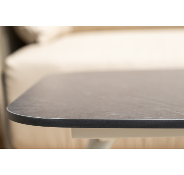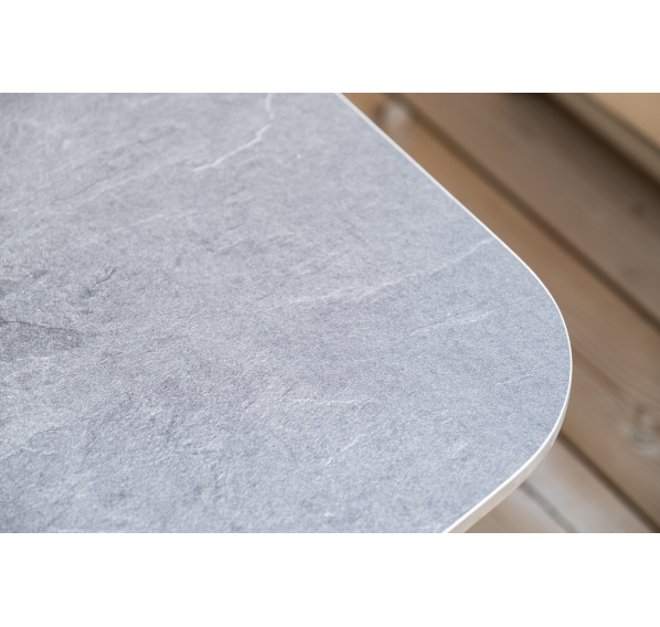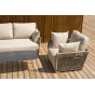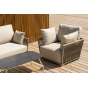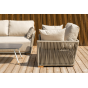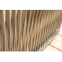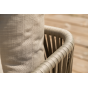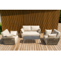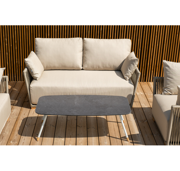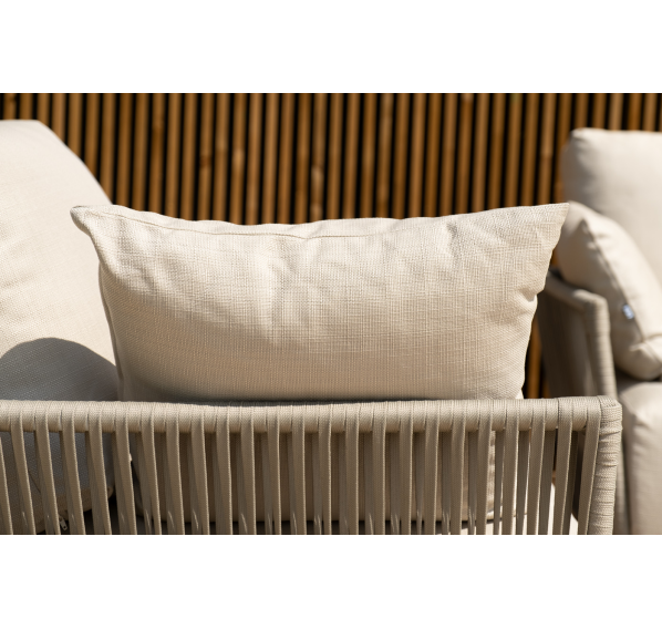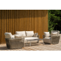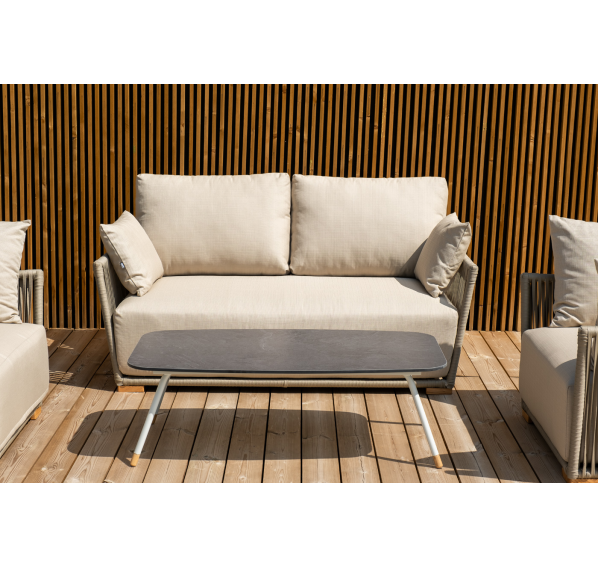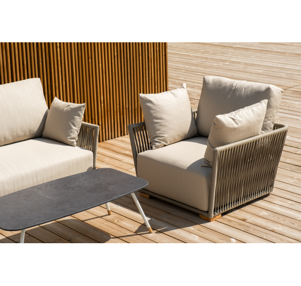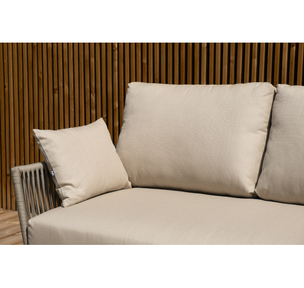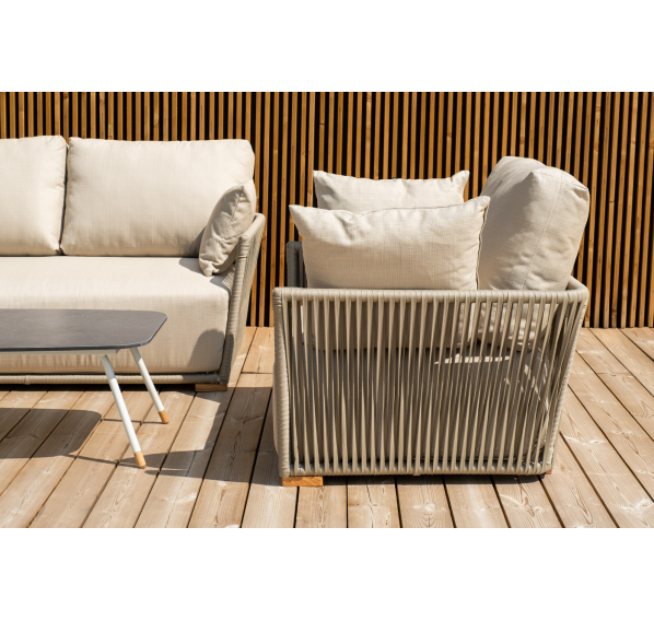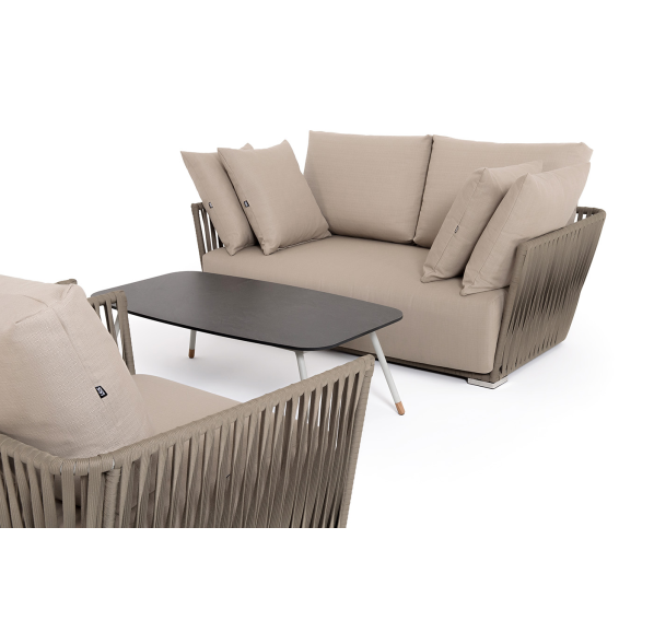 Каркас уличной мебели выполнен из износостойкого алюминия. Его дополняет серо-коричневая ручная оплетка, изготовленная на основе эластичных синтетических лент из полиэфирных волокон высокой прочности (роупа).