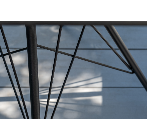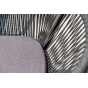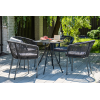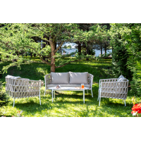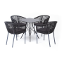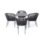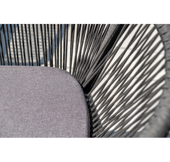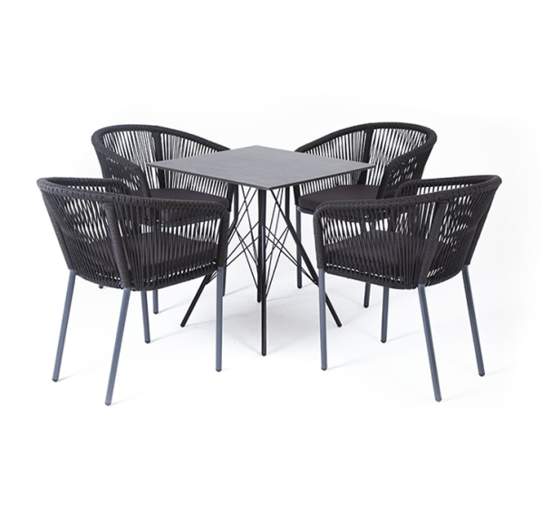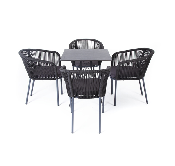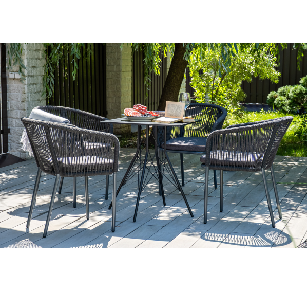 4 кресла из коллекции «Марсель», выполненных из алюминиевого каркаса и ручной оплетки роупом. Это эластичные синтетические ленты из высокопрочных полиэфирных волокон, представлены в темно-сером цвете.