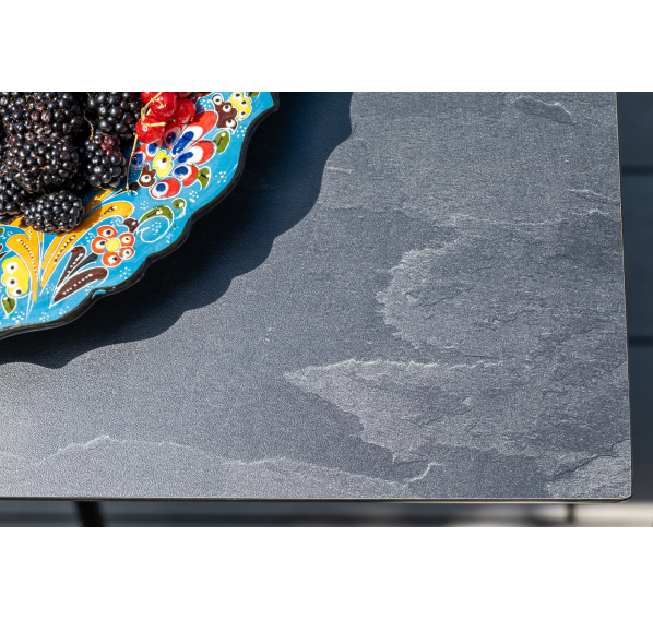 Состоит из квадратного обеденного стола «Конте» со столешницей, размером 70×70 см. Материал столешницы выполнен из высококачественного монолитного компакт-пластика HPL в цвете «серый гранит». Подстолье - нержавеющая сталь черного цвета.