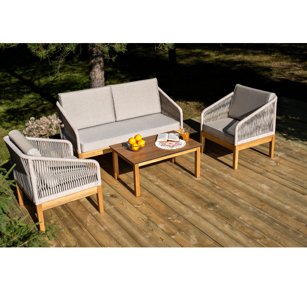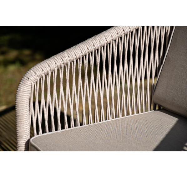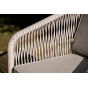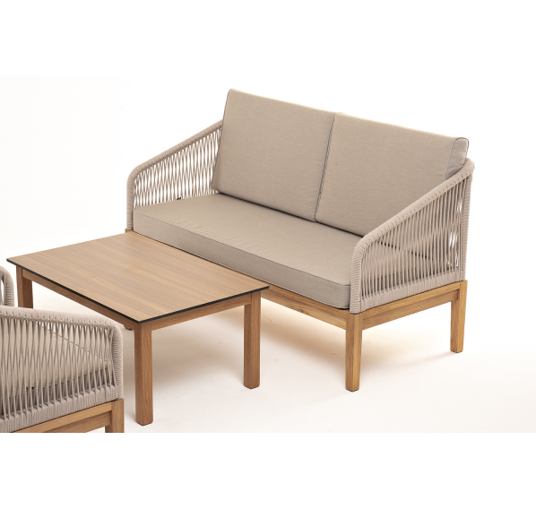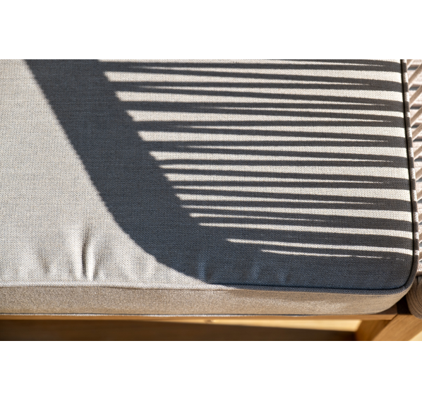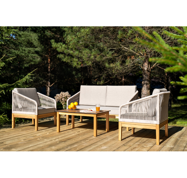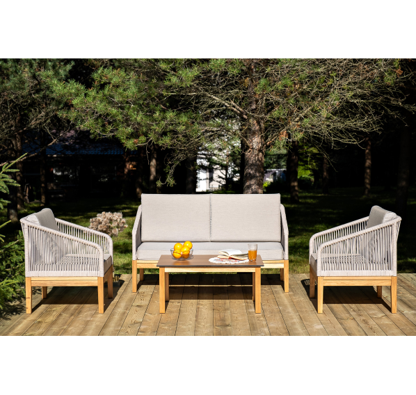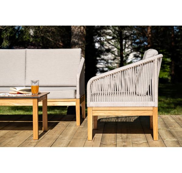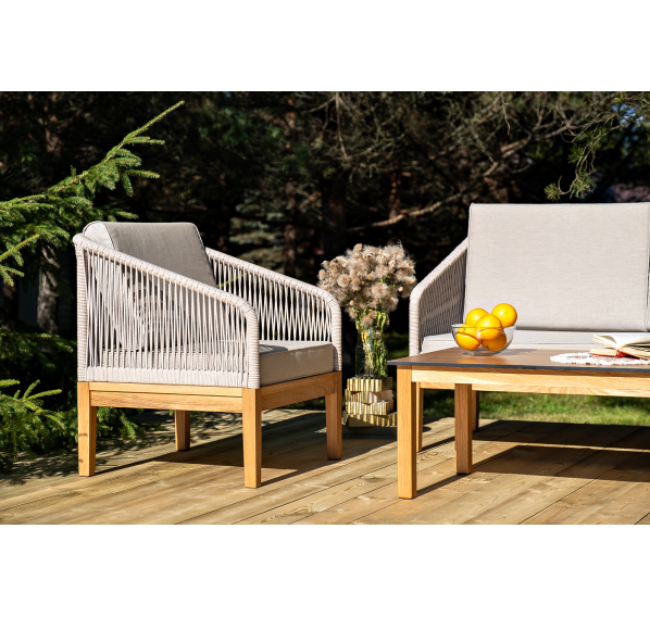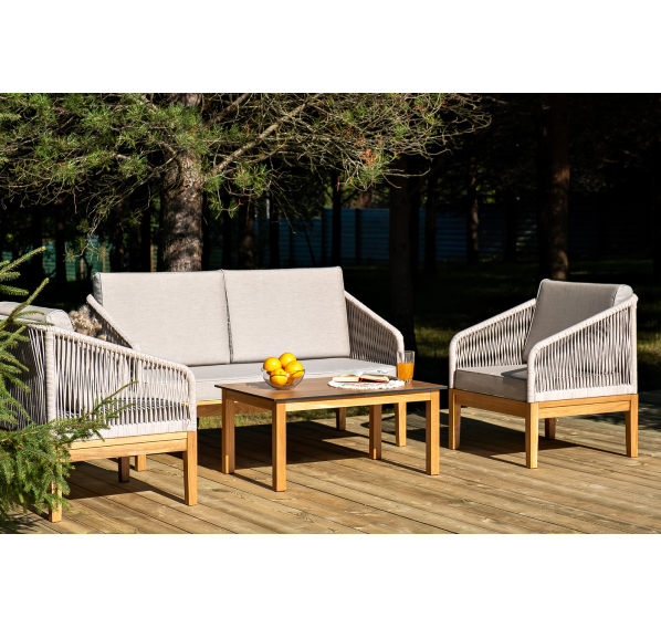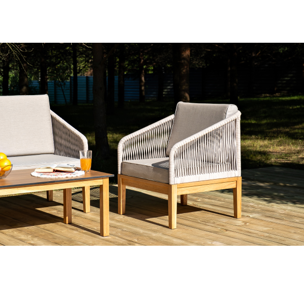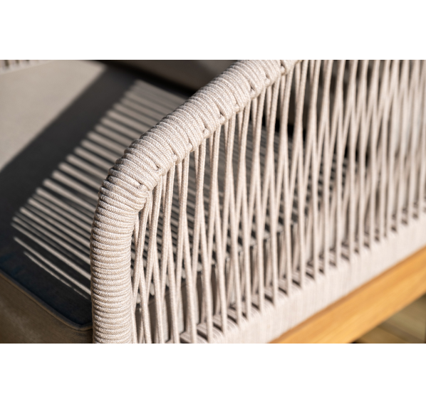 Каркас уличной мебели выполнен из дуба. Его дополняет бежевая оплетка, изготовленная на основе эластичных синтетических лент из полиэфирных волокон высокой прочности.