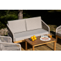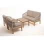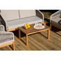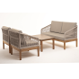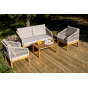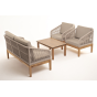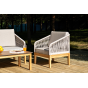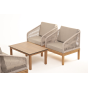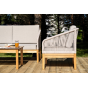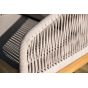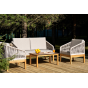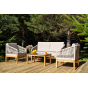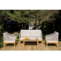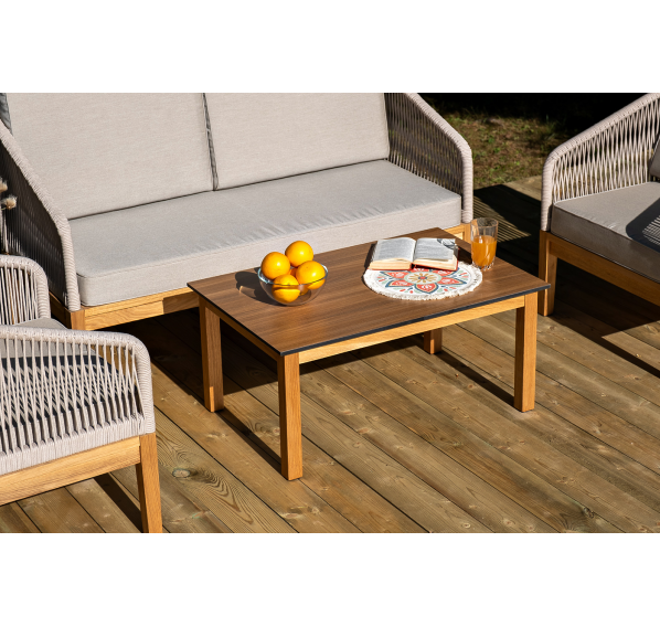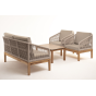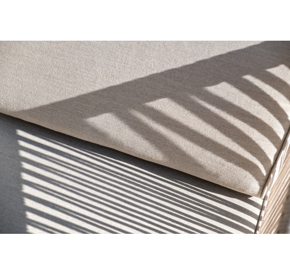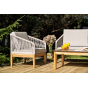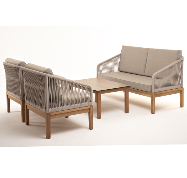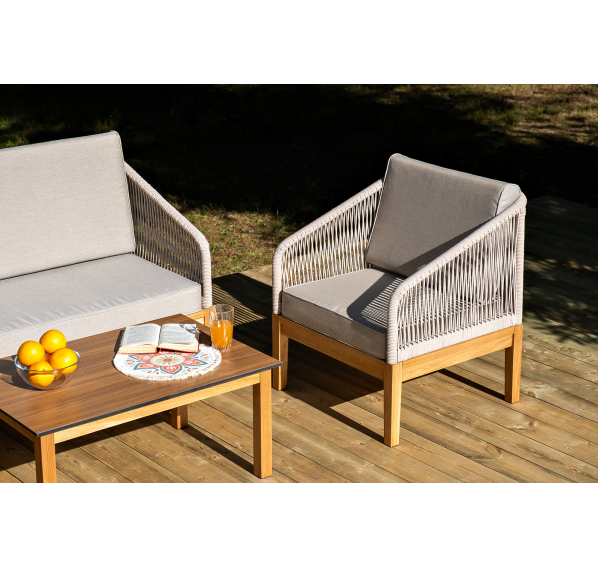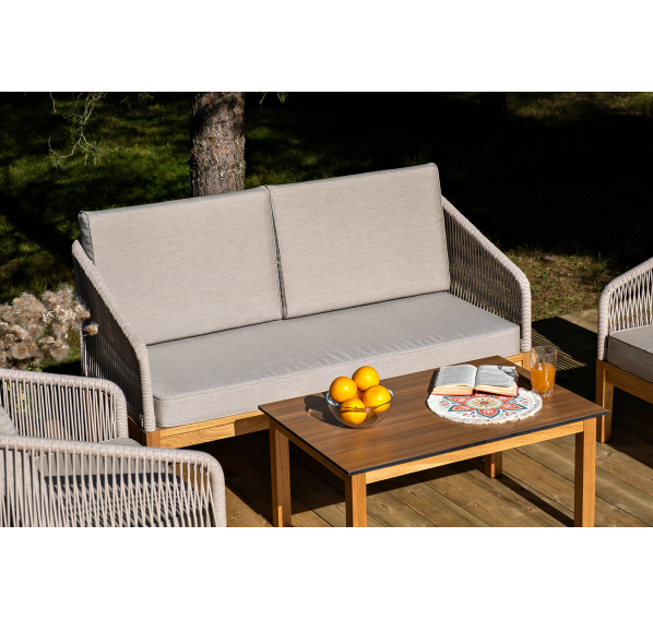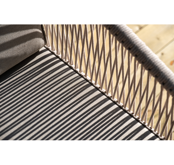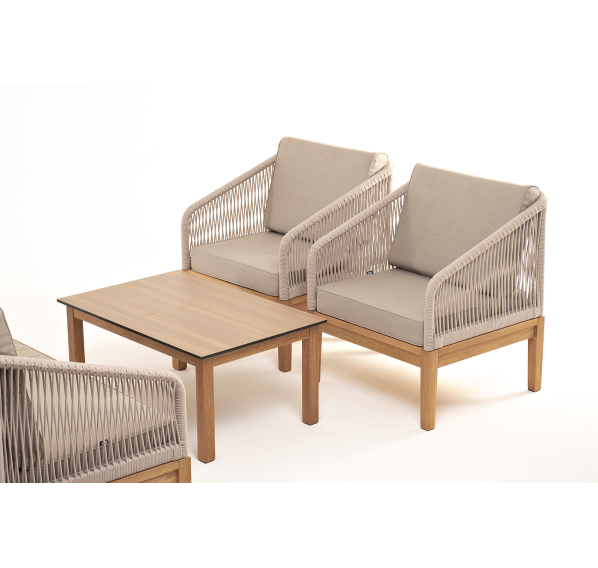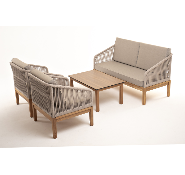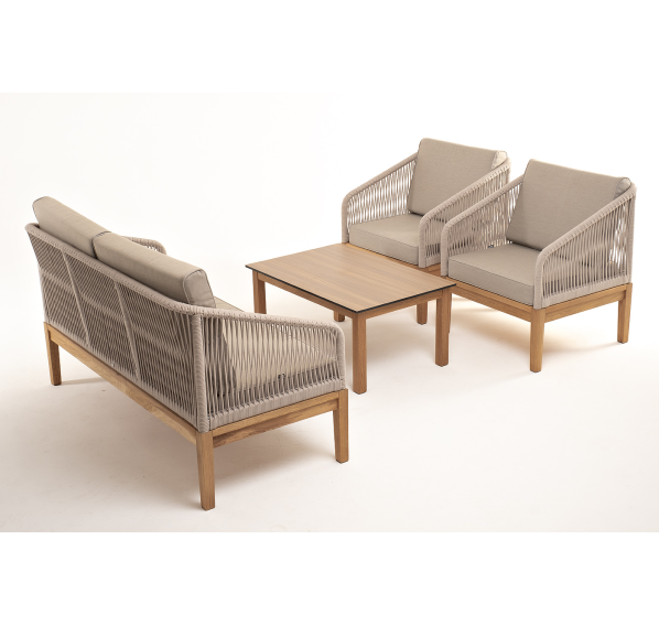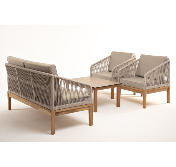 Каркас уличной мебели выполнен из дуба. Его дополняет бежевая оплетка, изготовленная на основе эластичных синтетических лент из полиэфирных волокон высокой прочности.