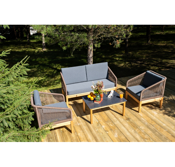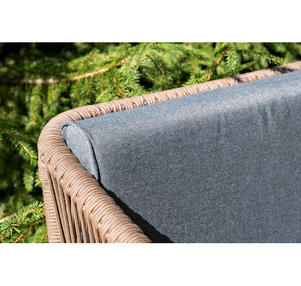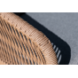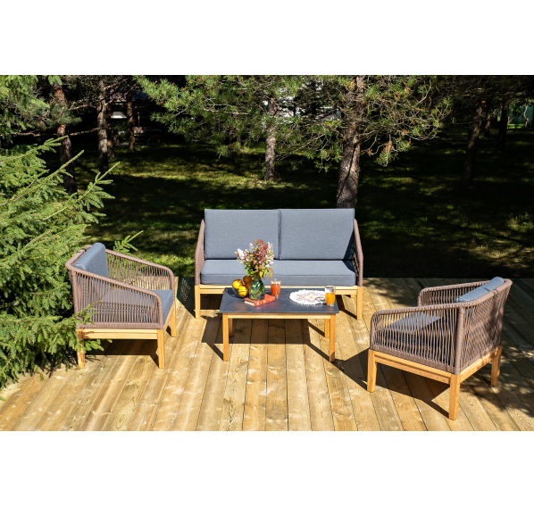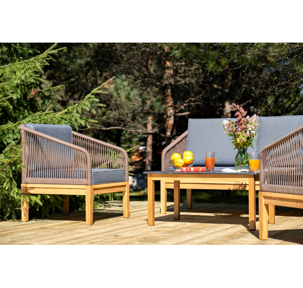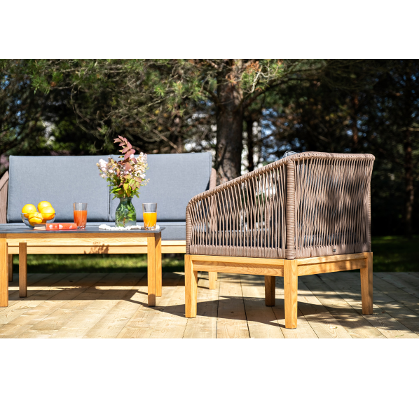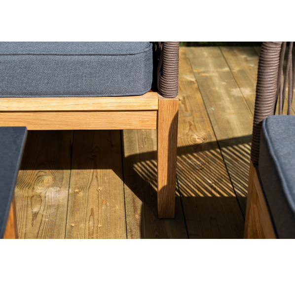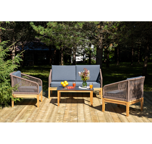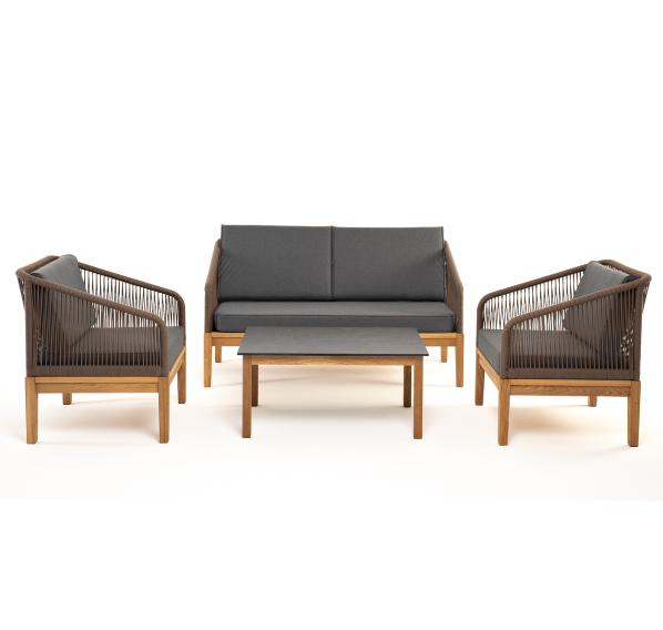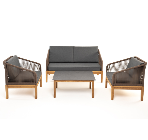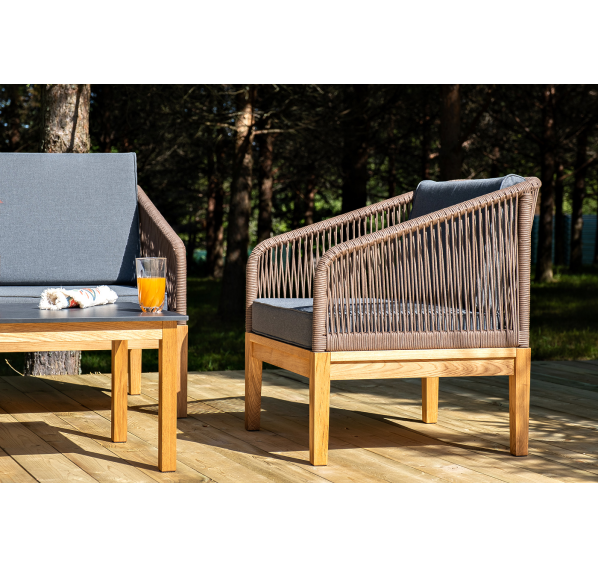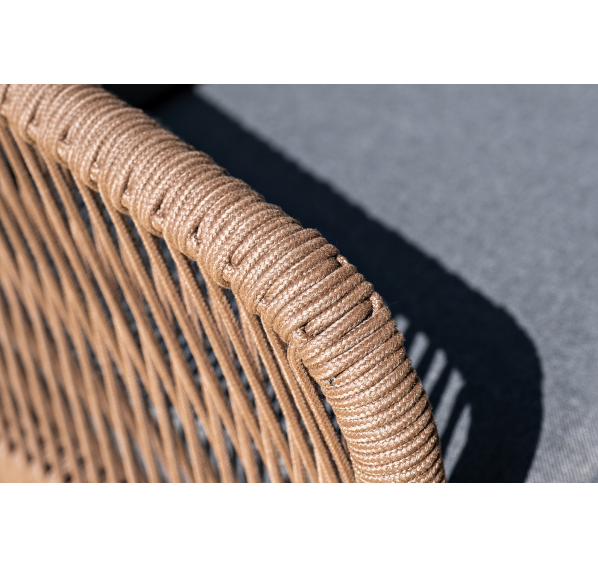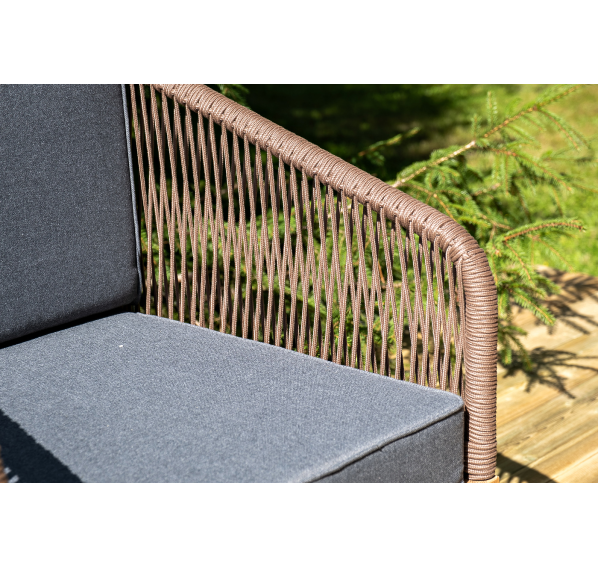 Каркас уличной мебели выполнен из дуба. Его дополняет коричневая оплетка, изготовленная на основе эластичных синтетических лент из полиэфирных волокон высокой прочности.