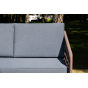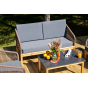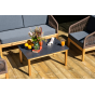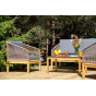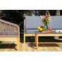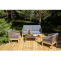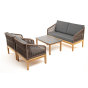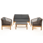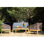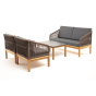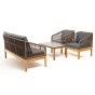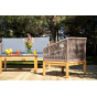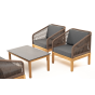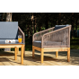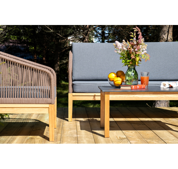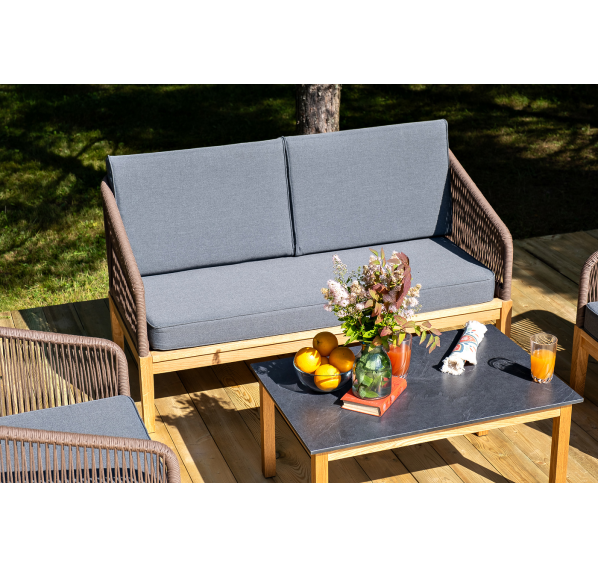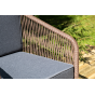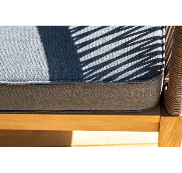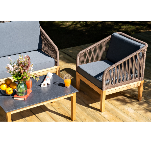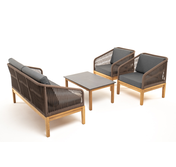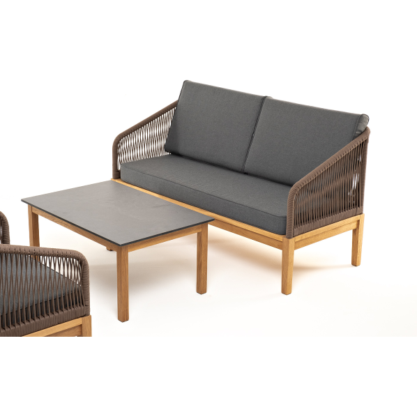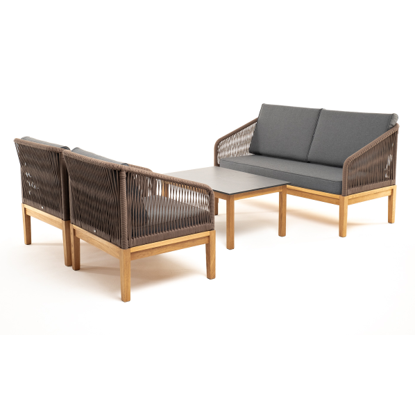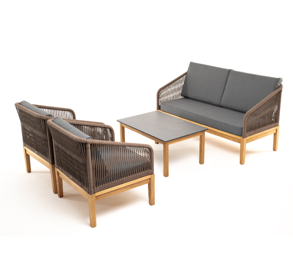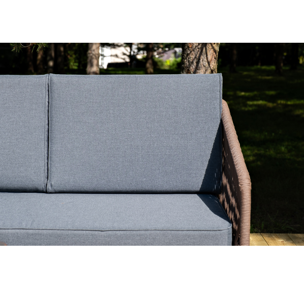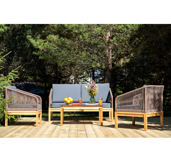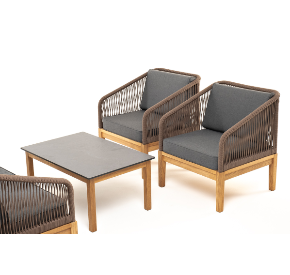 Каркас уличной мебели выполнен из дуба. Его дополняет коричневая оплетка, изготовленная на основе эластичных синтетических лент из полиэфирных волокон высокой прочности.