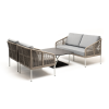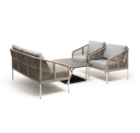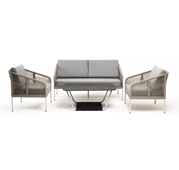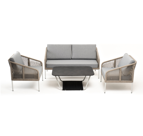 Каркас уличной мебели выполнен из алюминия. Его дополняет оплетка цвета серый меланж, изготовленная на основе эластичных синтетических лент из полиэфирных волокон высокой прочности.