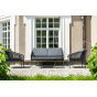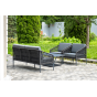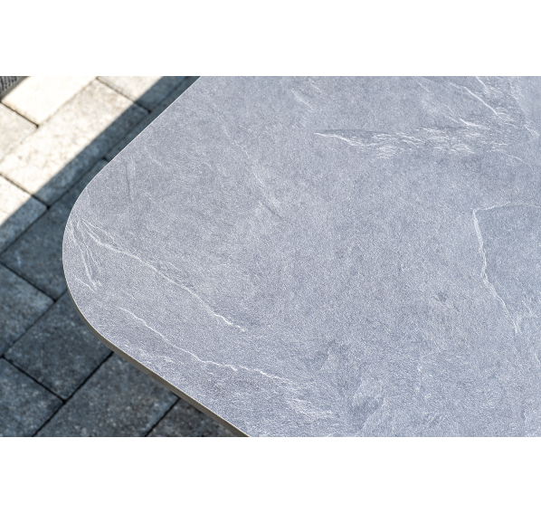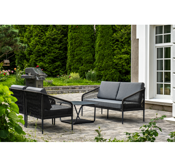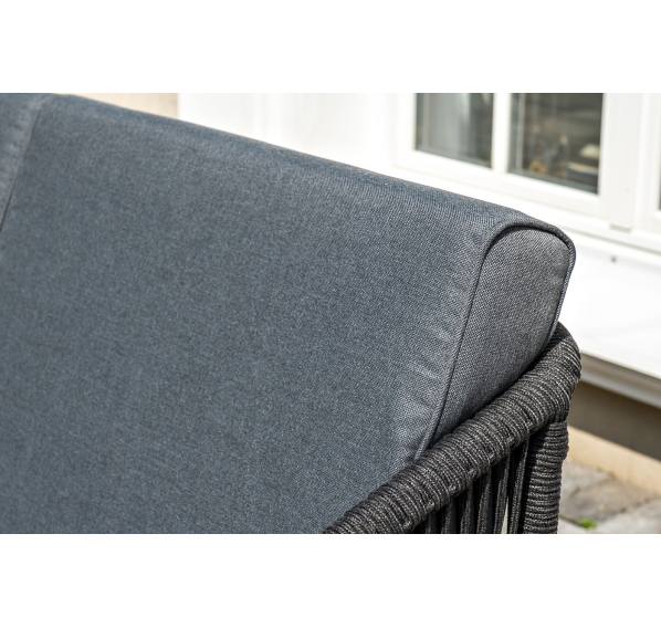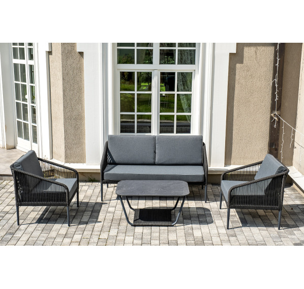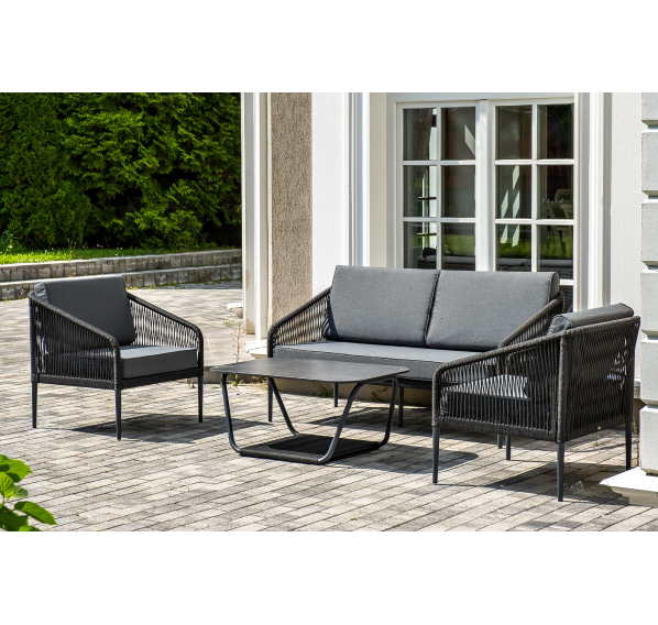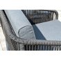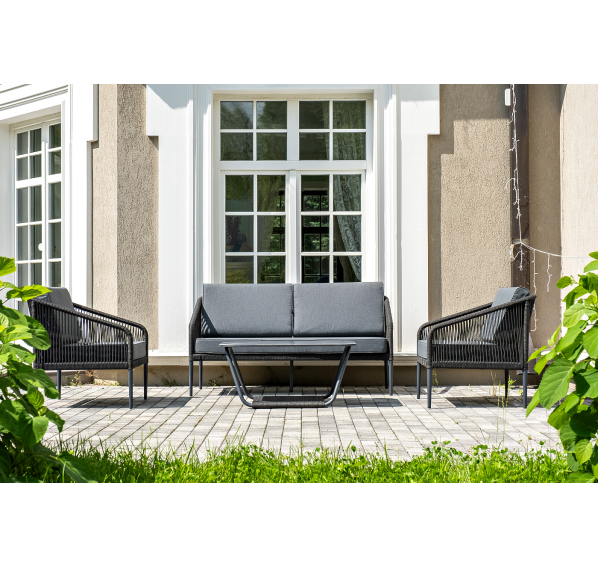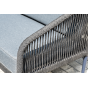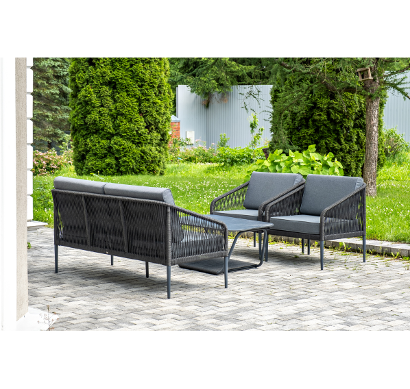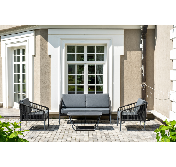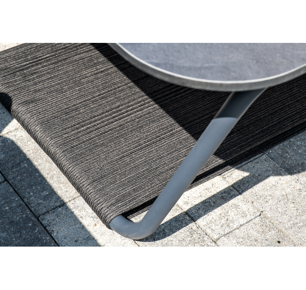 Каркас уличной мебели выполнен из износостойкого алюминия. Его дополняет серая ручная оплетка, изготовленная на основе эластичных синтетических лент из полиэфирных волокон высокой прочности.