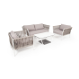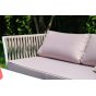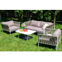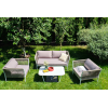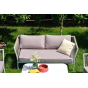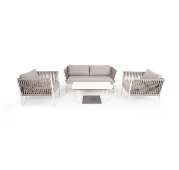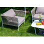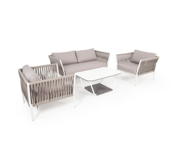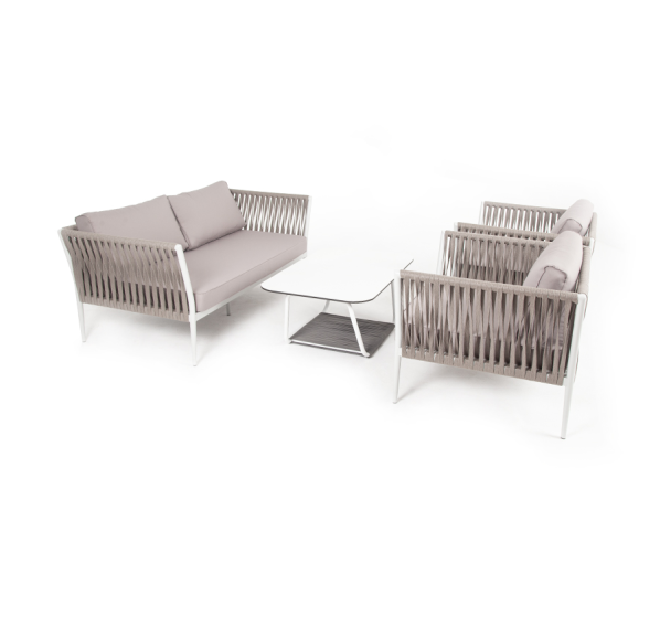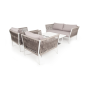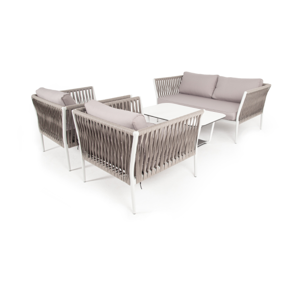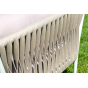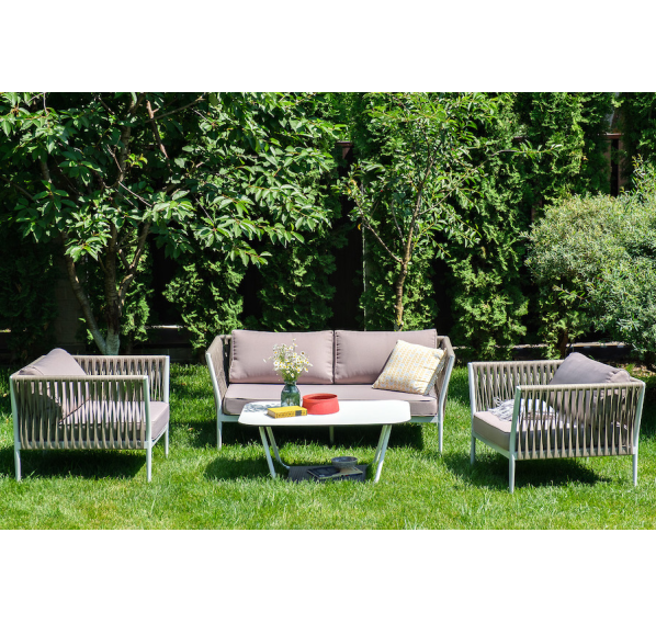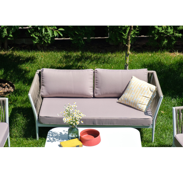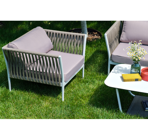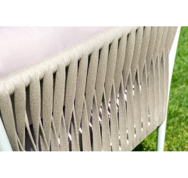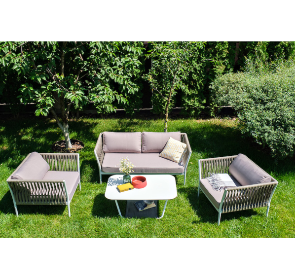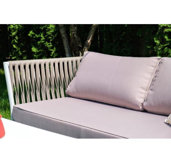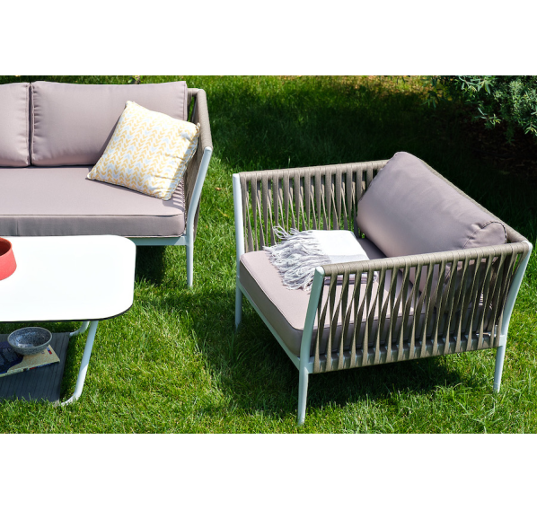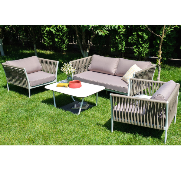 Диван и кресла изготовлены их алюминиевого прочного каркаса, оплетенного ручным способом роупом серо-коричневого цвета. Это эластичные ленты из полиэфирных волокон высокого качества.