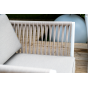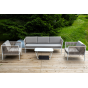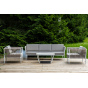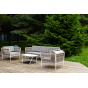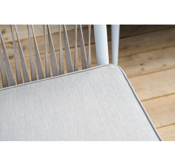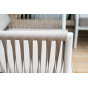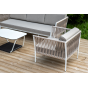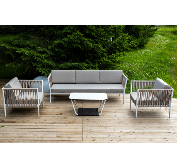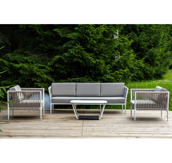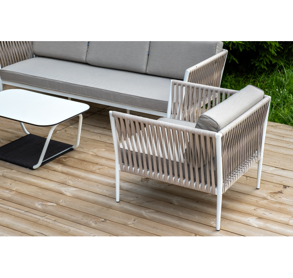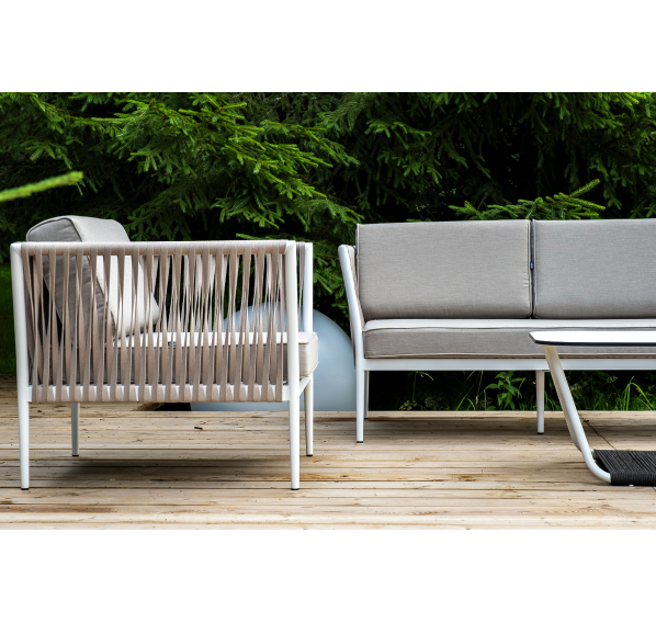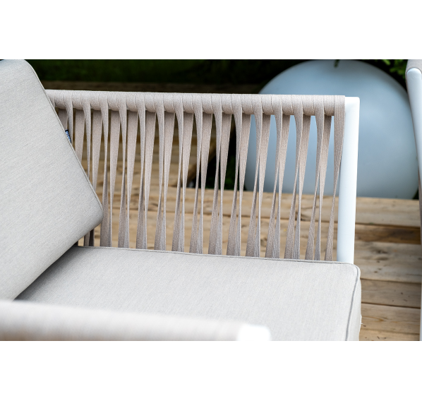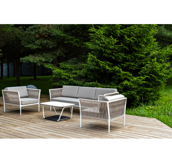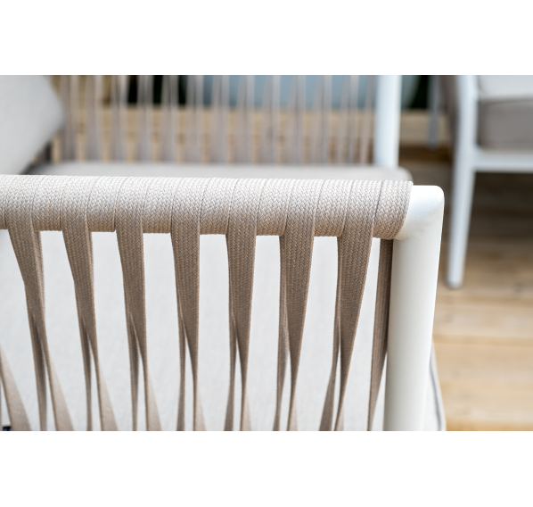Диван и кресла изготовлены их алюминиевого прочного каркаса, оплетенного ручным способом роупом бежевого цвета. Это эластичные ленты из полиэфирных волокон высокого качества.