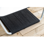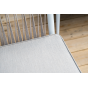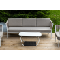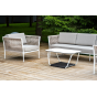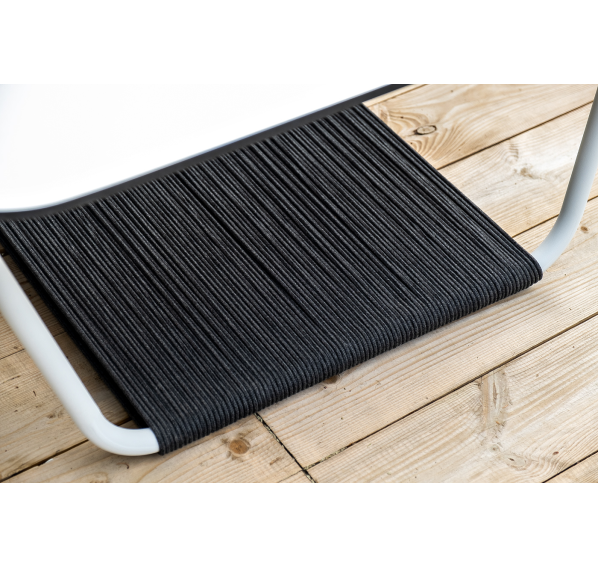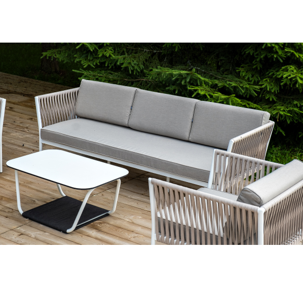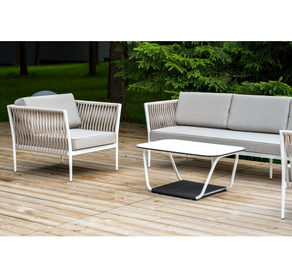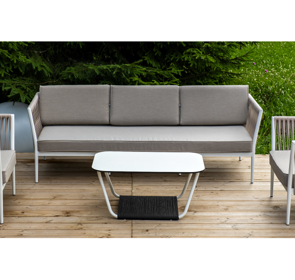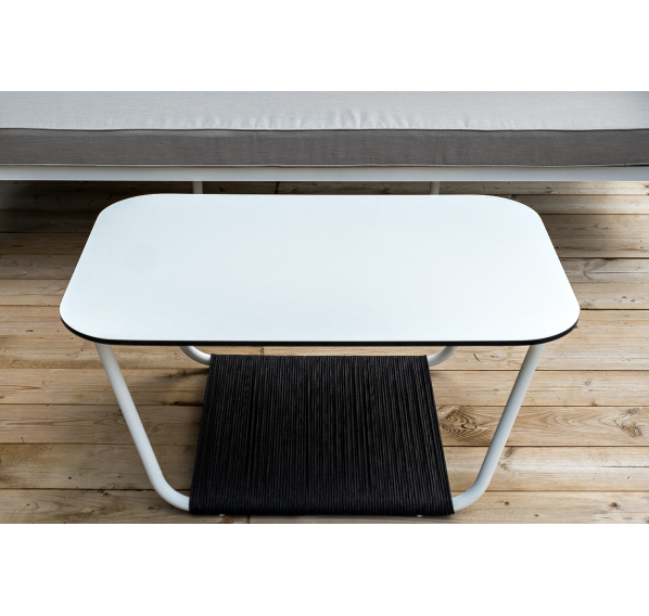 Журнальный столик также имеет алюминиевый каркас белого цвета. Столешница выполнена из монолитного компакт-пластика HPL молочного оттенка. Нижняя часть столика задекорирована роупом серого цвета и представляет дополнительную полку для хранения.