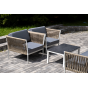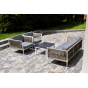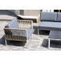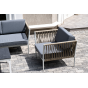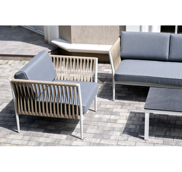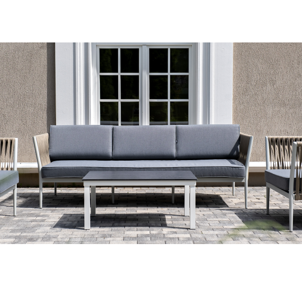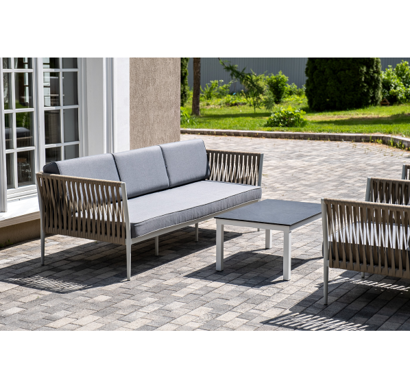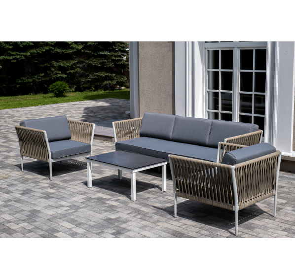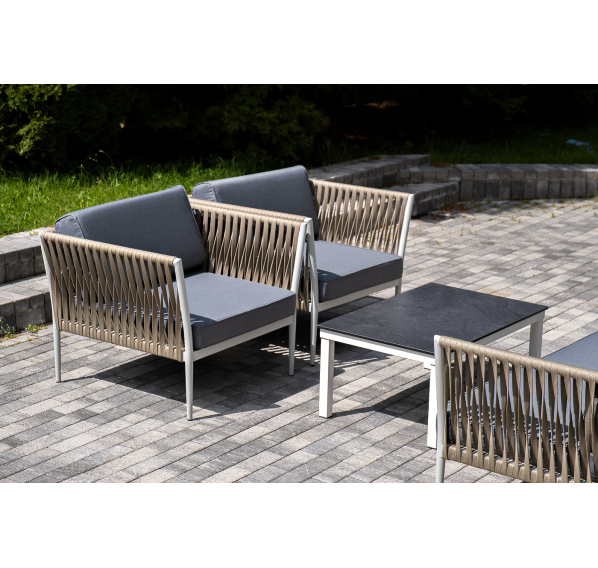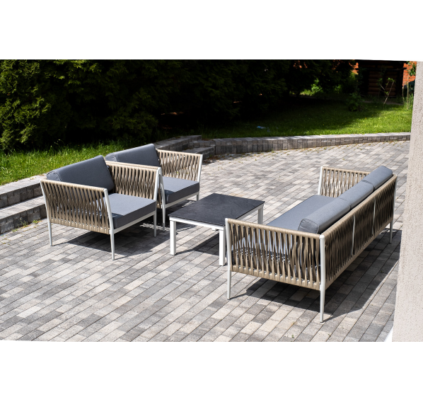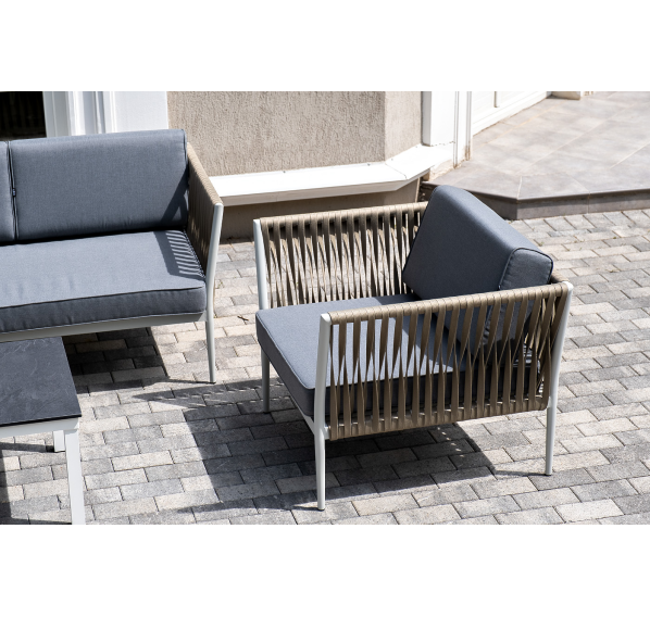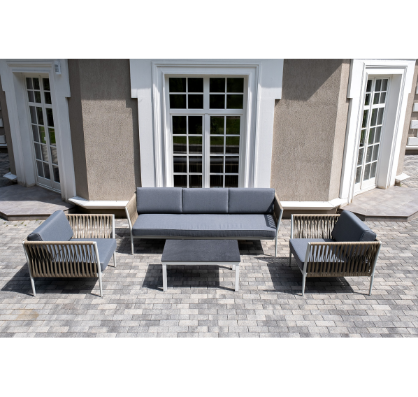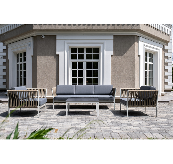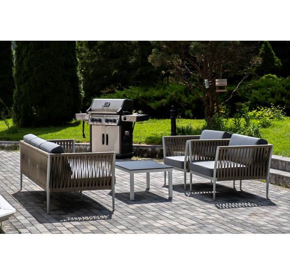 Диван и кресла изготовлены их алюминиевого прочного каркаса, оплетенного ручным способом роупом серо-коричневого цвета. Это эластичные ленты из полиэфирных волокон высокого качества.