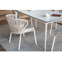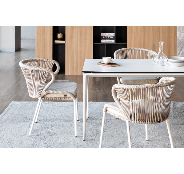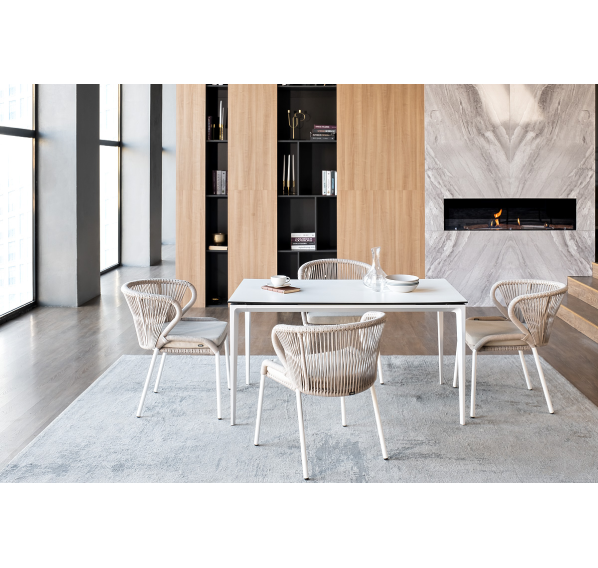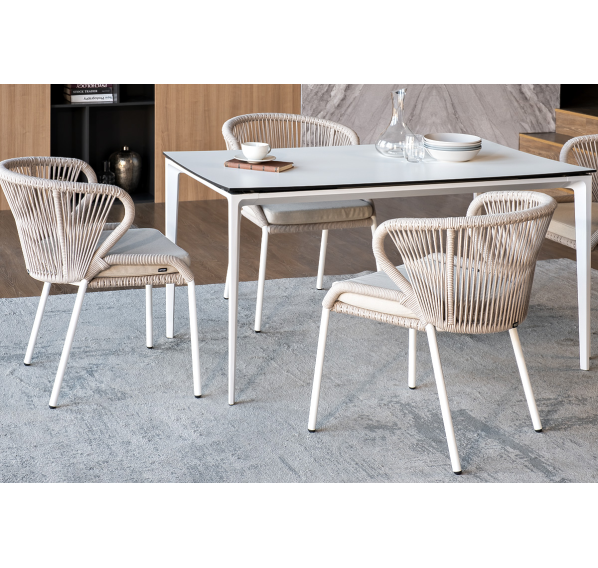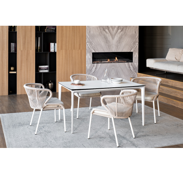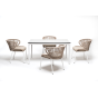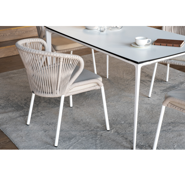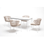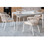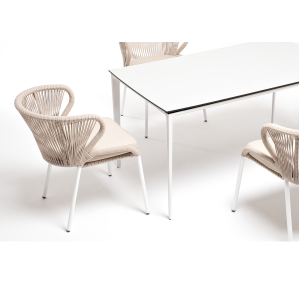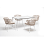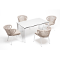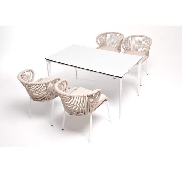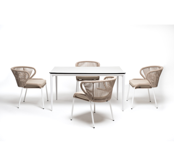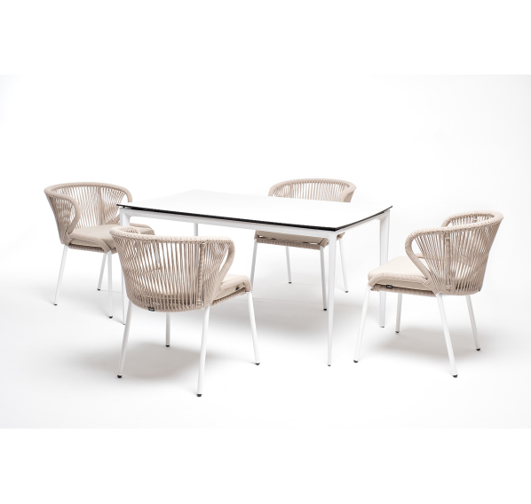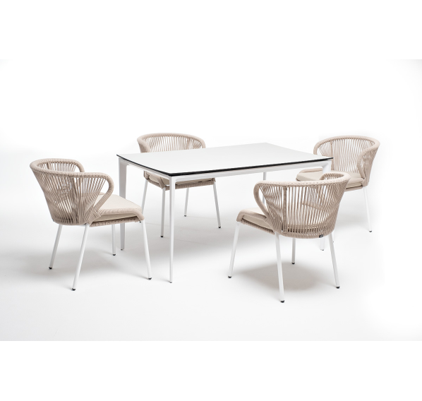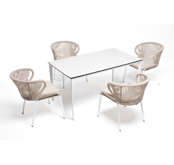 В этот комплект входит стол с прочной и стильной столешницей из HPL-пластика размером 1400×800 мм и высотой 75 см (цвет столешницы - молочный), а также 4 плетеных стула «Милан», изготовленных из бежевого роупа с белым алюминиевым каркасом.