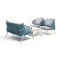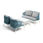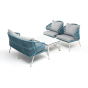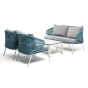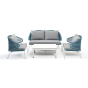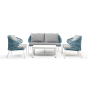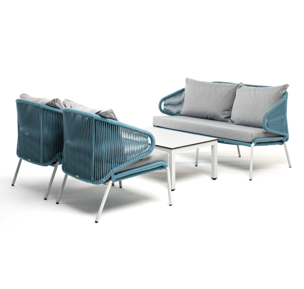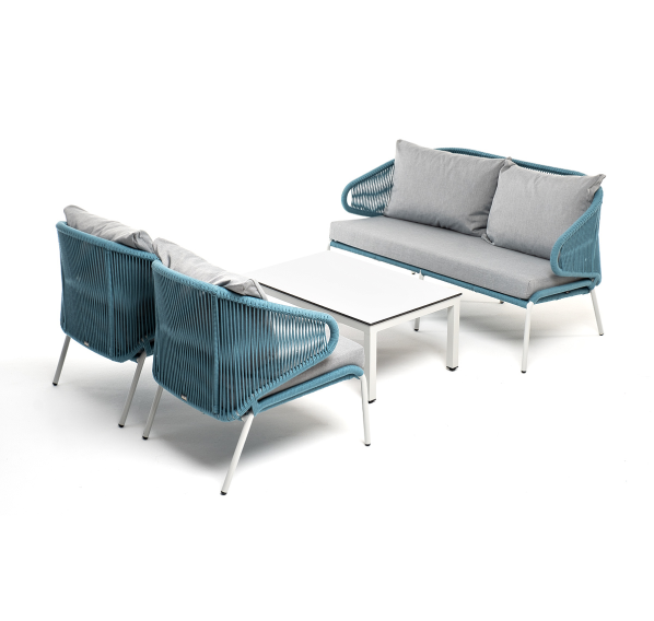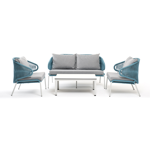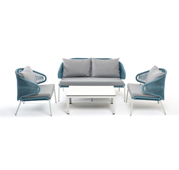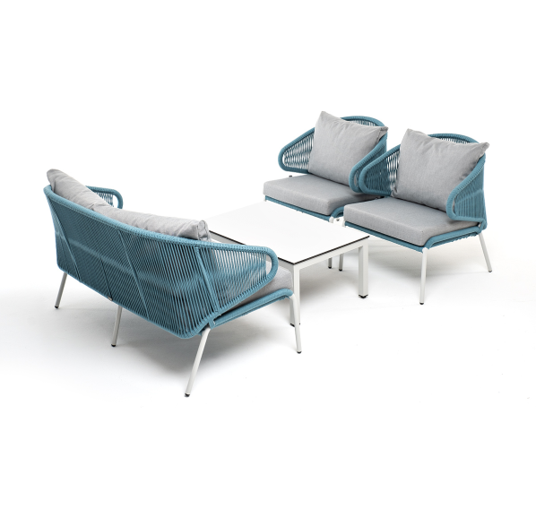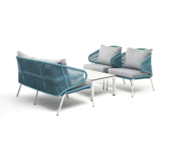 Каркас уличной мебели выполнен из износостойкого алюминия. Его дополняет бирюзовая ручная оплетка, изготовленная на основе эластичных синтетических лент из полиэфирных волокон высокой прочности (роупа).