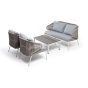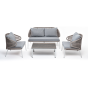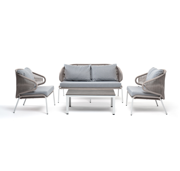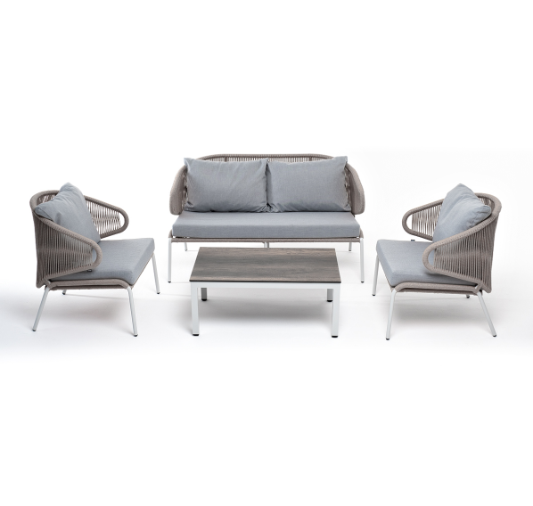 Каркас уличной мебели выполнен из износостойкого алюминия. Его дополняет оплетка цвета серый меланж, изготовленная на основе эластичных синтетических лент из полиэфирных волокон высокой прочности.