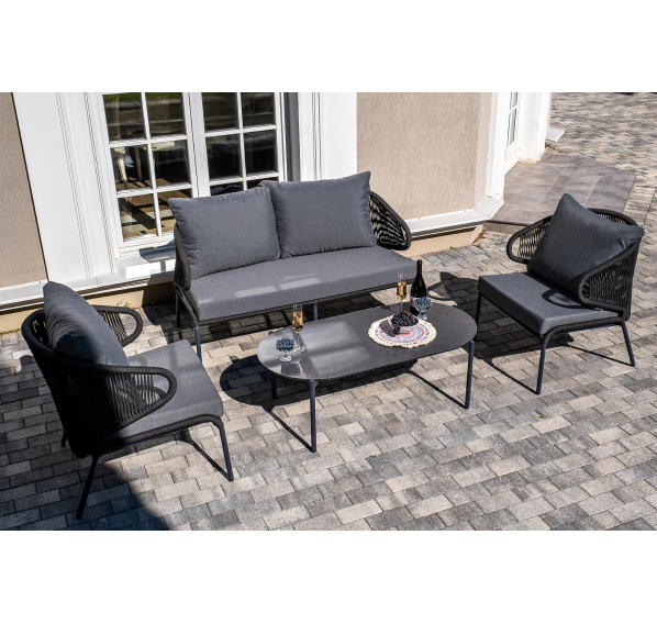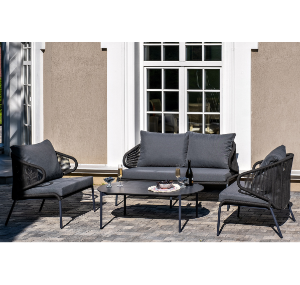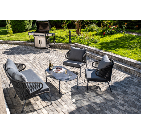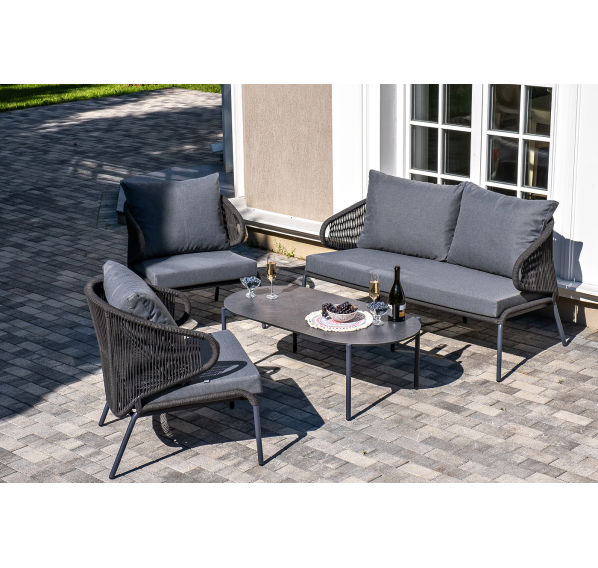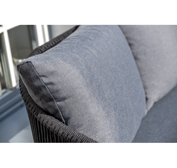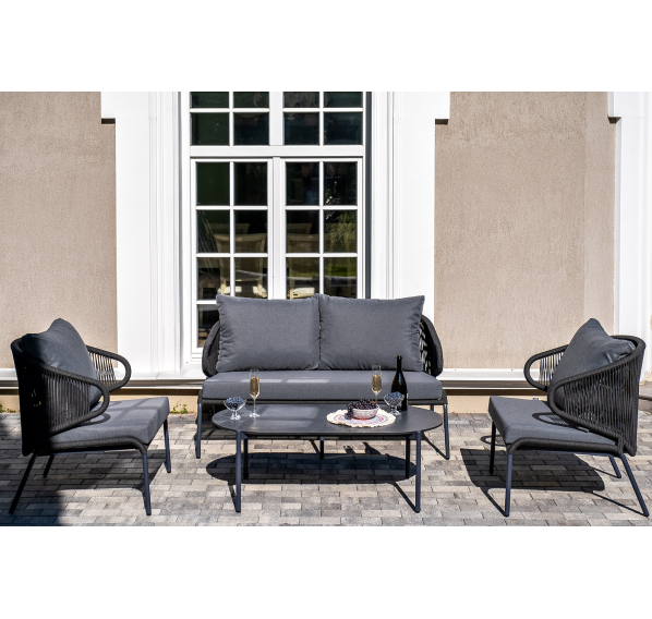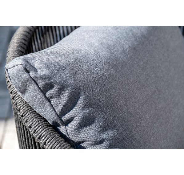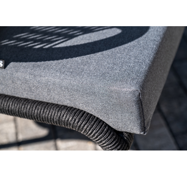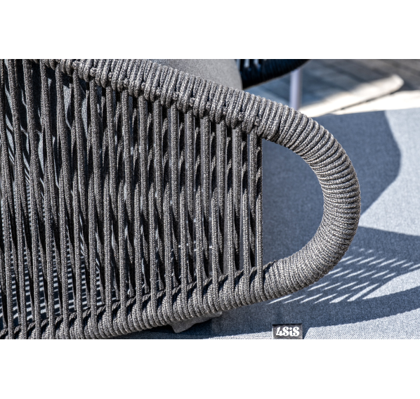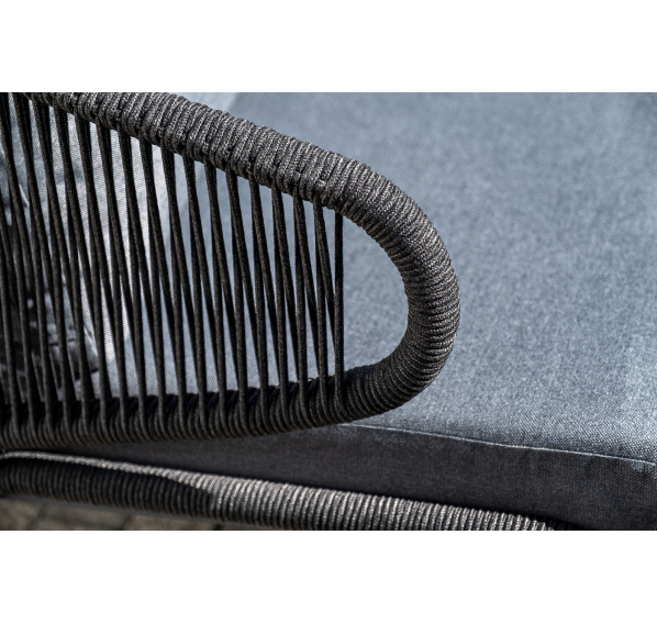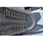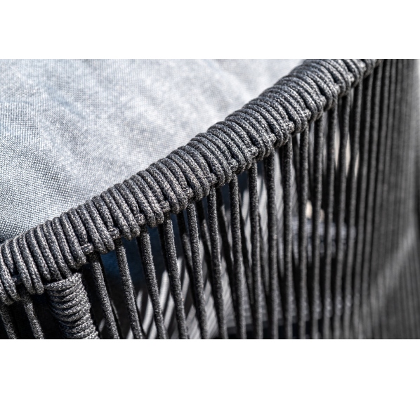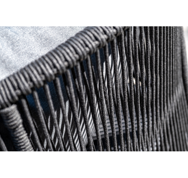 Каркас уличной мебели выполнен из износостойкого алюминия. Его дополняет темно-серая ручная оплетка, изготовленная на основе эластичных синтетических лент из полиэфирных волокон высокой прочности (роупа).