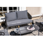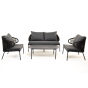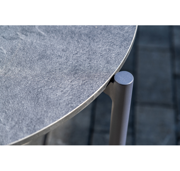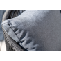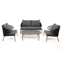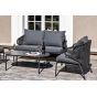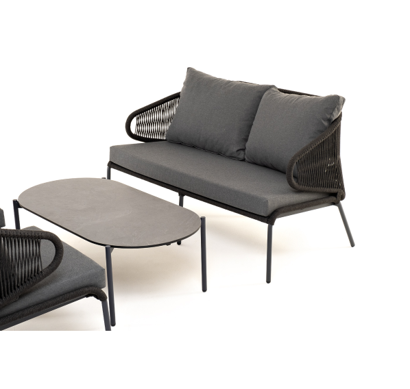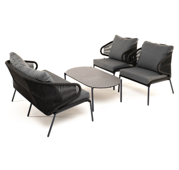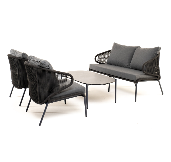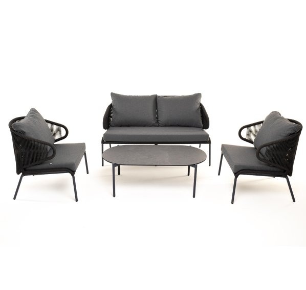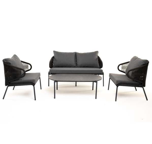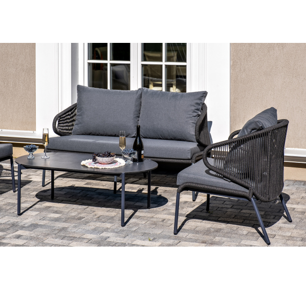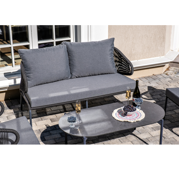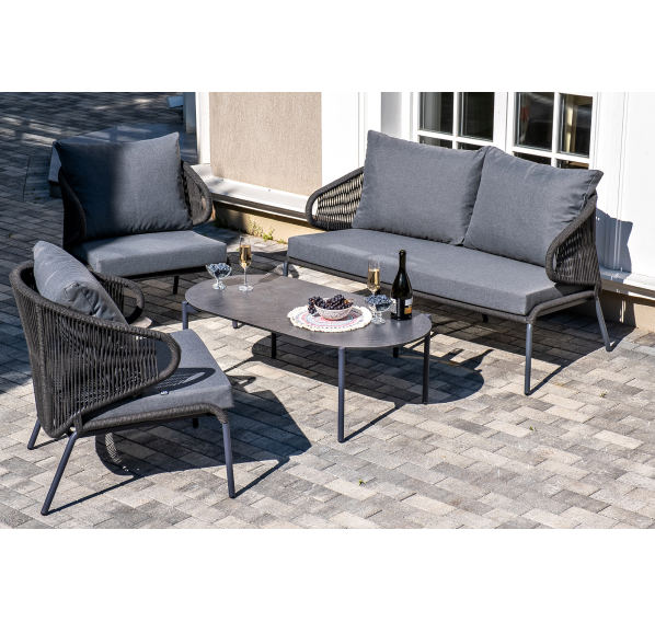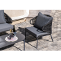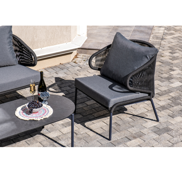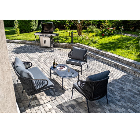 Каркас уличной мебели выполнен из износостойкого алюминия. Его дополняет темно-серая ручная оплетка, изготовленная на основе эластичных синтетических лент из полиэфирных волокон высокой прочности (роупа).