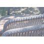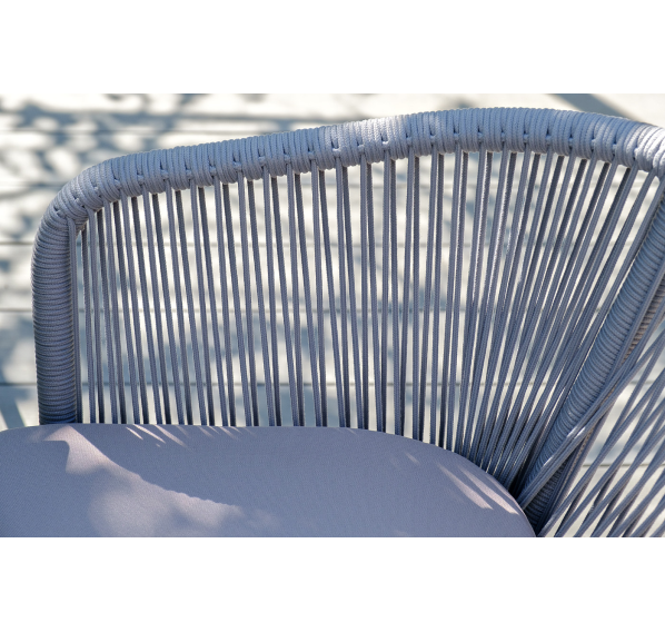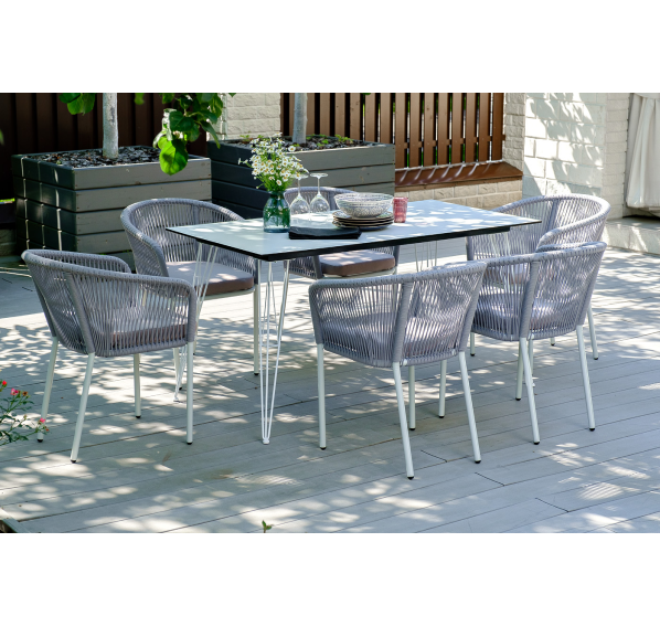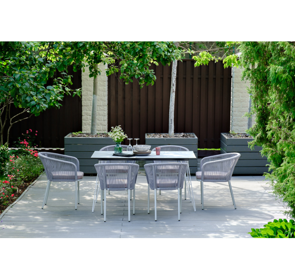 Каркас стульев белого цвета - алюминиевый, оплетен вручную современным материалом - роупом светло-серого оттенка. Это эластичные синтетические ленты из высокопрочных полиэфирных волокон. В комплект входят подушки со съёмными водоотталкивающими чехлами.