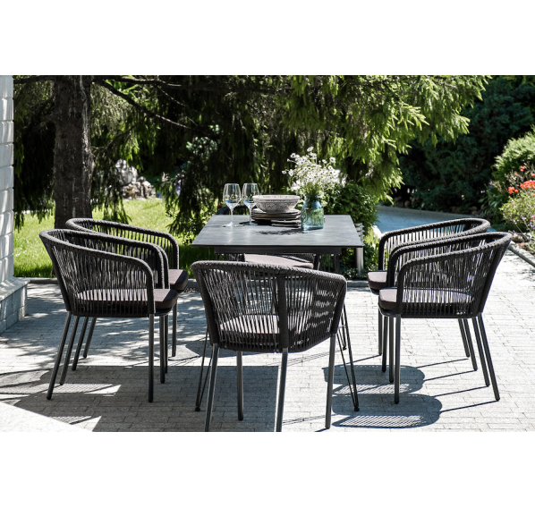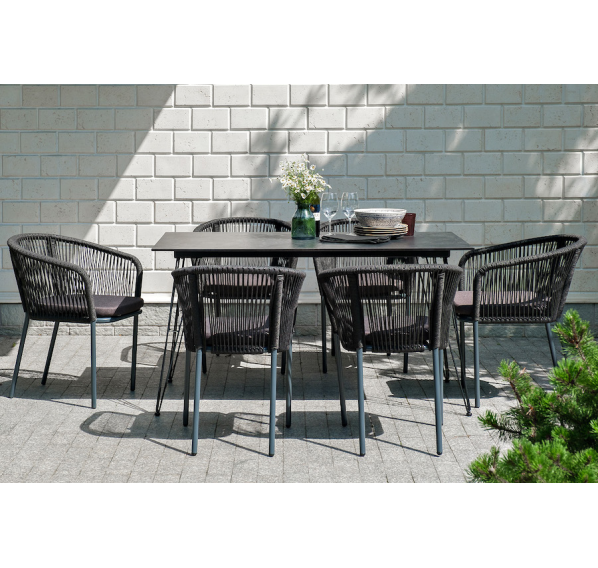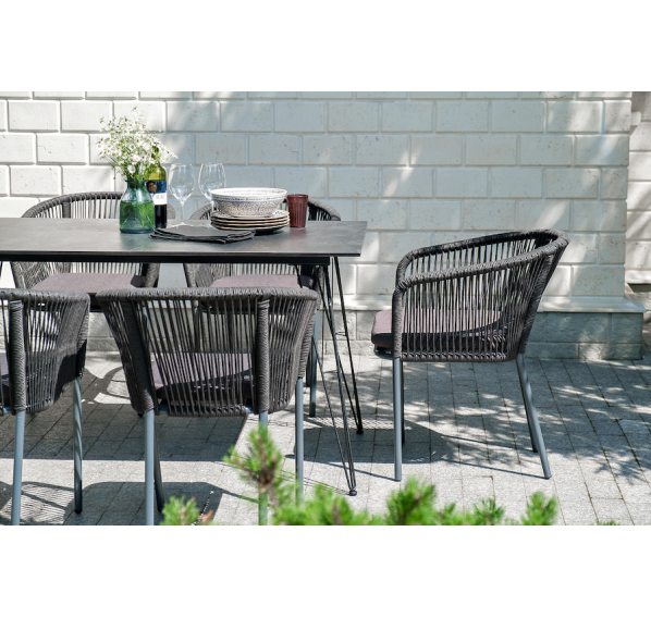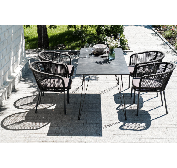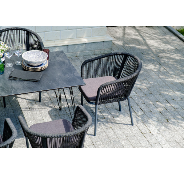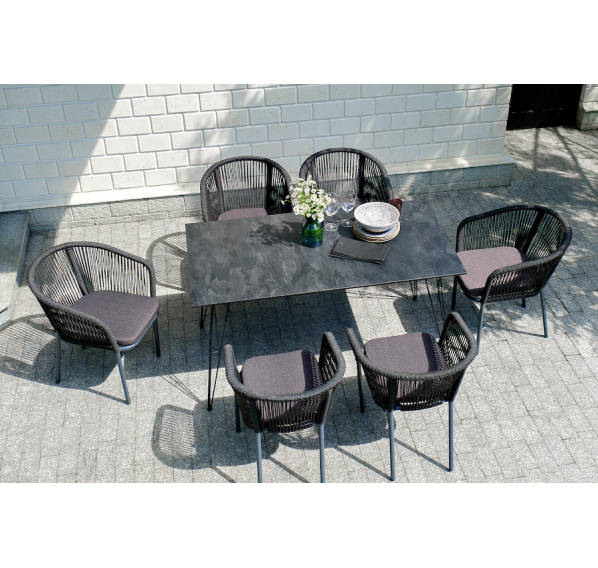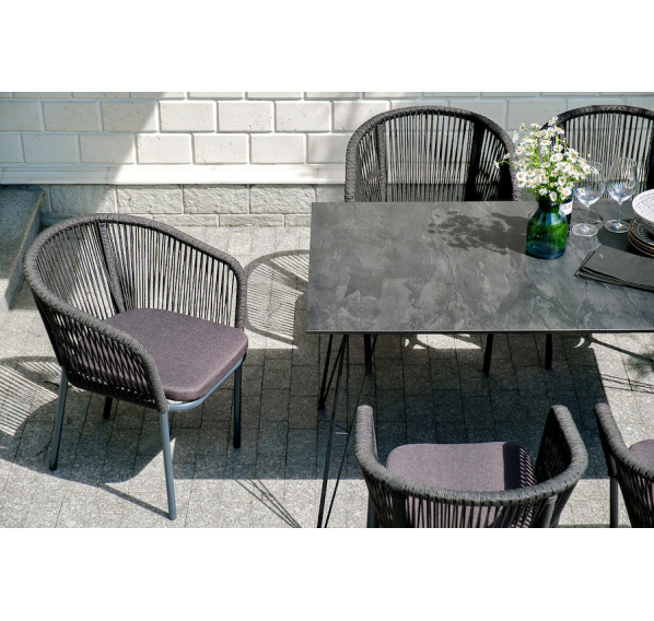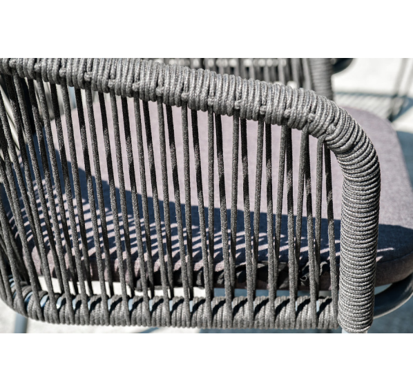 Каркас стульев - алюминиевый, оплетен вручную современным материалом - роупом. Это эластичные синтетические ленты из высокопрочных полиэфирных волокон. В комплект входят подушки со съёмными водоотталкивающими чехлами серого цвета.