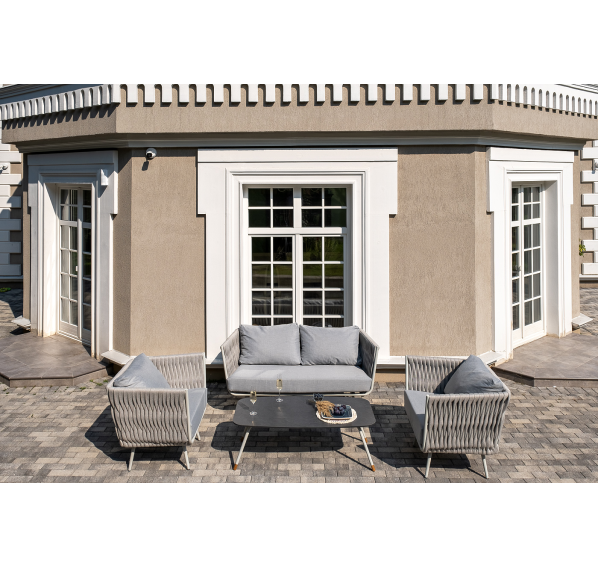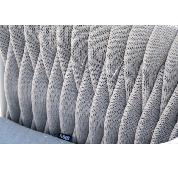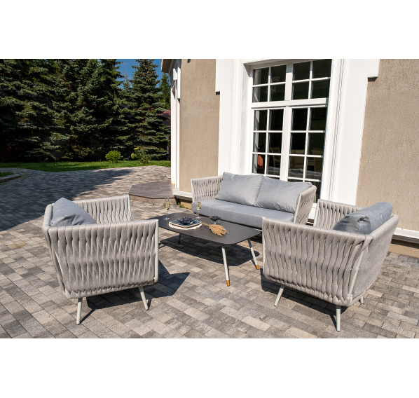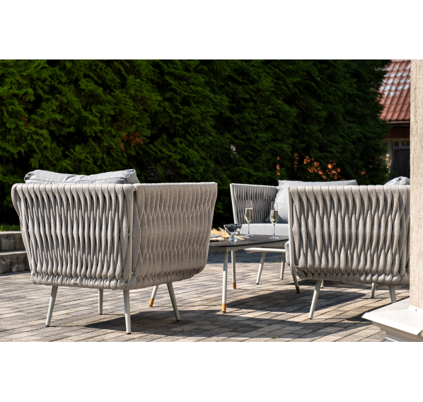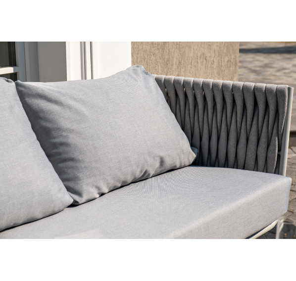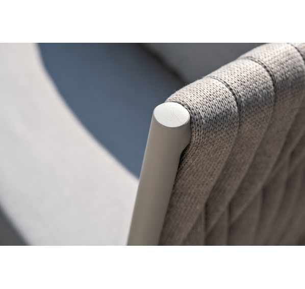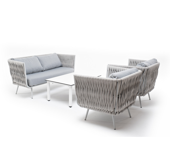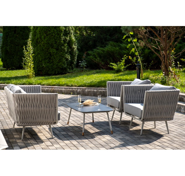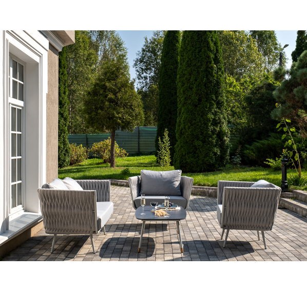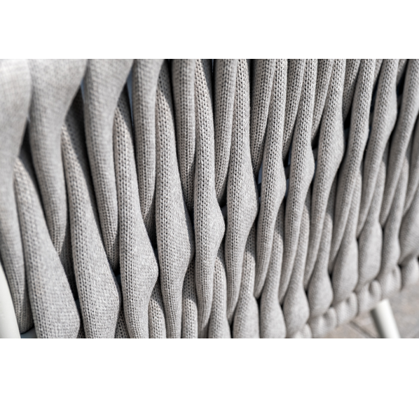 Каркас уличной мебели выполнен из алюминия. Его дополняет светло-серая оплетка, изготовленная на основе эластичных синтетических лент из полиэфирных волокон высокой прочности.