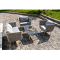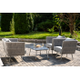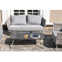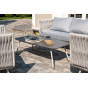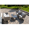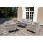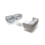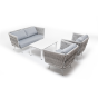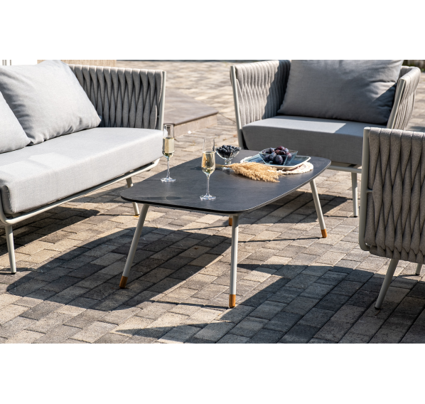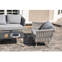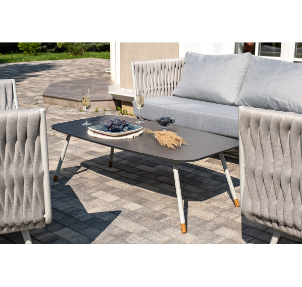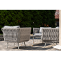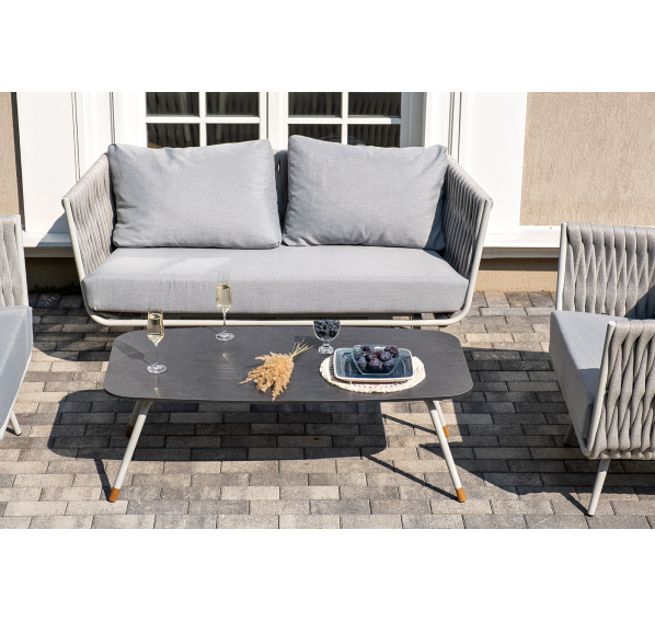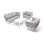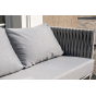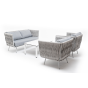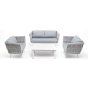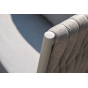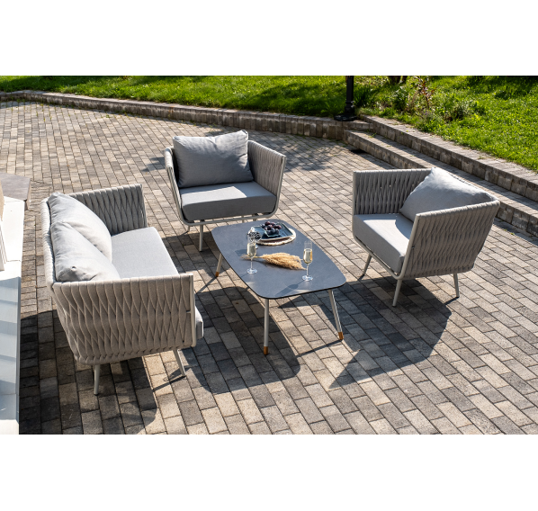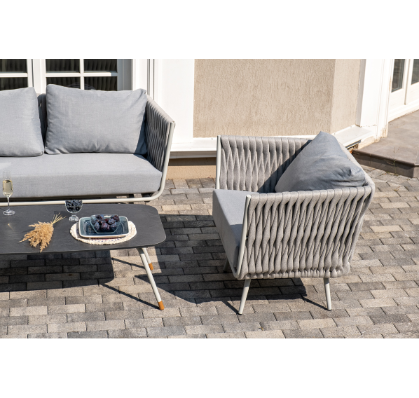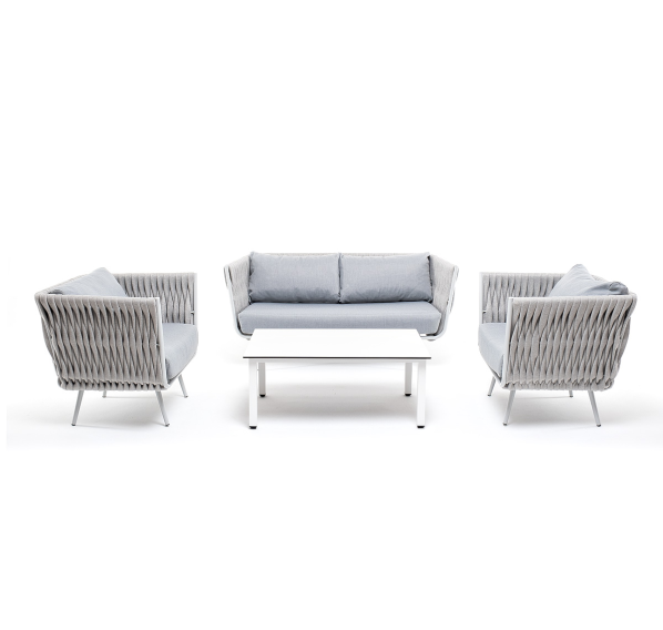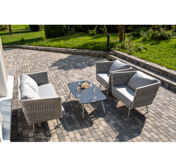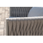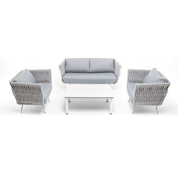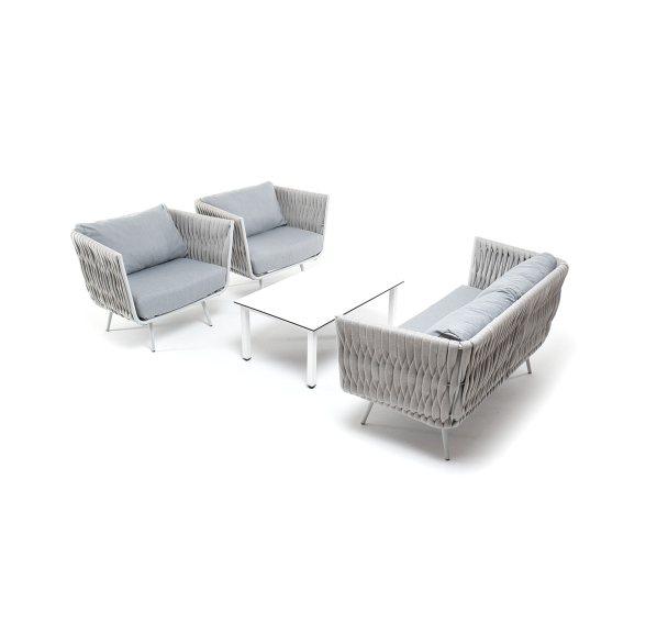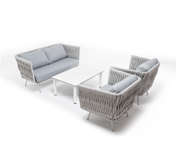 Каркас уличной мебели выполнен из алюминия. Его дополняет светло-серая оплетка, изготовленная на основе эластичных синтетических лент из полиэфирных волокон высокой прочности.