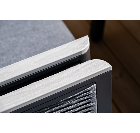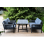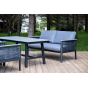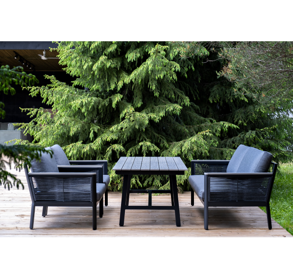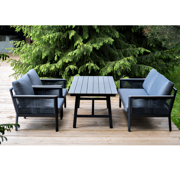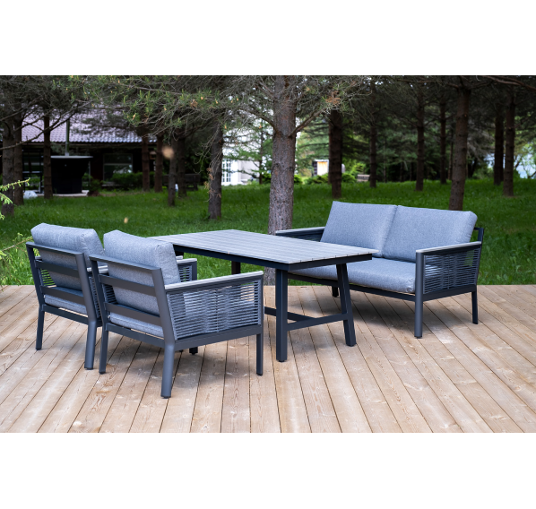 Диван и кресла оснащены подушками серого цвета со съёмными чехлами. Стол со столешницей из ДПК.