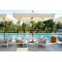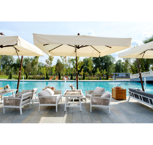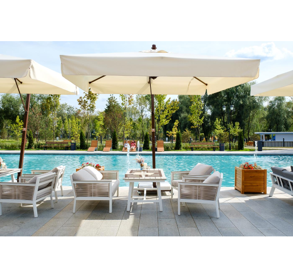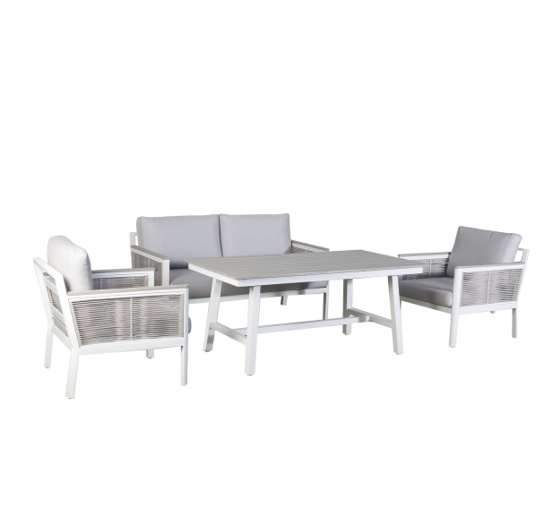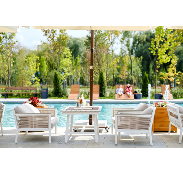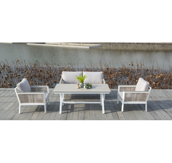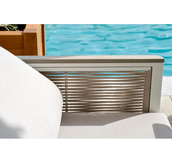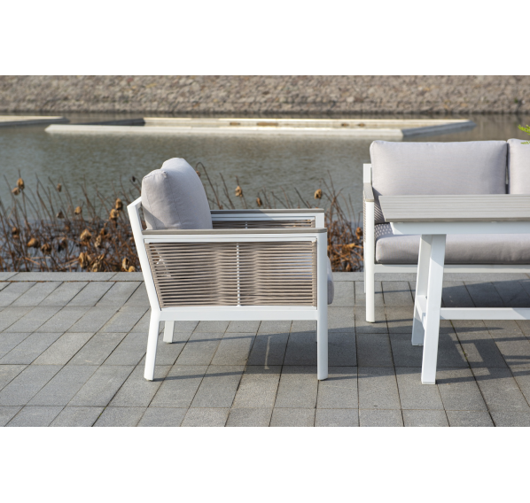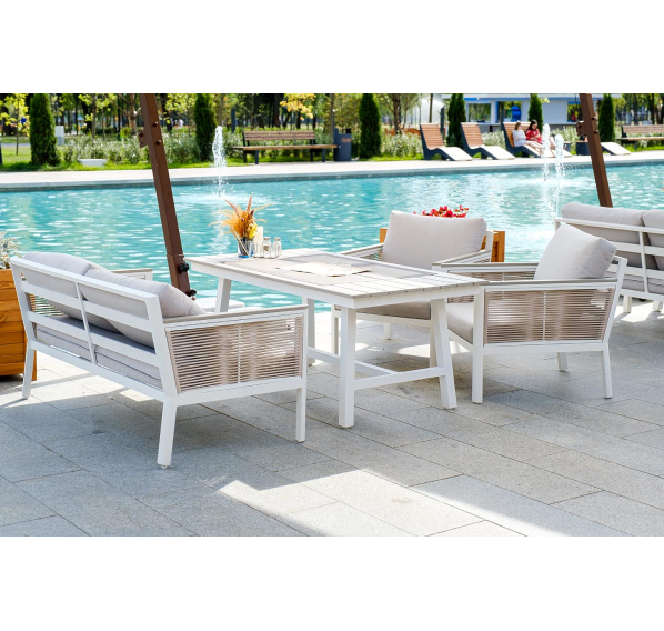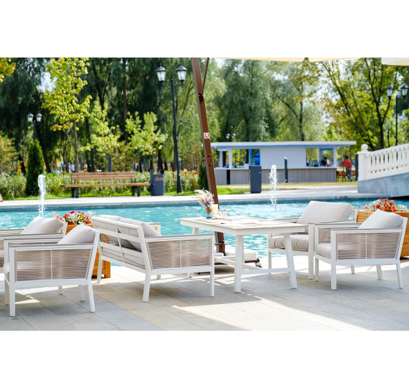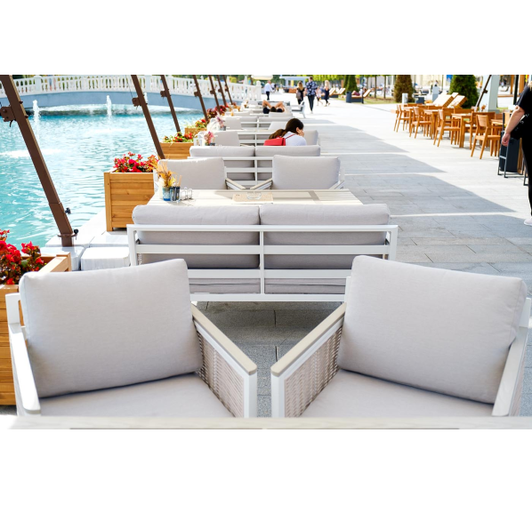 «Сан Ремо» лаунж-зона, алюминиевый каркас белого цвета, вручную оплетенный роупом серо-коричневого цвета.