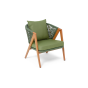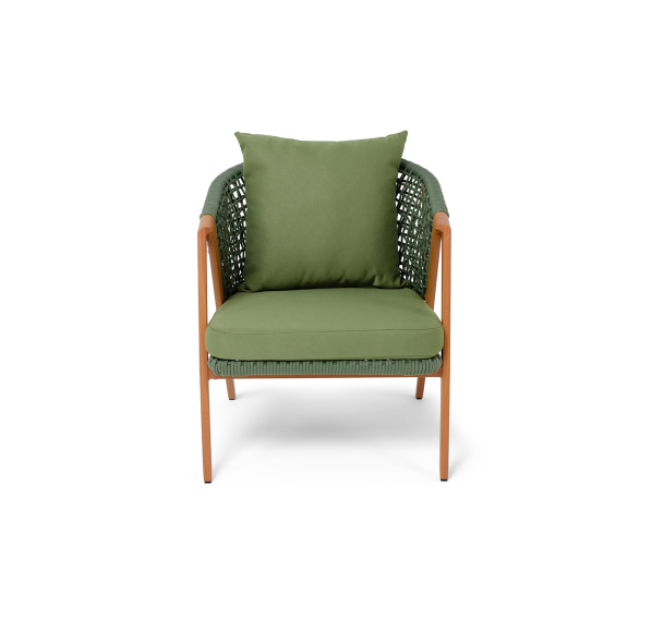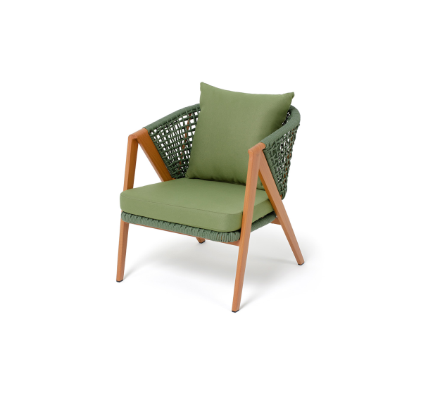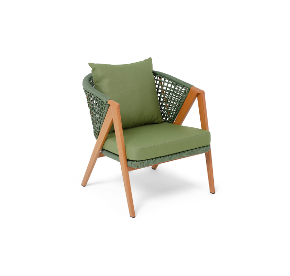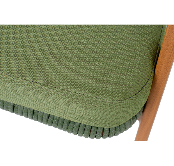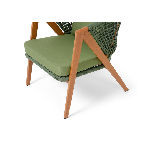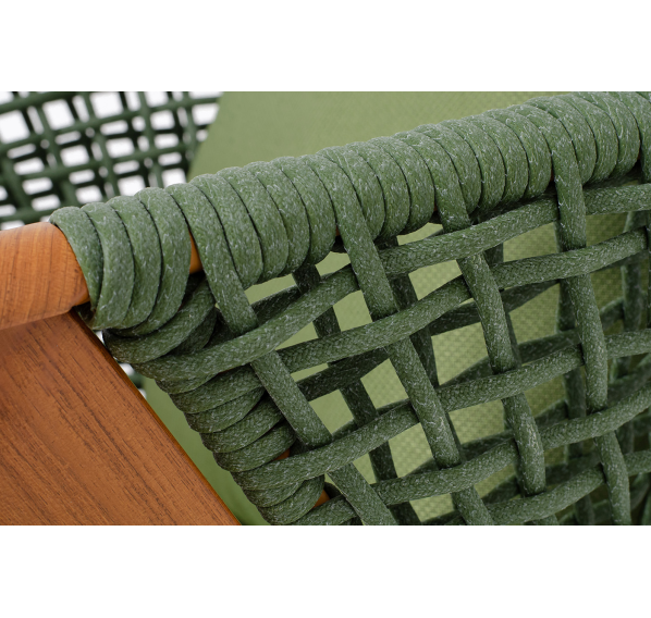 Изготовлен из алюминиевого каркаса, оплетенного вручную эластичными синтетическими лентами из высокопрочных полиэфирных волокон. Роуп является гипоаллергенным, прочным, износостойким и устойчивым к ультрафиолету. Приятный на ощупь и напоминает шерстяное плетение. Цвет каркаса – «под дерево», оплетки - зеленый. На ножках стула идут черные пластиковые наконечники (заглушки).