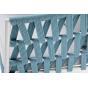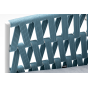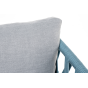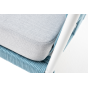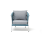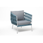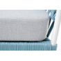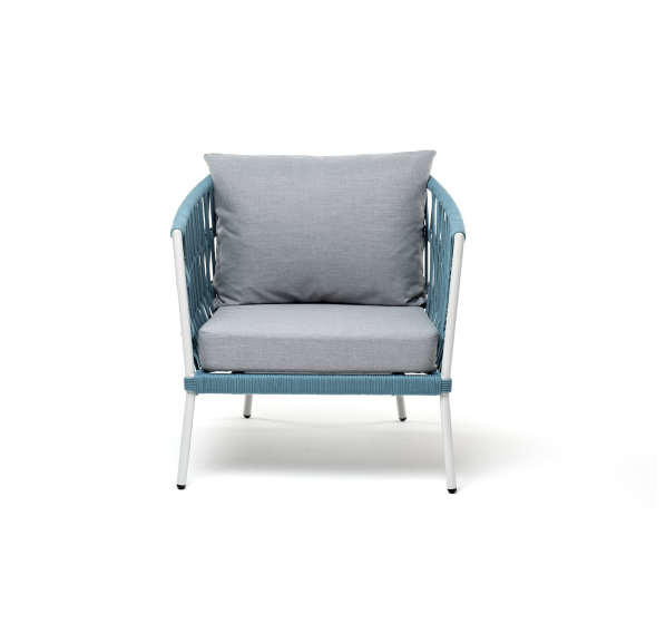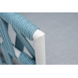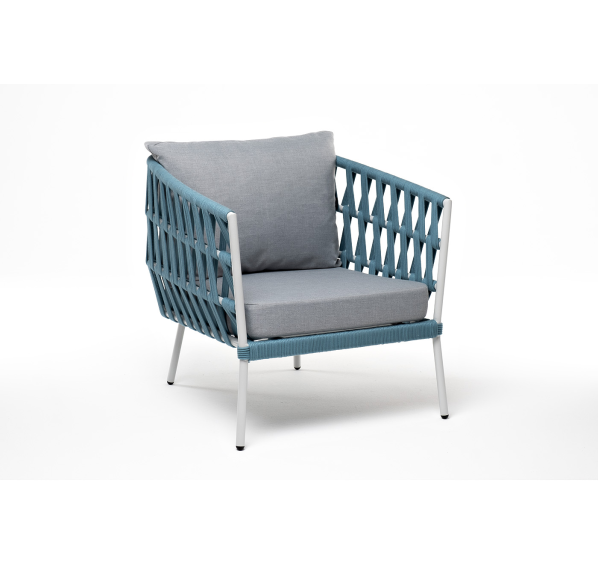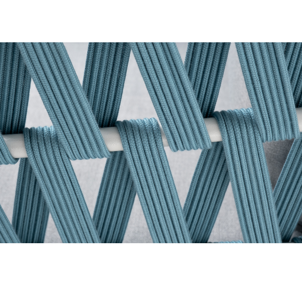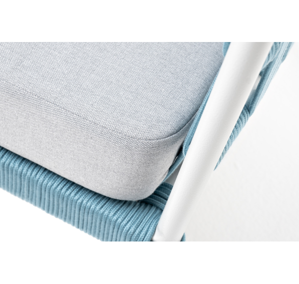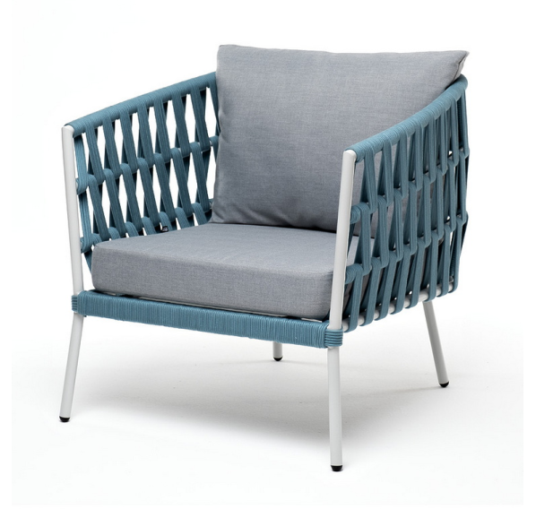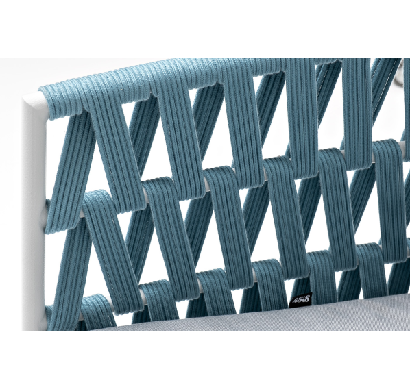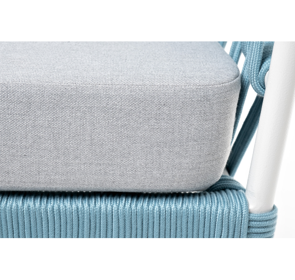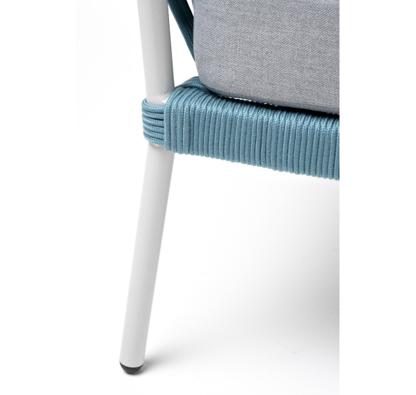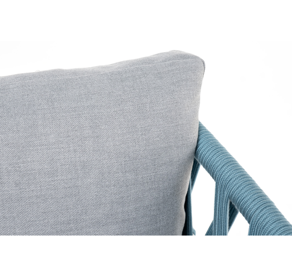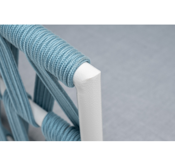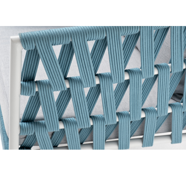 Кресло имеет алюминиевый каркас, окрашенный порошковой краской в светло-серый (RAL7035) цвет. Боковины каркаса вручную оплетены роупом - эластичными синтетическими лентами, изготовленными из высокопрочных полиэфирных волокон. Цвет оплетки - бирюзовый.