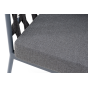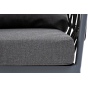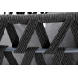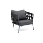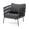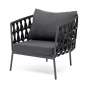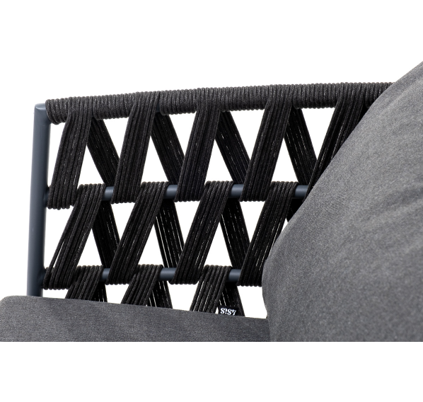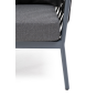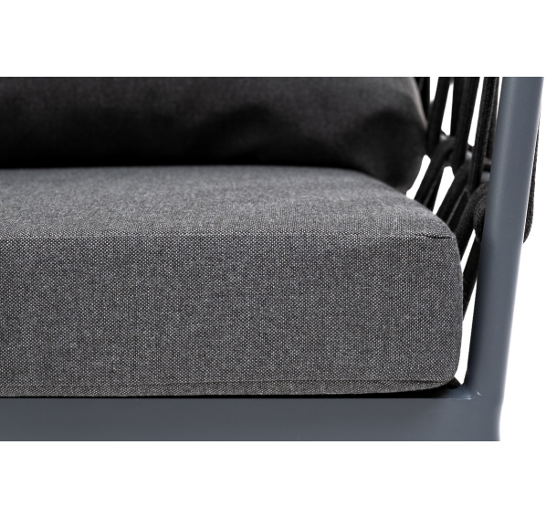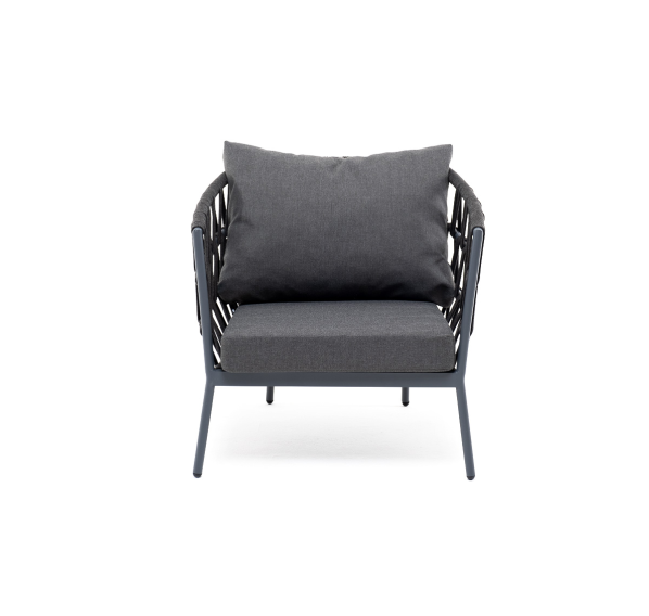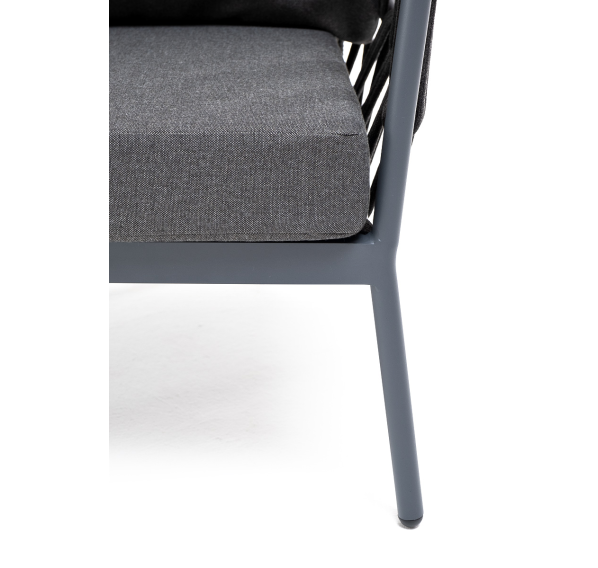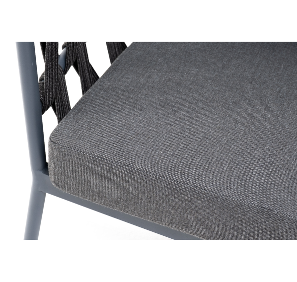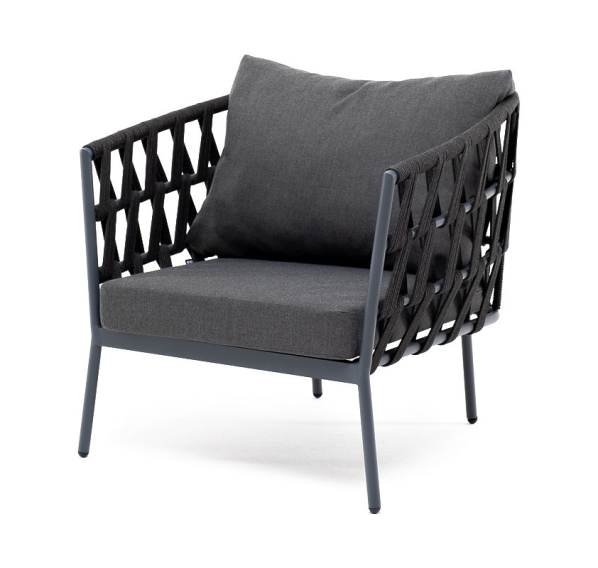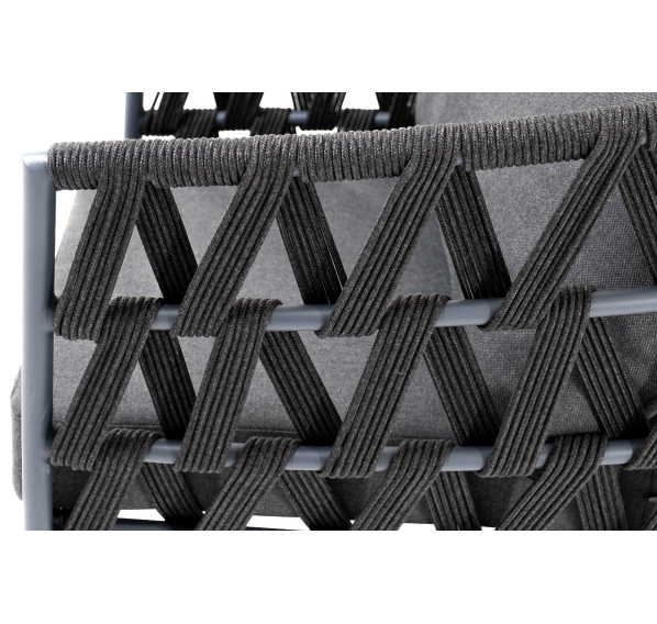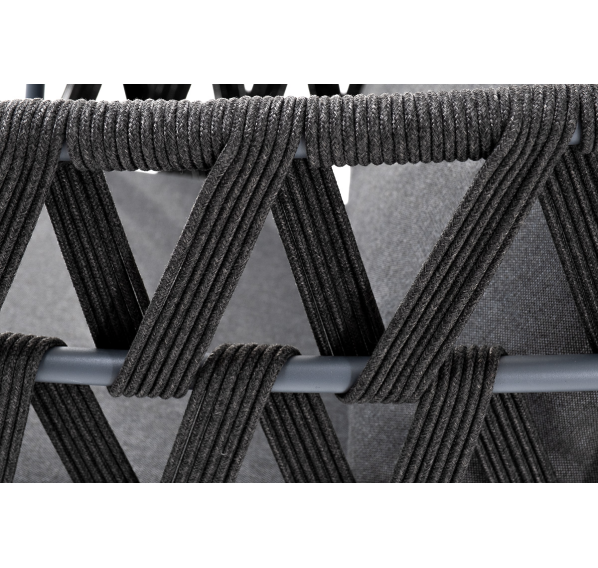 Кресло имеет алюминиевый каркас, окрашенный порошковой краской в темно-серый (RAL7024) цвет. Боковины каркаса вручную оплетены роупом - эластичными синтетическими лентами, изготовленными из высокопрочных полиэфирных волокон. Цвет оплетки - темно-серый.