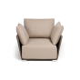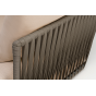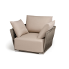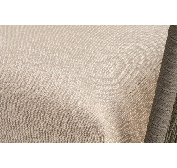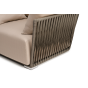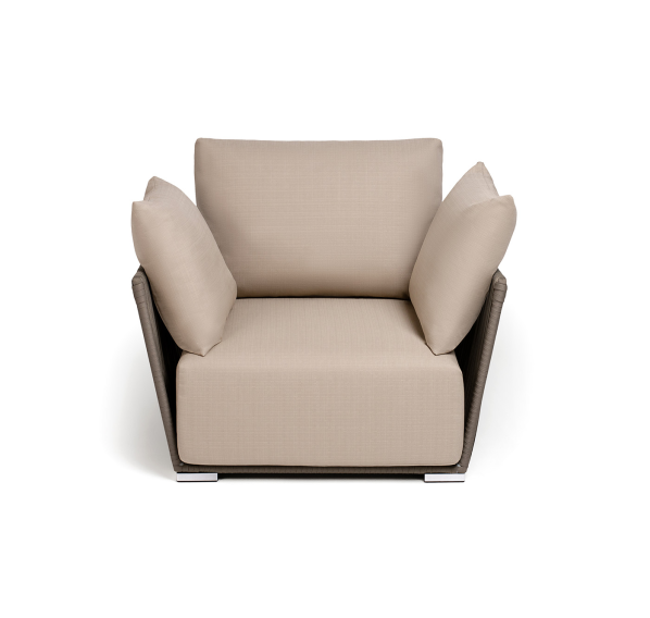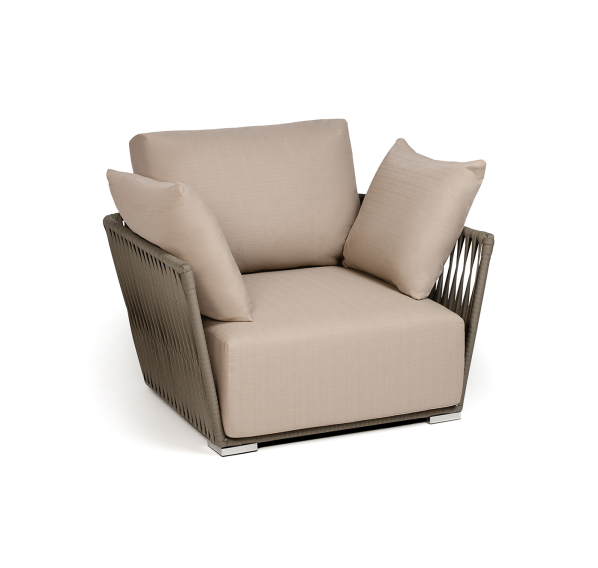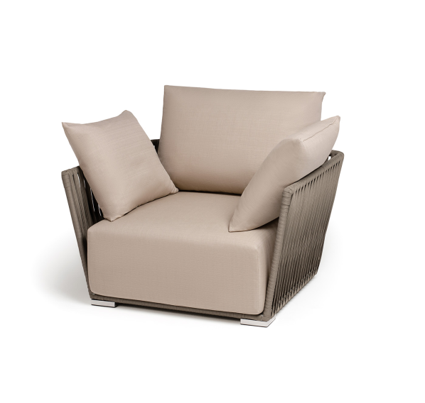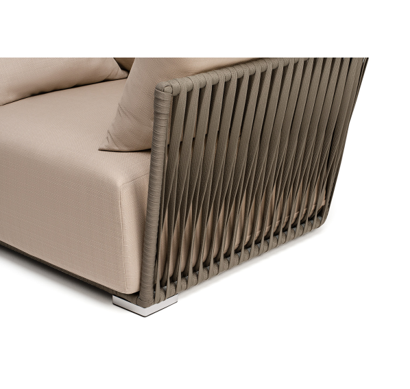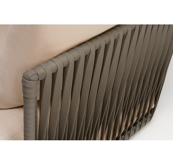 Кресло имеет алюминиевый каркас, окрашенный порошковой краской в светло-серый (RAL7035) цвет. Боковины каркаса вручную оплетены роупом - эластичными синтетическими лентами, изготовленными из высокопрочных полиэфирных волокон. Цвет оплетки - серо-коричневый.