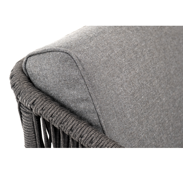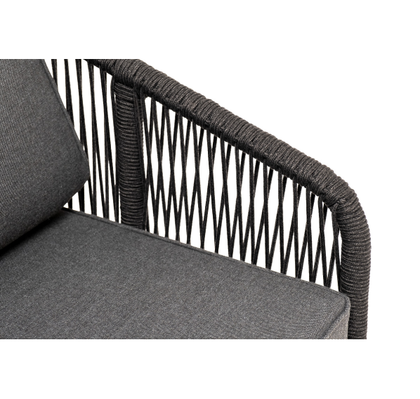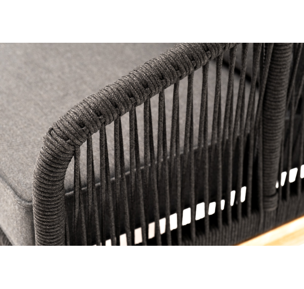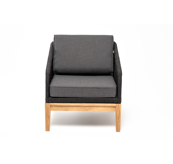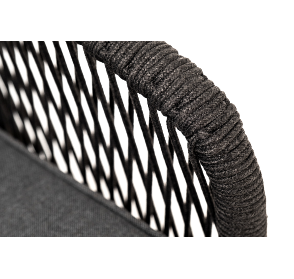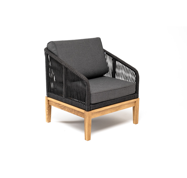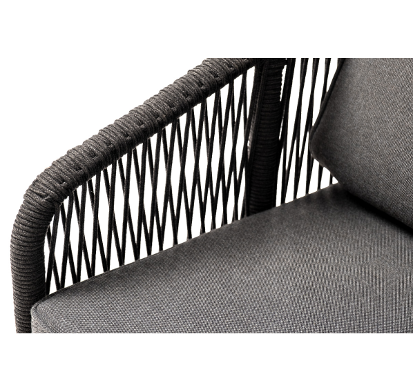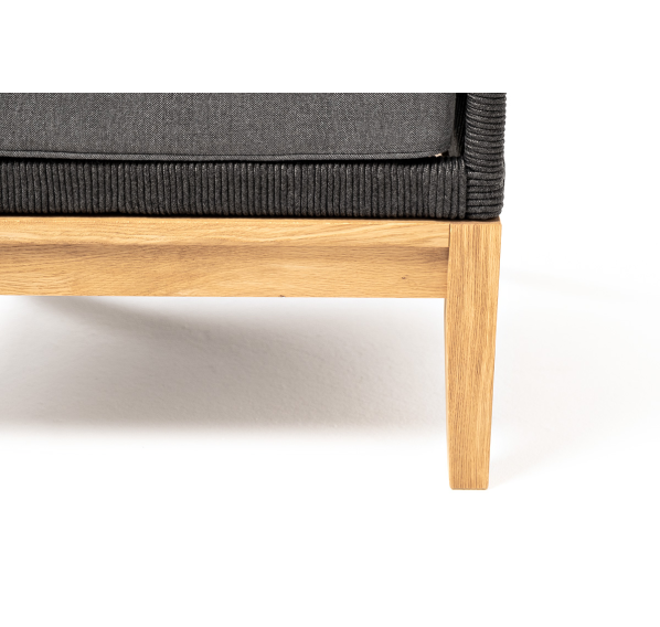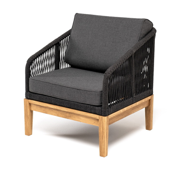 Каркас кресла оплетен синтетическими лентами, выполненных из полиэфирных волокон высокой прочности (роуп). Цвет плетения - темно-серый. Основание - натуральный дуб.