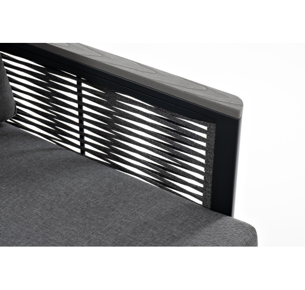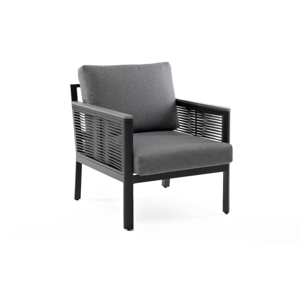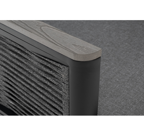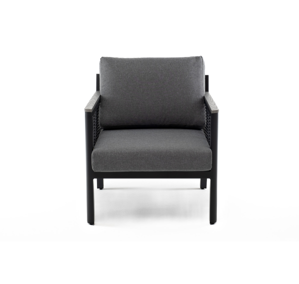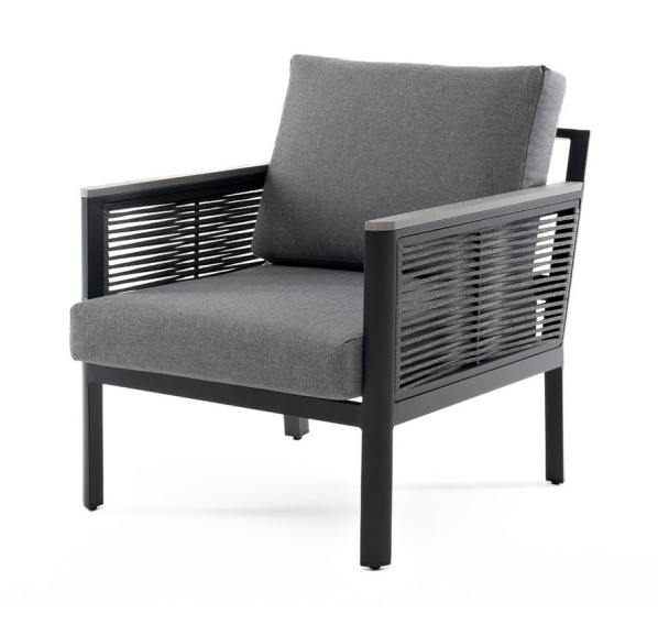 Размер модели – 680×780×700 мм. Ее каркас выполнен из высококачественного алюминия и окрашен порошковой краской в темно-серый цвет. Боковые стороны подлокотников вручную оплетены эластичными синтетическими лентами серого оттенка, состоящие из высокопрочных полиэфирных волокон.