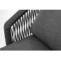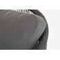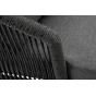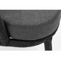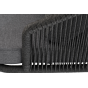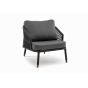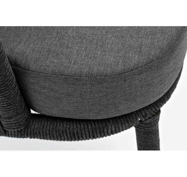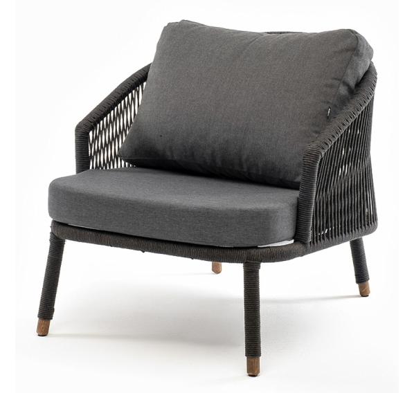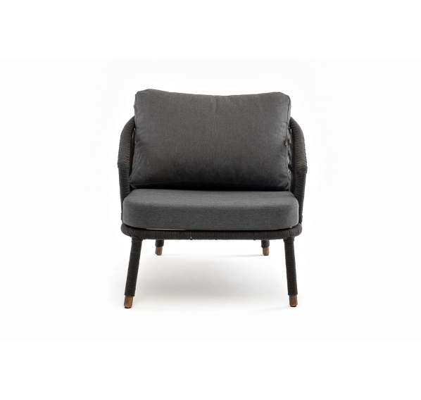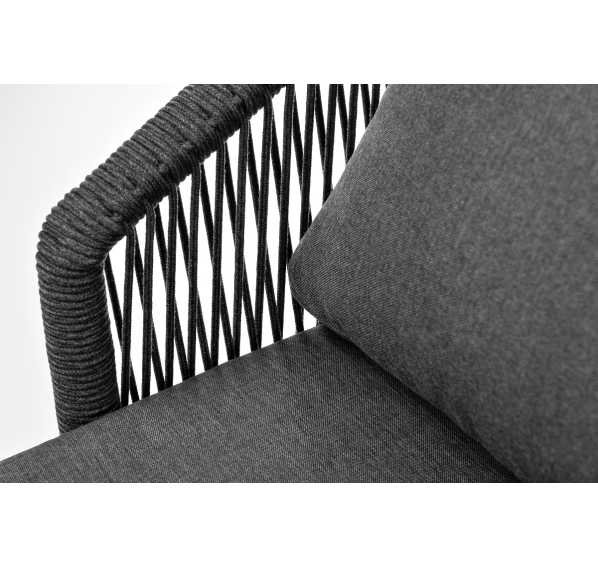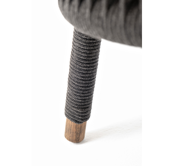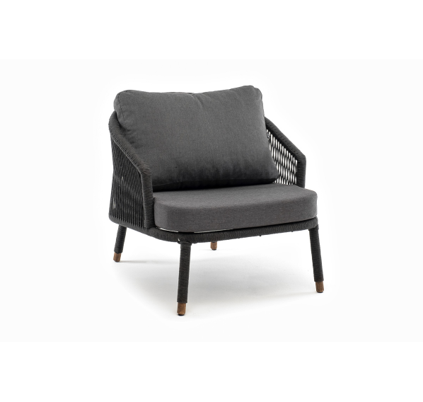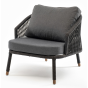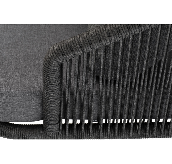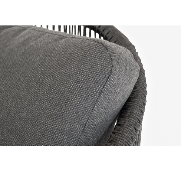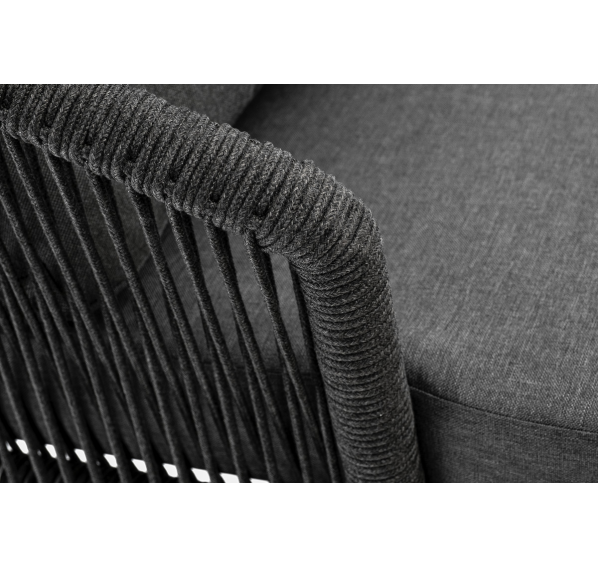Кресло имеет алюминиевый каркас, окрашенный порошковой краской в темно-серый (RAL7024) цвет. Боковины каркаса вручную оплетены роупом - эластичными синтетическими лентами, изготовленными из высокопрочных полиэфирных волокон. Цвет оплетки - темно-серый. На ножках кресла идут дубовые наконечники (заглушки).