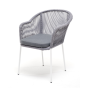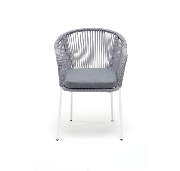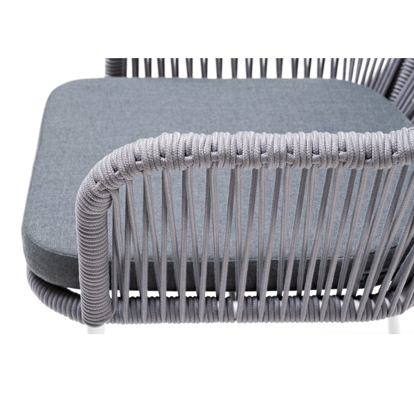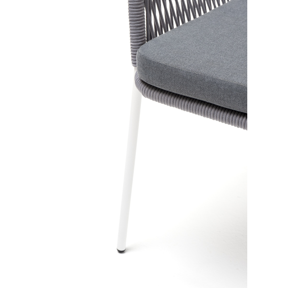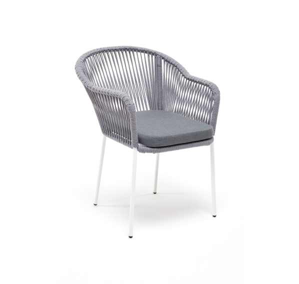 Стальной каркас белого цвета гарантирует прочность и надежность, а плетение из эластичных лент высокопрочных полиэфирных волокон светло-серого оттенка создает удобное и уютное сидение.