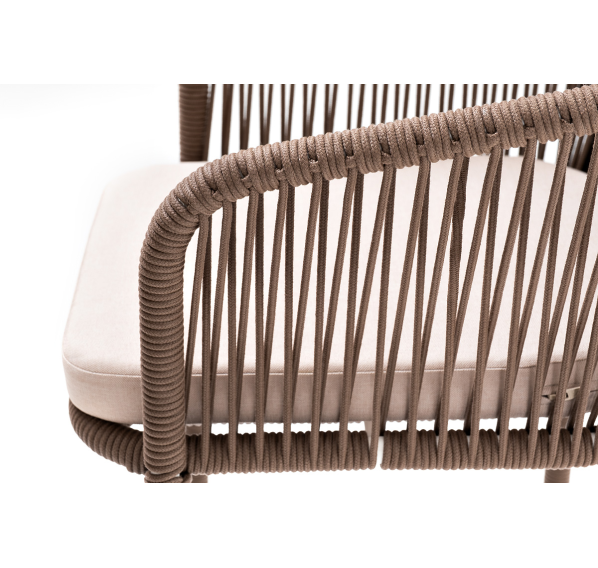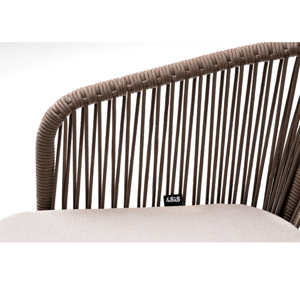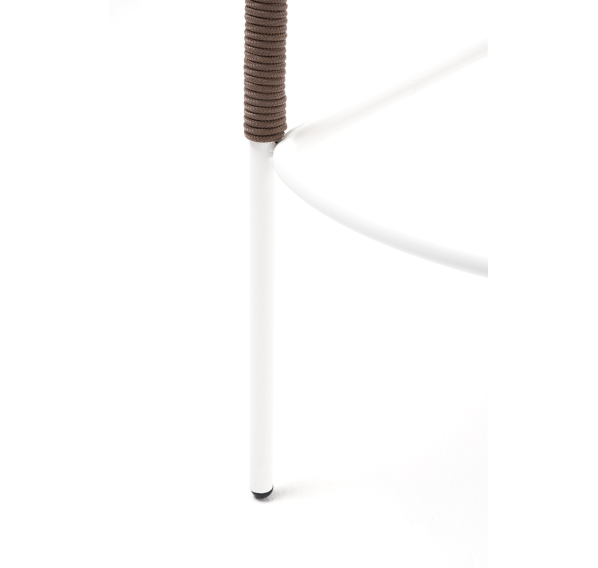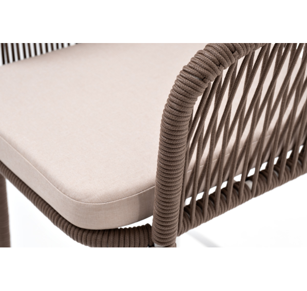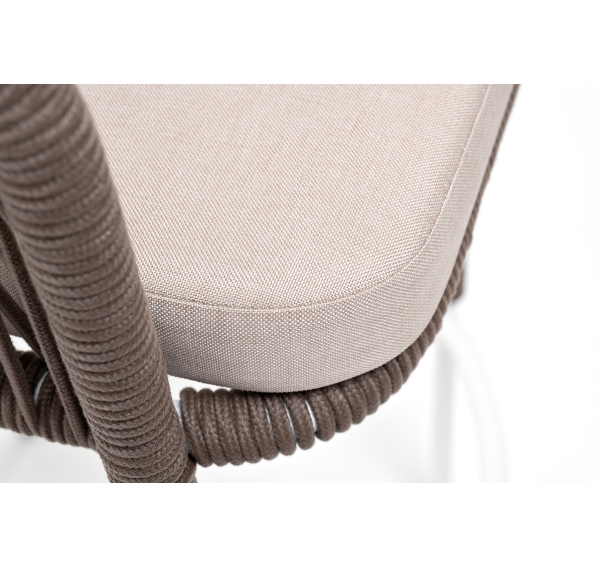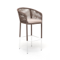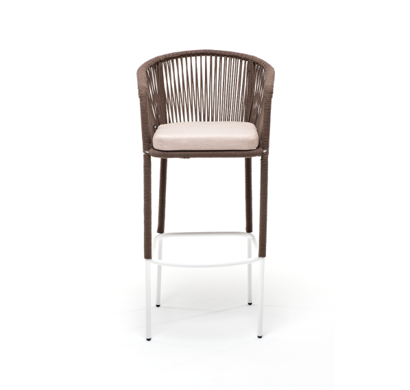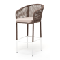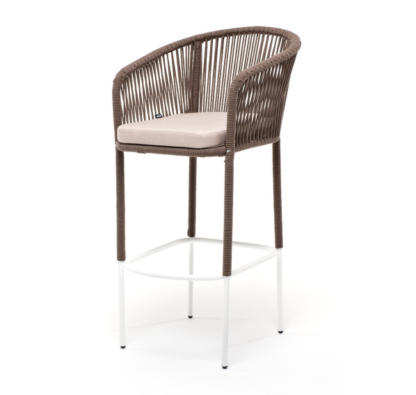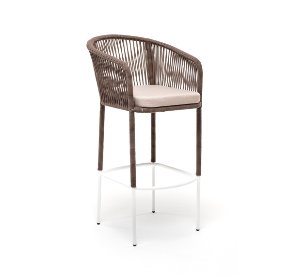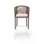 Барный стул из коллекции «Марсель» представлен в виде стального каркаса, оплетенного вручную эластичными синтетическими лентами из высокопрочных полиэфирных волокон - роуп коричневый.