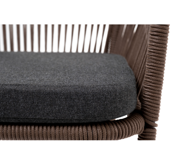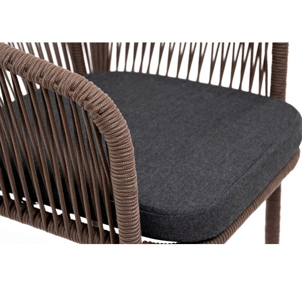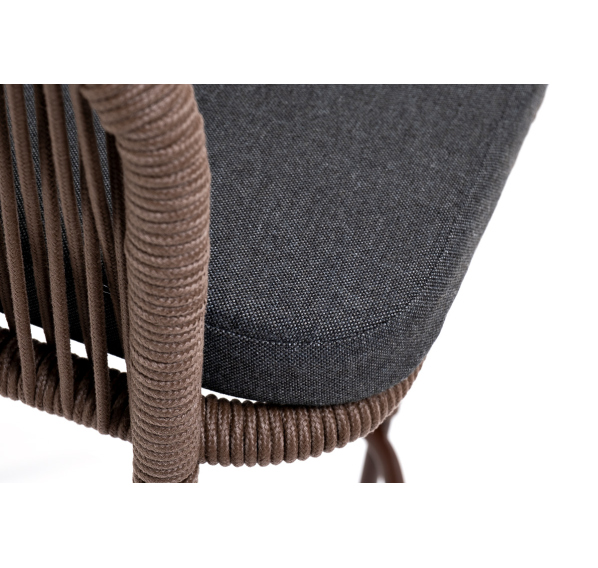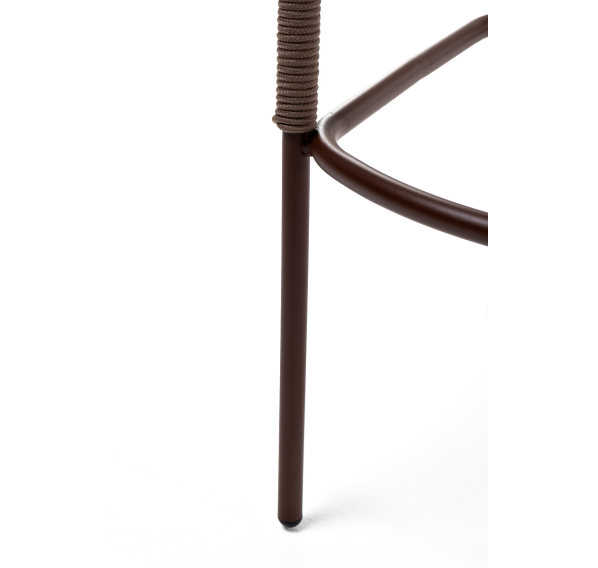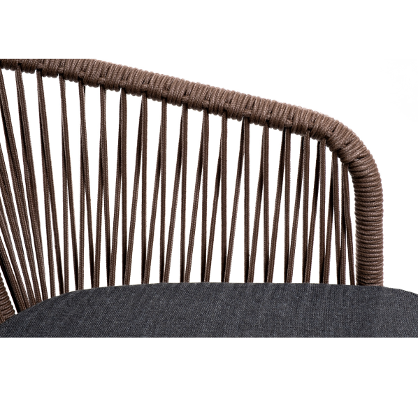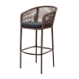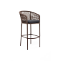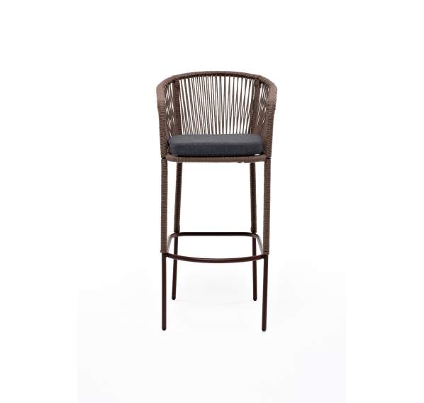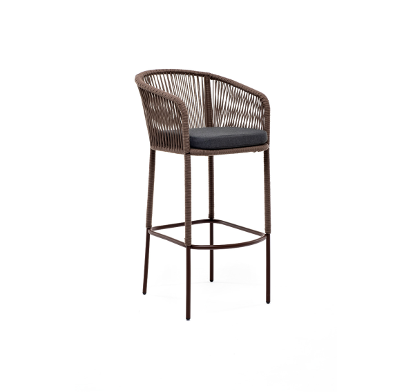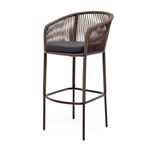 Барный стул «Марсель» представлен в стальном каркасе коричневого (RAL8016) цвета, оплетен вручную эластичными синтетическими лентами из высокопрочных полиэфирных волокон, коричневого оттенка, размер стула: 590×510×1070 мм.