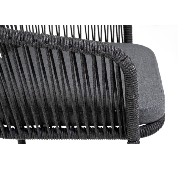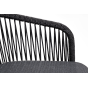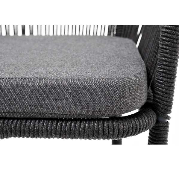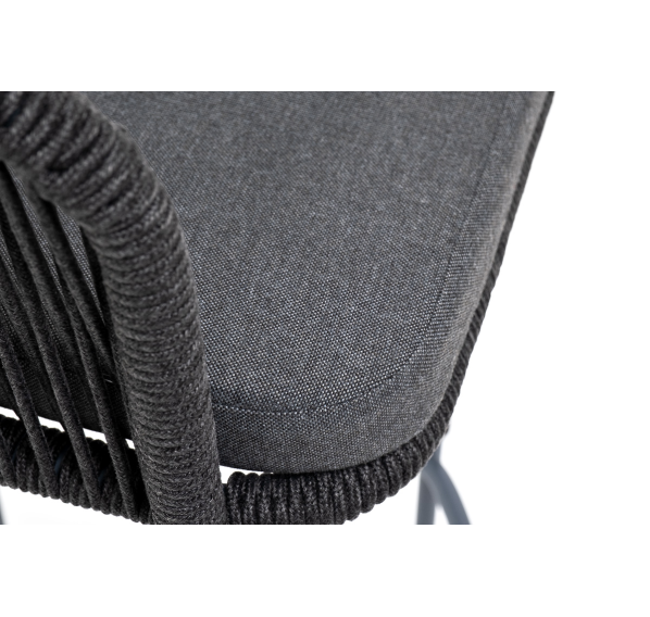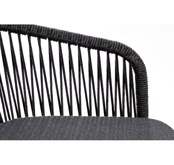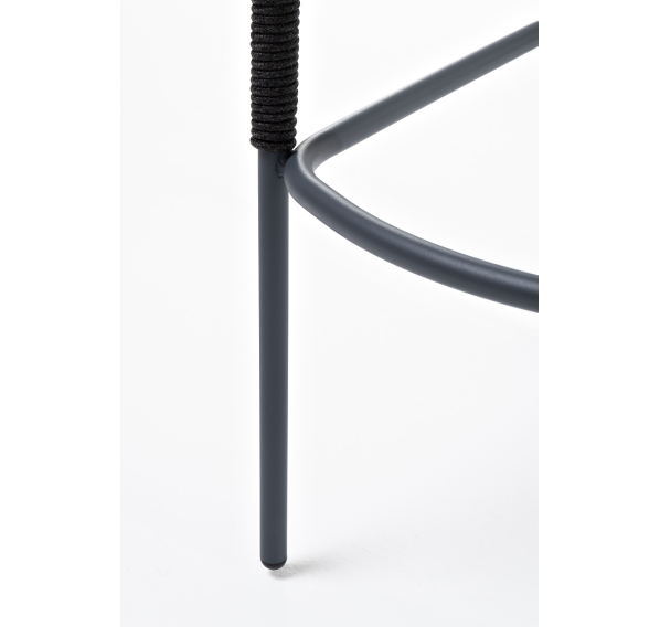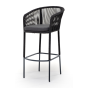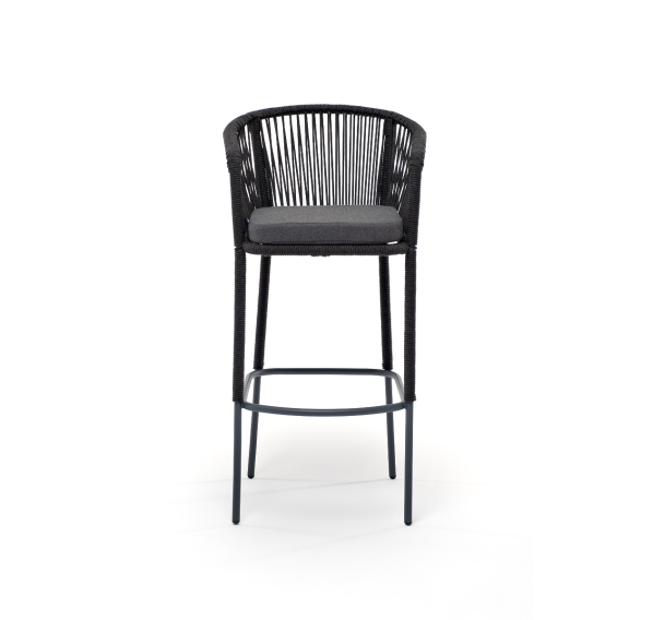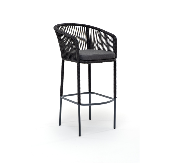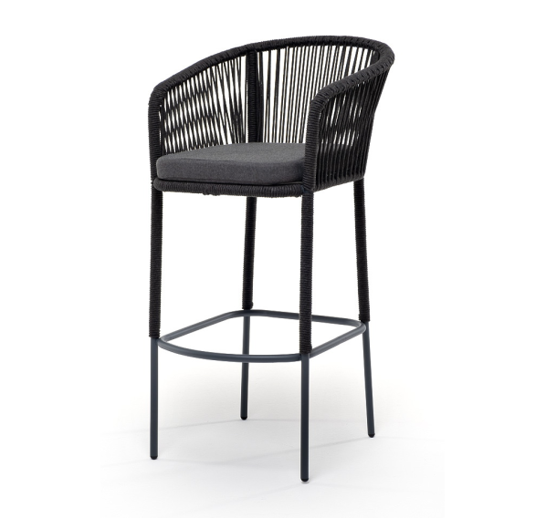 Барный стул «Марсель» представлен в стальном каркасе серого (RAL7022) цвета, оплетен вручную эластичными синтетическими лентами из высокопрочных полиэфирных волокон, темно-серого оттенка, размер стула: 590×510×1070 мм. Высота сидения без подушки – 730 мм.