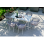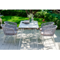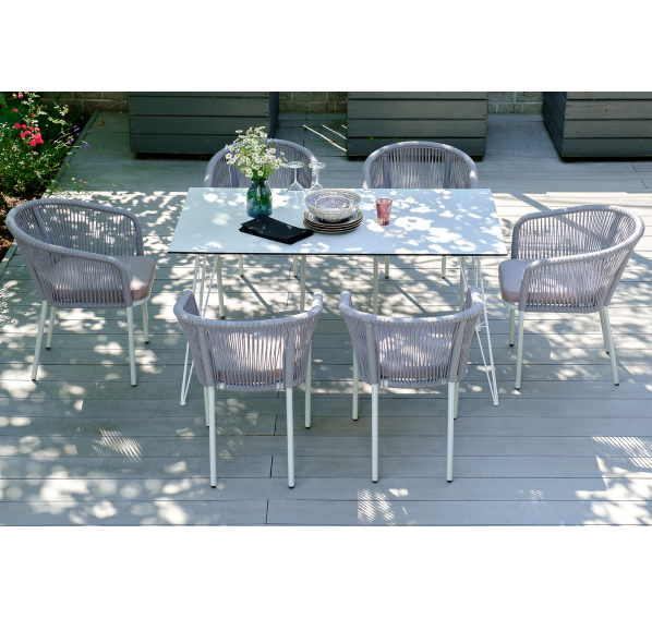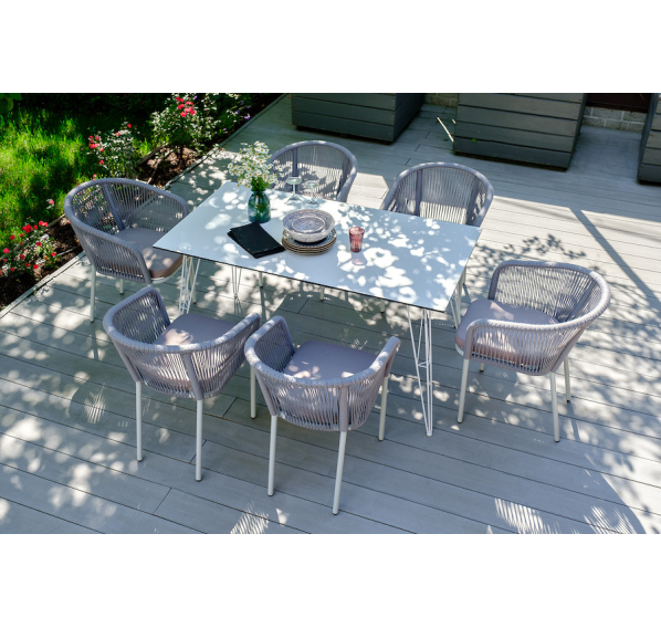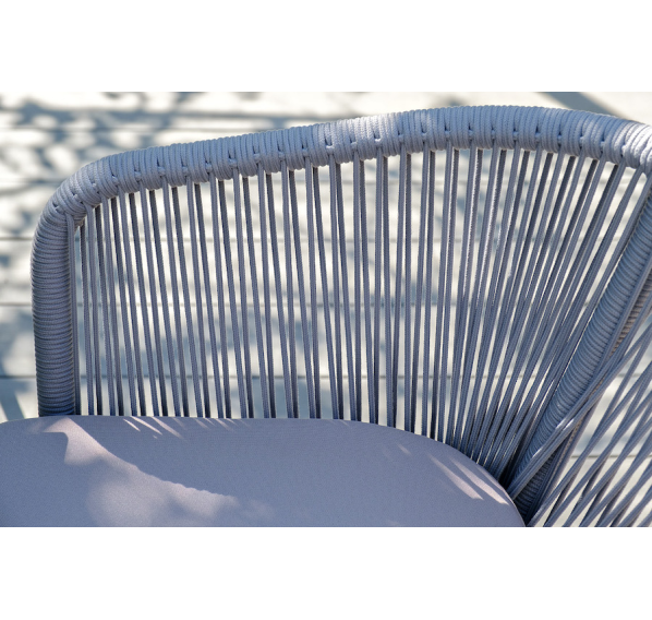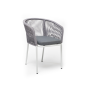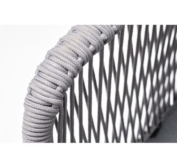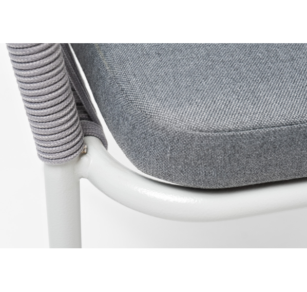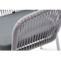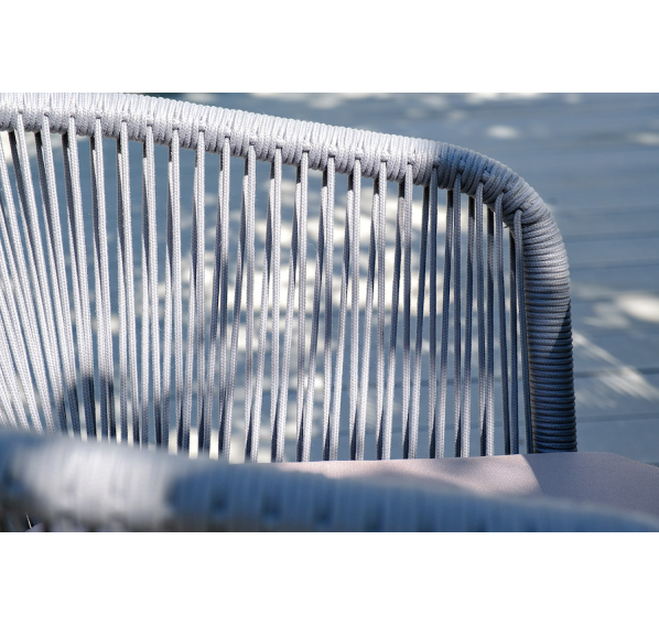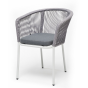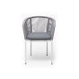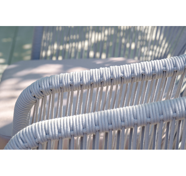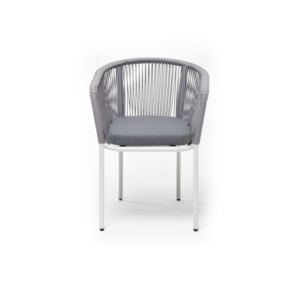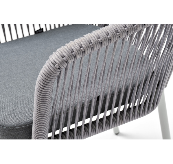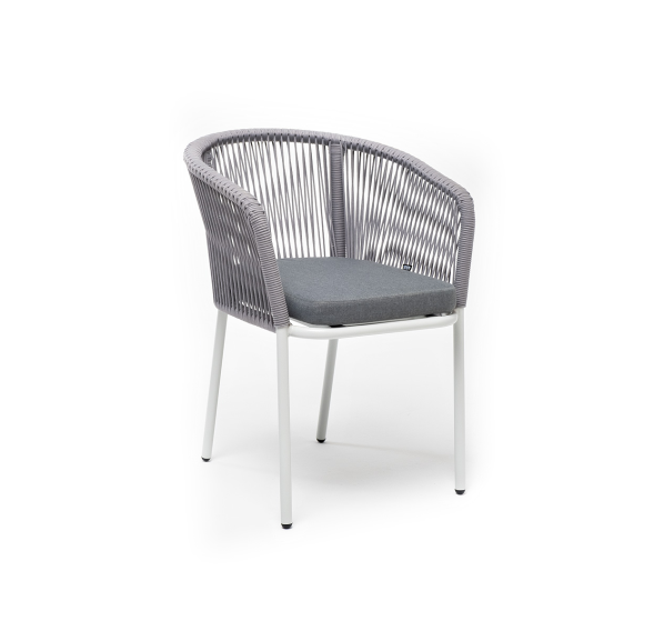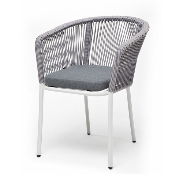 Плетеный стул из коллекции «Марсель» представлен в светлых тонах. Каркас из прочного алюминия окрашен порошковой краской в белый цвет, ручная оплетка - роуп светло-серого оттенка.