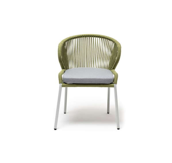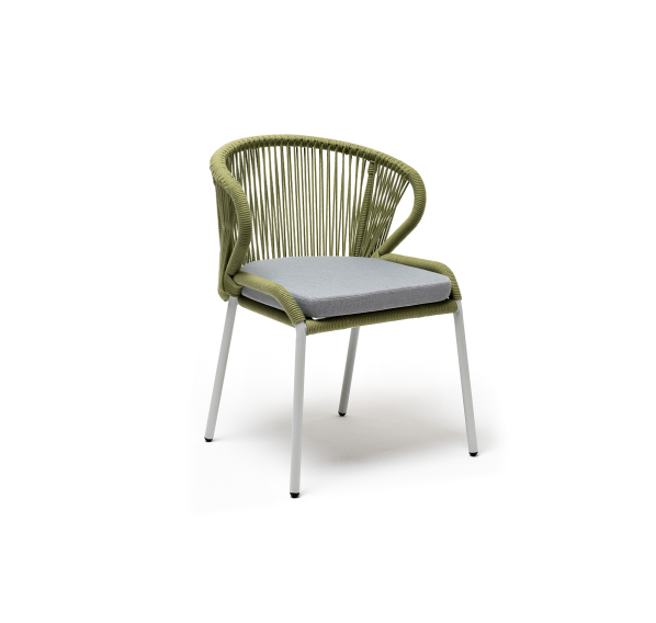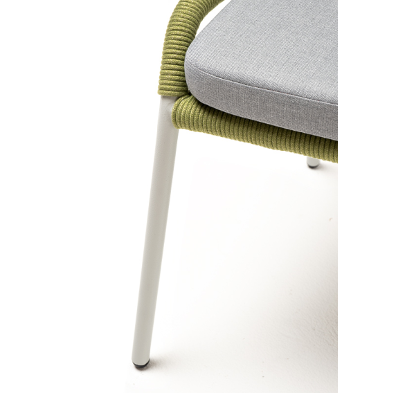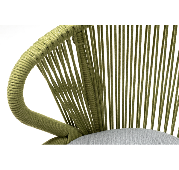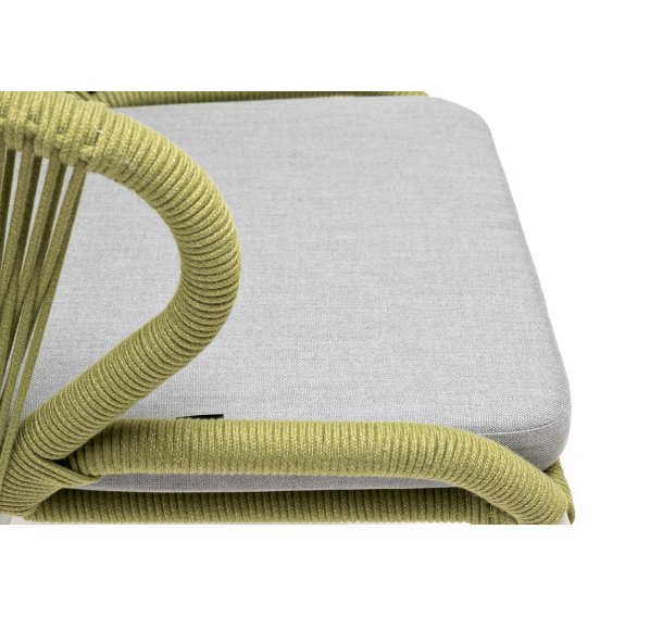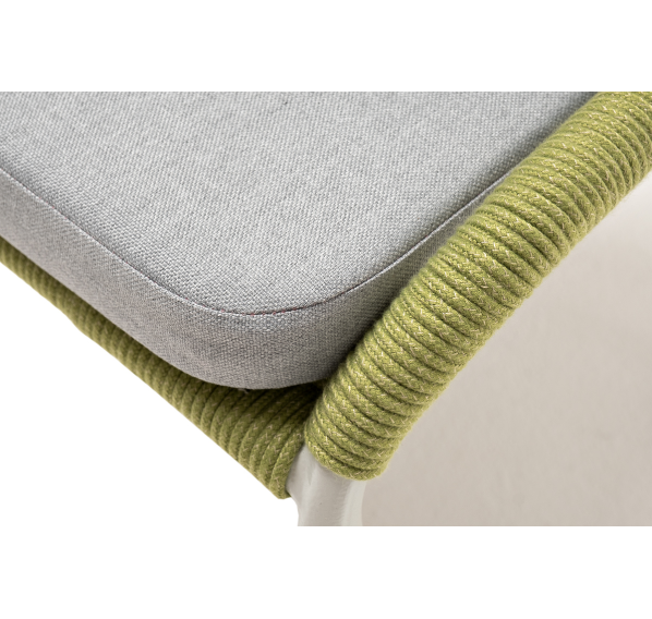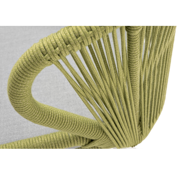 Изготовлен из алюминиевого каркаса, оплетенного вручную эластичными синтетическими лентами из высокопрочных полиэфирных волокон (роуп круглый). Цвет каркаса - светло-серый (RAL7035), оплетки - салатовый меланж.