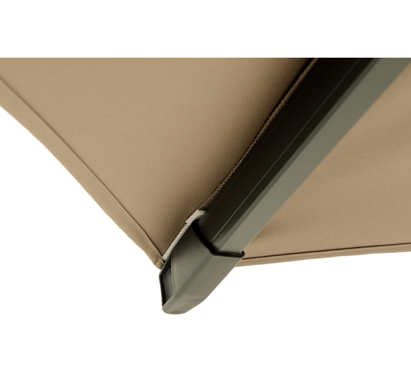 Тент уличного зонта изготовлен из прочного 100% полиэстера с водоотталкивающей пропиткой, что гарантирует защиту не только от солнца, но и осадков в виде дождя.
