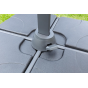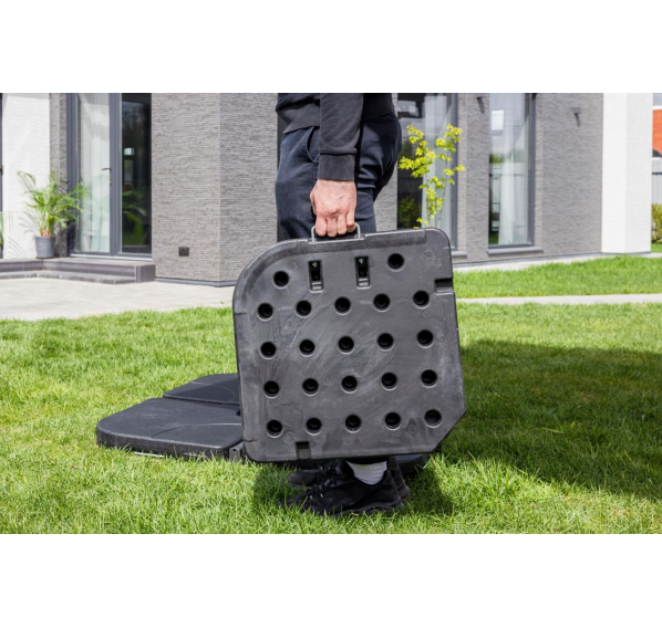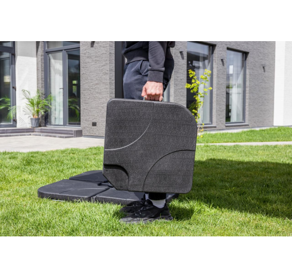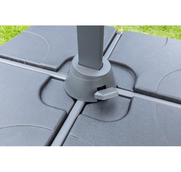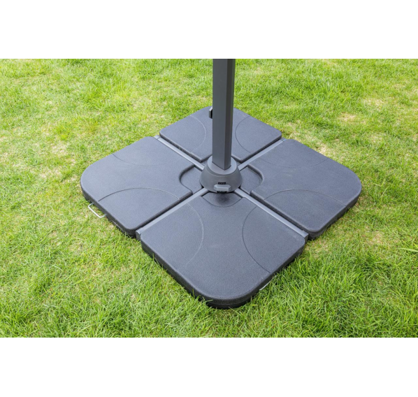 Квадратный уличный зонт SKY BLACK в чёрном цвете. Этот зонт имеет алюминиевую ногу и основание из плит, выполненных из высококачественного пластика, заполненного изнутри бетоном, что обеспечивает надёжную устойчивость даже в ветреную погоду.